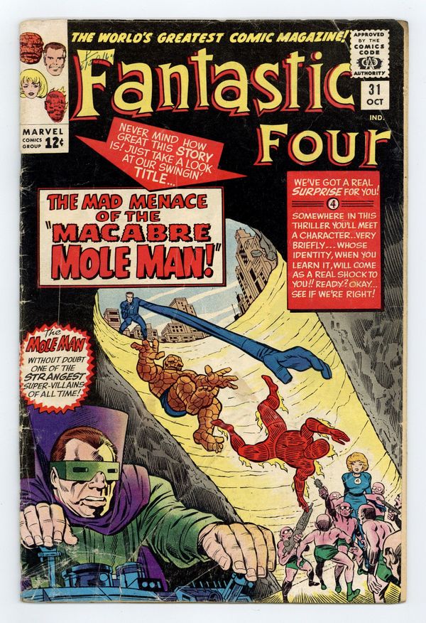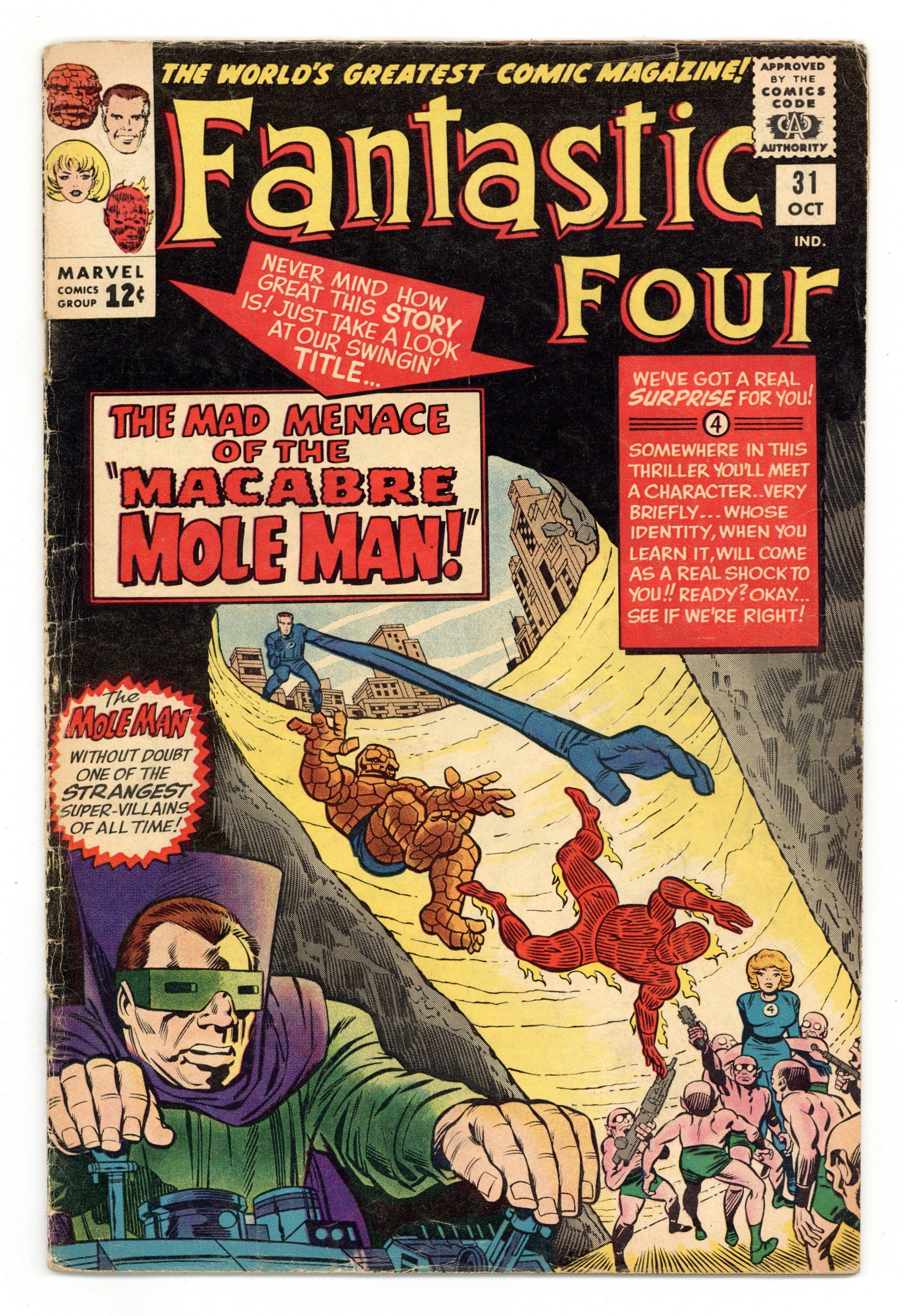 Cover pencils by Jack Kirby, inks by Chic Stone. The Mad Menace of the Macabre Mole Man!, script by Stan Lee, pencils by Jack Kirby, inks by Chic Stone; Mole Man lowers blocks of New York City into his realm; Sue is injured in the ensuing battle and can only be saved by a surgery performed by her escaped felon father. 36 pgs. $0.12. Cover price $0.12.