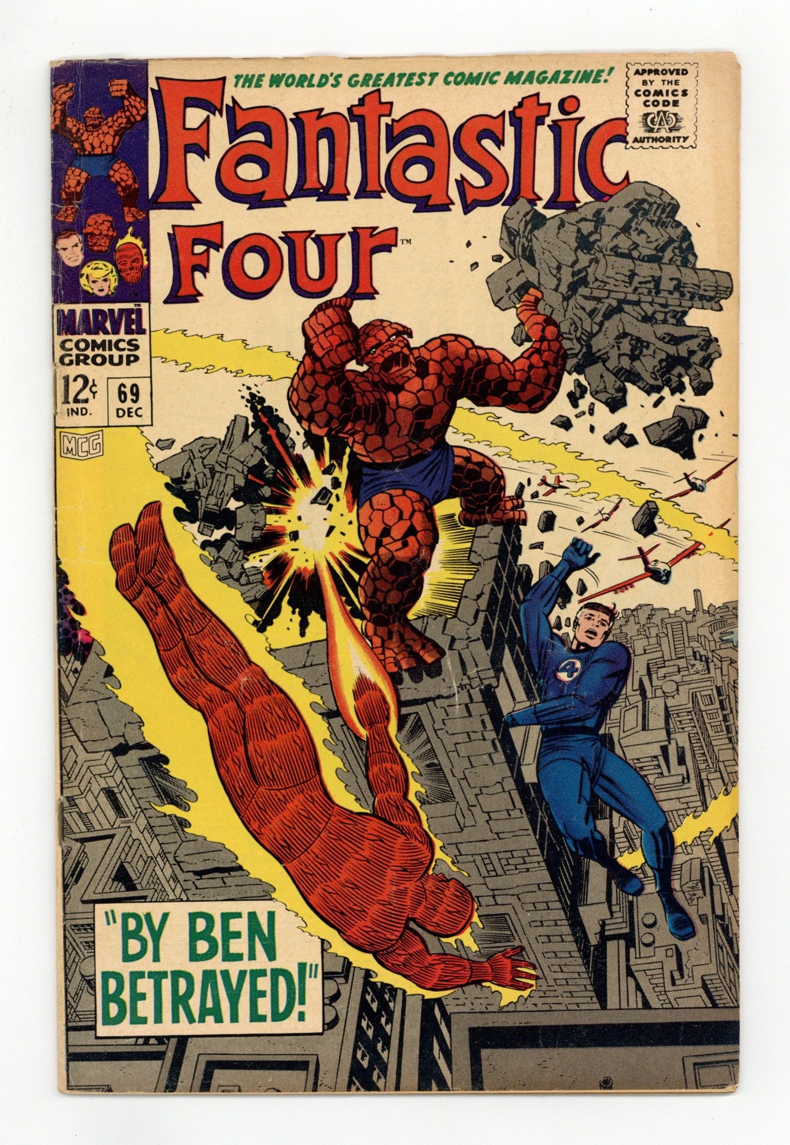 Cover pencils by Jack Kirby, inks by Joe Sinnott. By Ben Betrayed!, script by Stan Lee and Jack Kirby (co-plot), pencils by Jack Kirby, inks by Joe Sinnott; Ben is driven mad by the treatments of Dr. Santini, revealed to be the Mad Thinker, and attacks the rest of the FF. Crystal (of the Inhumans) appearance. 36 pgs. $0.12. Cover price $0.12.