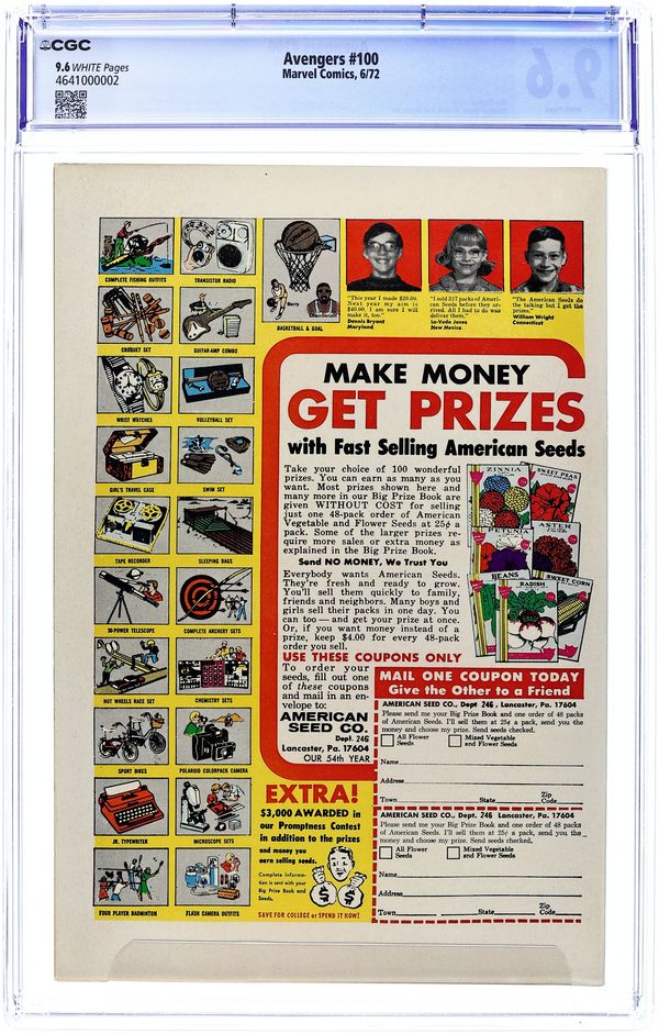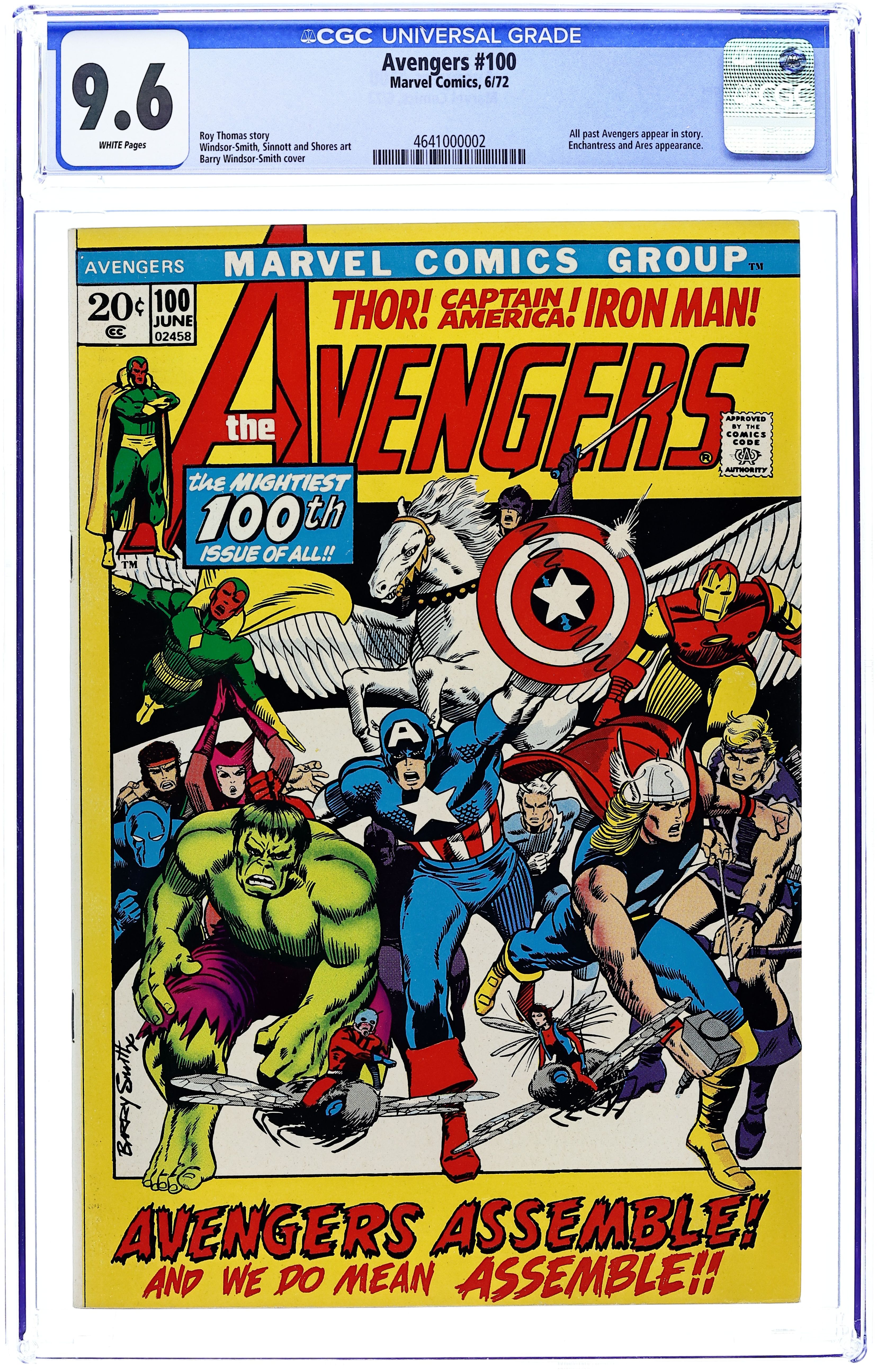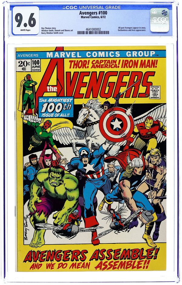 Cover by Barry Windsor-Smith. This landmark 100th issue features everyone who has previously been an Avenger. "Whatever Gods There Be!", script by Roy Thomas, pencils by Barry Windsor-Smith, inks by Windsor-Smith (pages 1-6, 12), Joe Sinnott (pages 7-11, 13, 14) and Syd Shores (pages 15-23); Bringing warning of impending doom, an amnesiac Hercules is captured by Ares, prompting the Avengers to call out for aid from all their members, past and present. Traveling to the Black Knight's castle for aid, all the members arrive, including the Hulk who is convinced to join their fight. The group enters the Black Knight's castle where in the basement Dane summons the spirit of his ancestor, the original Black Knight, who reveals to them the chain of events that brought all of them together; The group splits in two, one group remaining on Earth to battle any Olympian invaders, and the other to travel to Olympus to free Hercules and stop Ares. Avengers roll call: Thor, Captain America, Iron Man, Hawkeye, Quicksilver, the Scarlet Witch, and the Vision. Guest starring the Hulk, Ant-Man, the Black Knight, the Black Panther, Hercules, and the Swordsman. 36 pgs., full color. $0.20. Cover price $0.20.