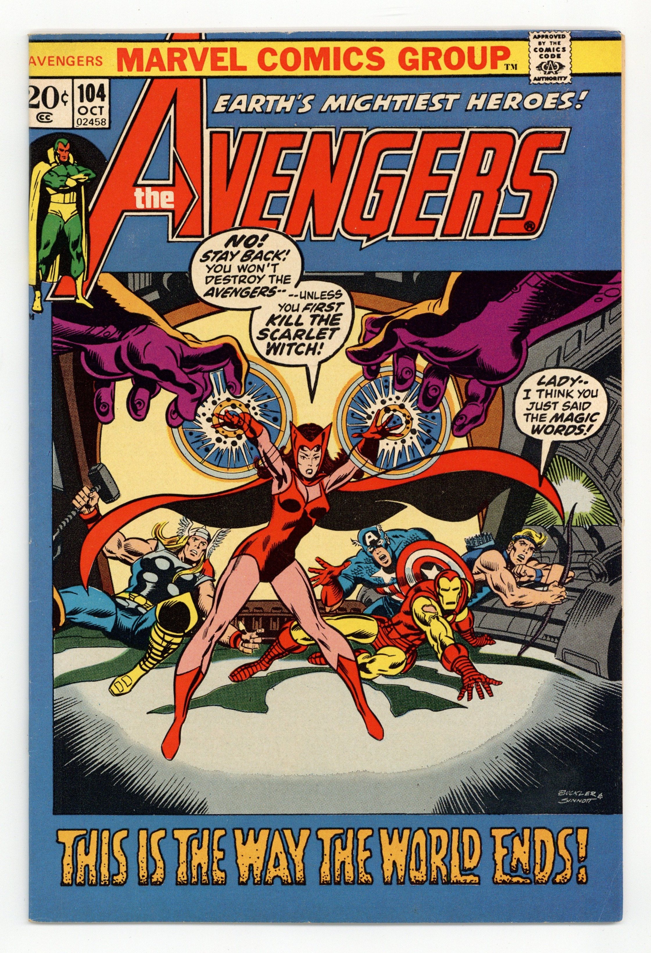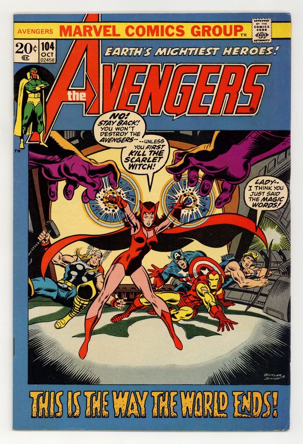 "With a Bang and a Whimper!" Part 3 of 3. Script by Roy Thomas. Pencils by Rich Buckler. Inks by Joe Sinnott. Cover by Rich Buckler and Joe Sinnott. This is it! Everything is on the line in the land down under! Earth's Mightiest Heroes go for broke to rescue the Scarlet Witch and save the world! But an army of sinister Sentinels stands in their way! Will the power of Captain America, Hawkeye, Iron Man, Thor, and the Vision be enough to defeat the mutant-hunting robots? Or can Quicksilver and Larry Trask find a way to victory? Avengers Assemble! A terrific three-part story! Final appearance of Larry Trask. Behind the scenes appearances by Crystal and Lockjaw. Flashback cameo by Dr. Peter Corbeau. (Notes: Quicksilver appears next in Fantastic Four 131. The Sentinels return in Uncanny X-men 98. The Avengers travel to the Australian anthill again in West Coast Avengers Annual 1. The X-Men visit the anthill in Marvel Super-Heroes (2nd series) 6. This issue concludes Roy Thomas' sensational five-and-a-half-year run as the writer of the Avengers series. Thomas' stories through the silver and bronze ages made the avengers into...The Avengers! He created or co-created many all-time fan favorite characters including the Vision, Ultron, and the Grim Reaper and did so with great attention to the continuity of the Marvel universe. The letters page includes a farewell essay from Roy Thomas and also a letter from comics writer Mike Barr.) 36 pages Cover price $0.20.