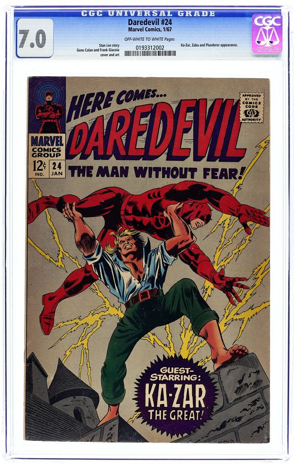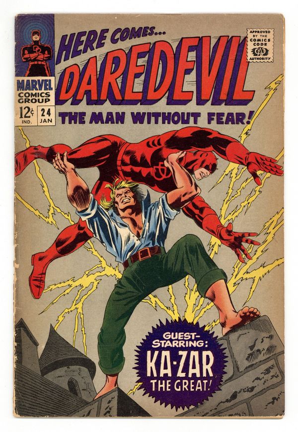 Cover pencils by Gene Colan, inks by Frank Giacoia. The Mystery of the Midnight Stalker, script by Stan Lee, pencils by Gene Colan, inks by Frank Giacoia; DD makes his way to England where he finds that Ka-Zar is accused of being the Midnight Stalker; DD realizes that The Plunderer is trying to frame his brother, and the dynamic duo track him down; In a last panel shocker, Karen opens a letter to Matt from Spider-Man stating that the Web-Slinger knows that he and DD are one and the same. 36 pgs. Cover price $0.12. Cover price $0.12.