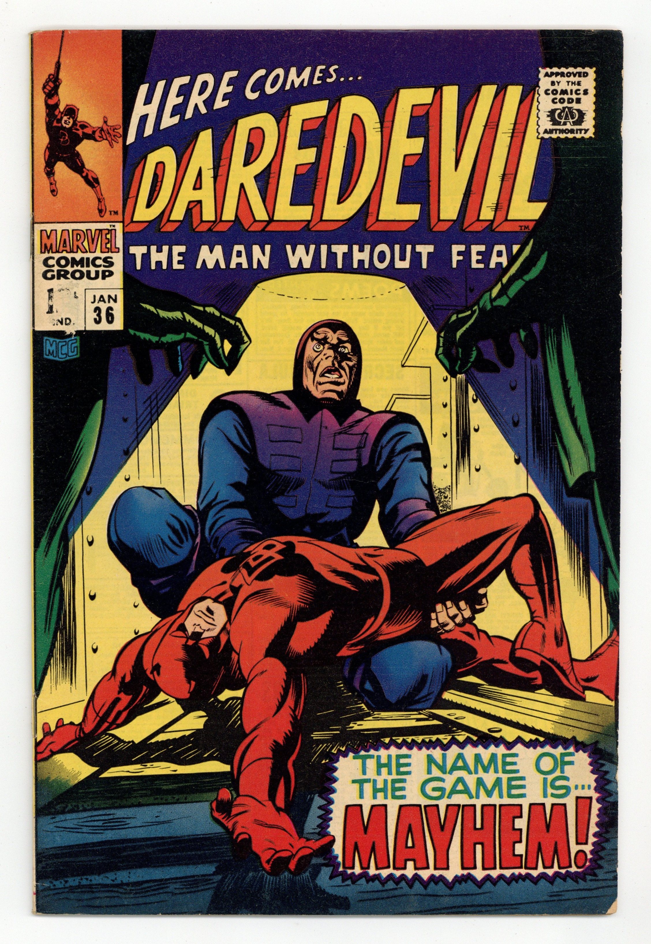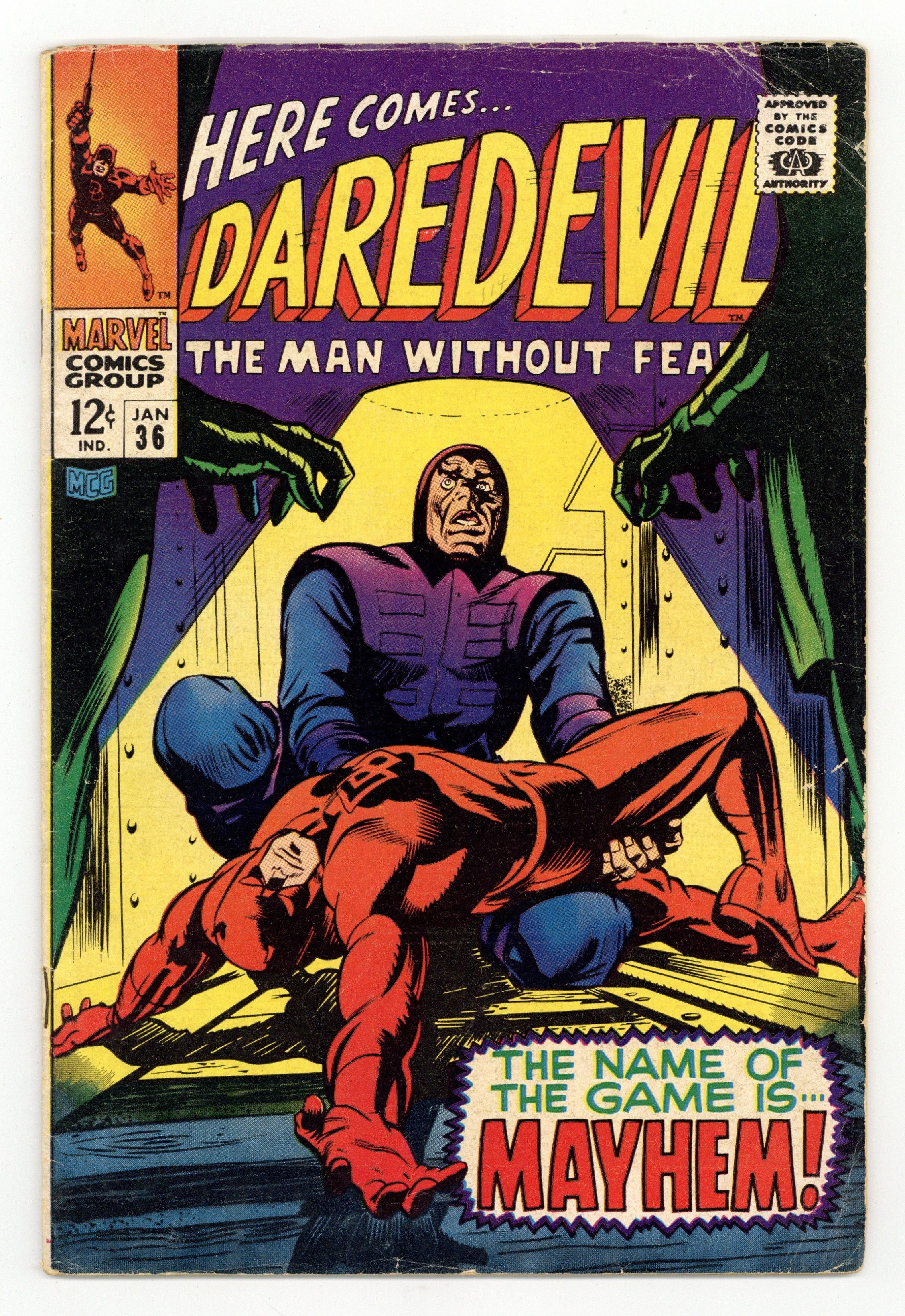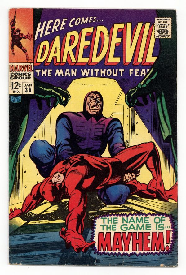 Tags: Marvel Legacy Numbering: Daredevil (part 36), Daredevil$16.50Cover pencils by Gene Colan, inks by Paul Reinman. The Name of the Game Is Mayhem!, script by Stan Lee, pencils by Gene Colan, inks by Frank Giacoia; DD saves the Invisible Girl from the Trapster, but in the ensuing battle, hurts his back as he takes down the villain; Foggy is asked to run for District Attorney; Debbie Harris is paroled from prison and contacts Foggy; Dr. Doom shows up. Cover price $0.12.