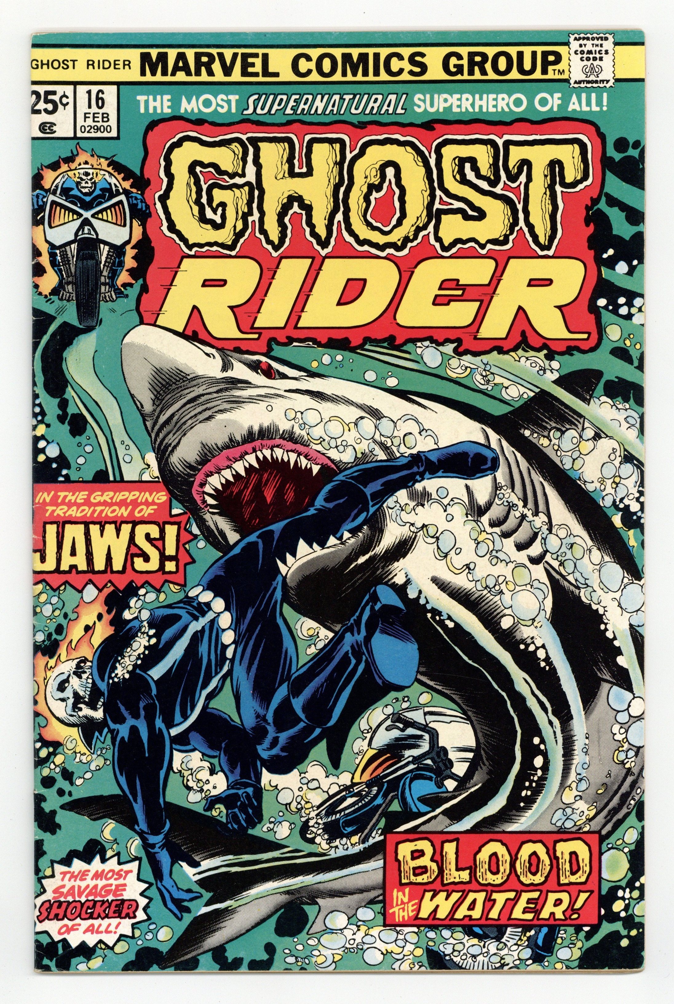 Tags: Ghost Rider$18.75"Blood in the Waters!" Story by Bill Mantlo. Art by George Tuska and Vince Colletta. Cover by Bob Brown and Dave Cockrum. A boating accident sets the Spirit of Vengeance against the deadliest creature to ever swim in the ocean - the Great White Shark! 32 pages, FC. NOTE: The letters page also contains Marvel Value Stamp series B #3: the Human Torch. Spider-Man stars in a one-page Hostess ad, "The Kidnap Caper." And a letter to the editor from David Lynch (no, no, not the film director). Cover price $0.25.