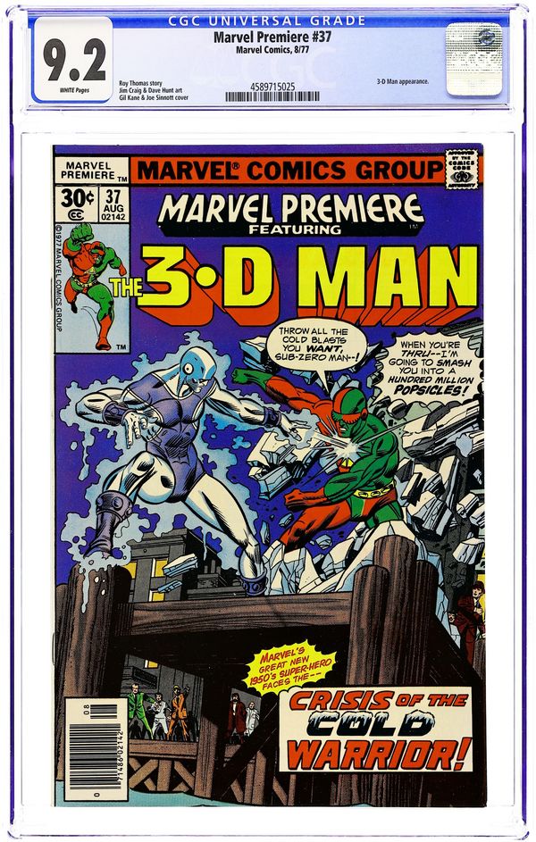 Code-Name: The Cold Warrior! - Written by Roy Thomas & Don Glut. Art by Jim Craig & Dave Hunt. Cover by Gil Kane & Joe Sinnott. Featuring the 3-D Man! Marvel's great new 1950's super-hero faces the crisis of the Cold Warrior! And the sub-zero man can throw all the cold blasts he wants, 'cause when he's through...the 3-D Man's going to smash him into a hundred million popsicles! Also starring Zirksu, Vince Rivers and Richard Nixon. 32 pages, full color. Cover price $0.30.