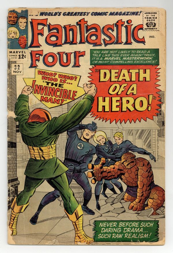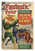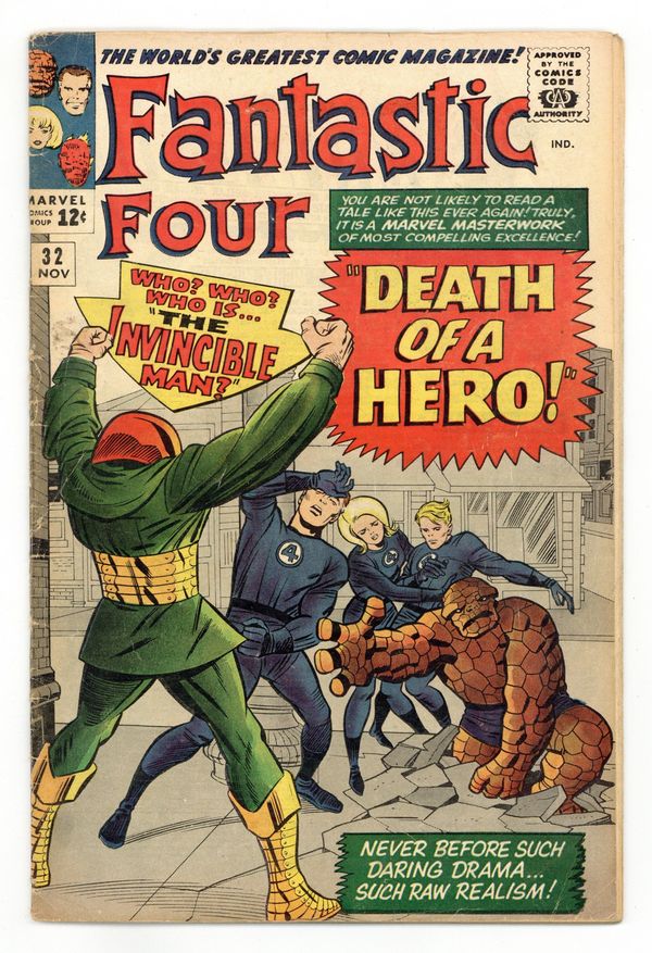 Tags: Fantastic Four$35.50Cover pencils by Jack Kirby, inks by Chic Stone. Death of a Hero!, script by Stan Lee, pencils by Jack Kirby, inks by Chic Stone; Reed tries and fails to transform the Thing back into Ben Grim; the Super-Skrull escapes from his prison and takes the place of Franklin Richards; Franklin dies. Letter to the editor from writer and Game of Thrones creator George R.R. Martin. 36 pgs. $0.12. Cover price $0.12.