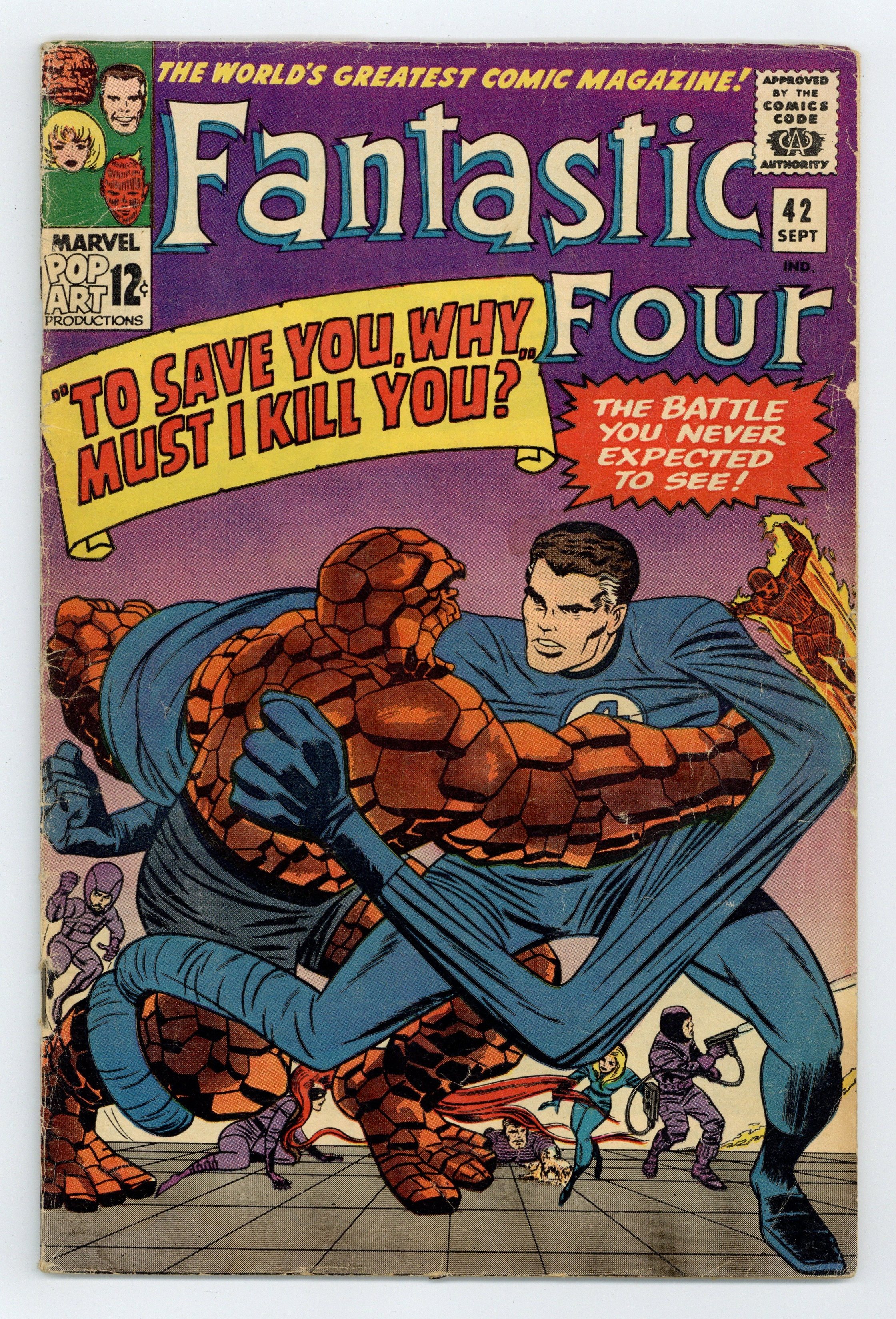 Cover pencils by Jack Kirby, inks by Sol Brodsky. To Save You, Why Must I Kill You, script by Stan Lee, pencils by Jack Kirby, inks by Vince Colletta; The Frightful Four brainwash the Torch and, together with the brainwashed Thing, pursue Reed and Sue. Letter to the editor from comics writer Don McGregor. 36 pgs. $0.12. Cover price $0.12.