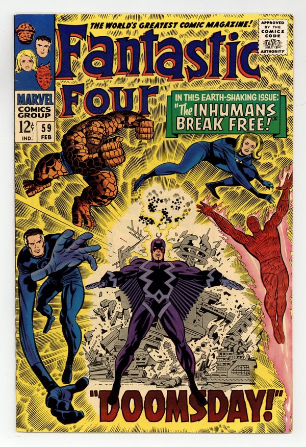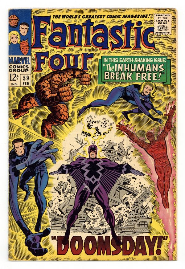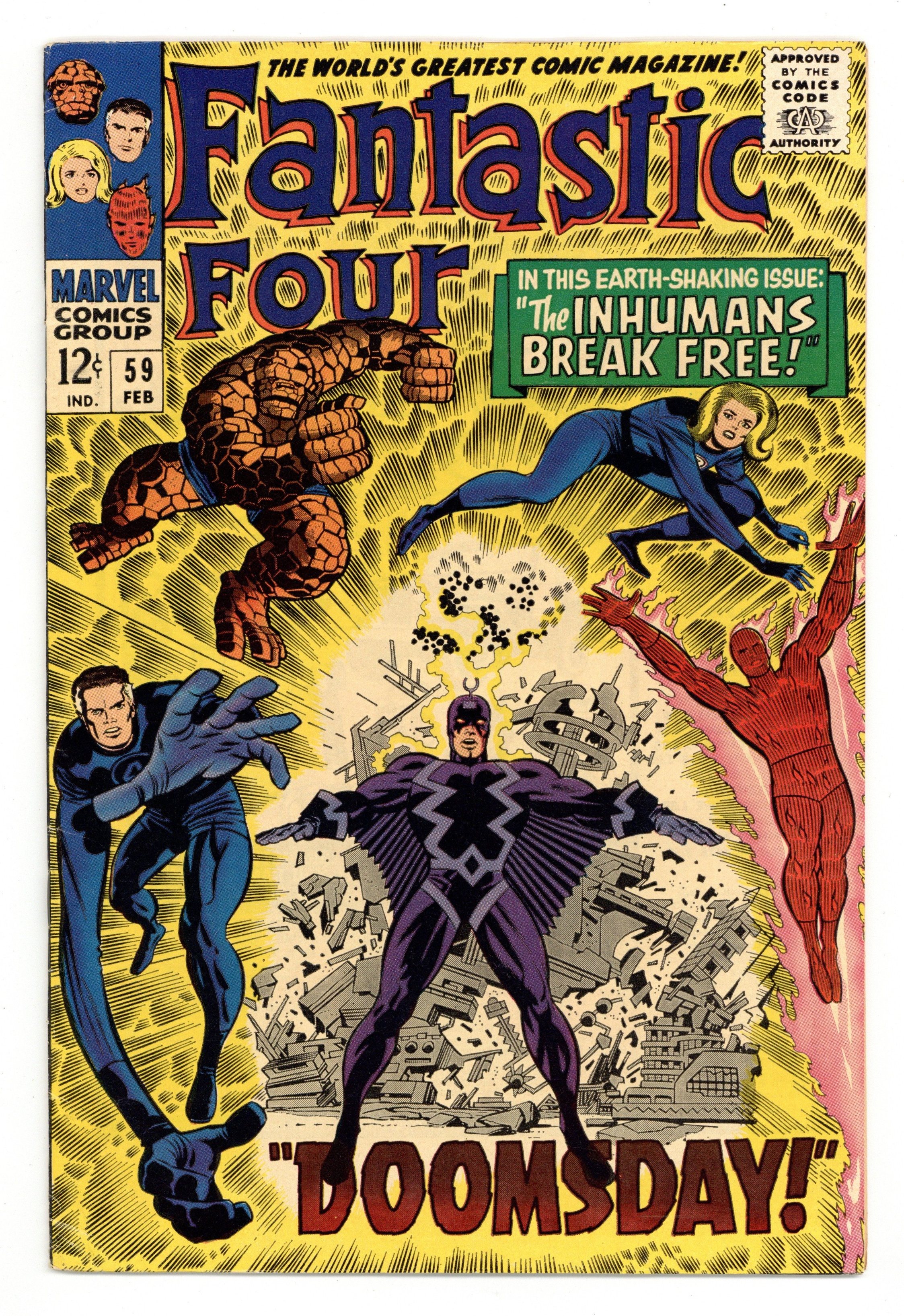 Cover pencils by Jack Kirby, inks by Joe Sinnott. Doctor Doom steals the Silver Surfer's cosmic powers (part 3 of 4) in Doomsday, script by Stan Lee and Jack Kirby (co-plot), pencils by Jack Kirby, inks by Joe Sinnott; Dr. Doom wreaks havoc across the globe with the Power Cosmic; Black Bolt destroys the barrier that was imprisoning the Inhumans. Brief Inhumans appearance. 36 pgs. $0.12. Cover price $0.12.