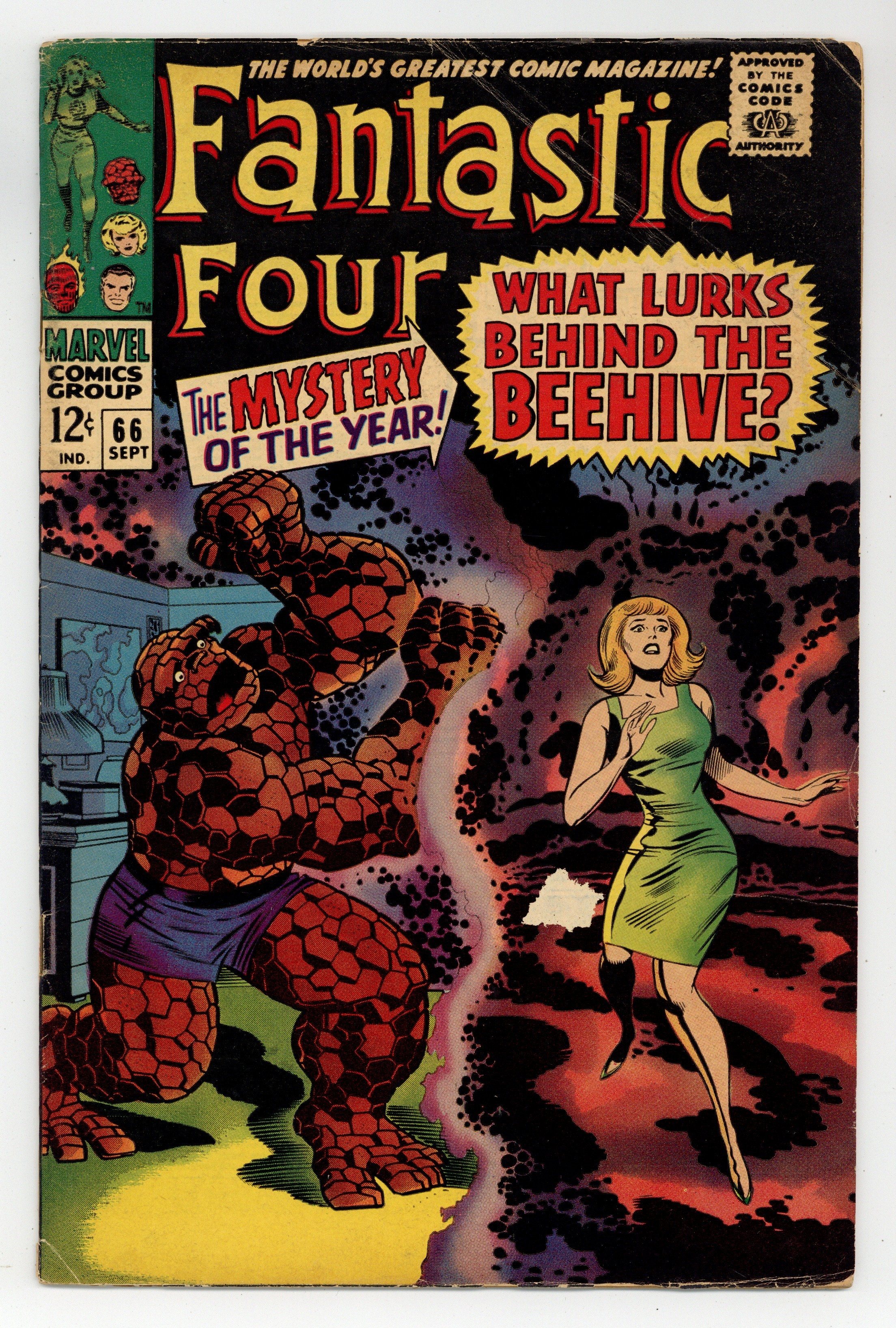 1st printing. Cover pencils by Jack Kirby, inks by Joe Sinnott. The origin of Him (Warlock), part 1 (though he does not appear in this issue) in "What Lurks Behind the Beehive?", script by Stan Lee and Jack Kirby (co-plot), pencils by Jack Kirby, inks by Joe Sinnott; The scientists of the Beehive have kidnapped Alicia Masters and the FF search for her. 36 pgs. $0.12. NOTE: 1994 JC Penney reprint exists. Can be identified by having a Stridex ad on the back cover. Cover price $0.12.