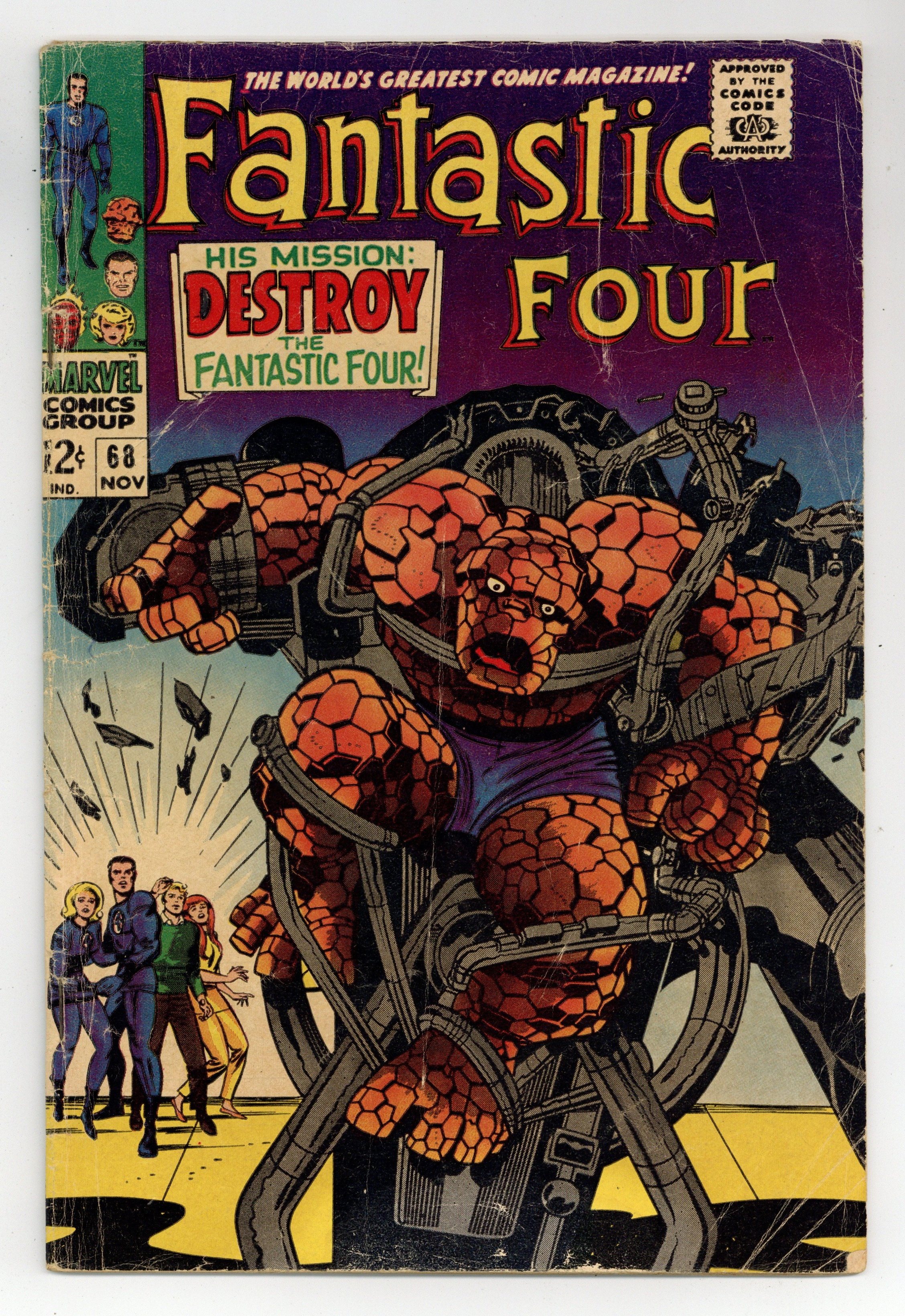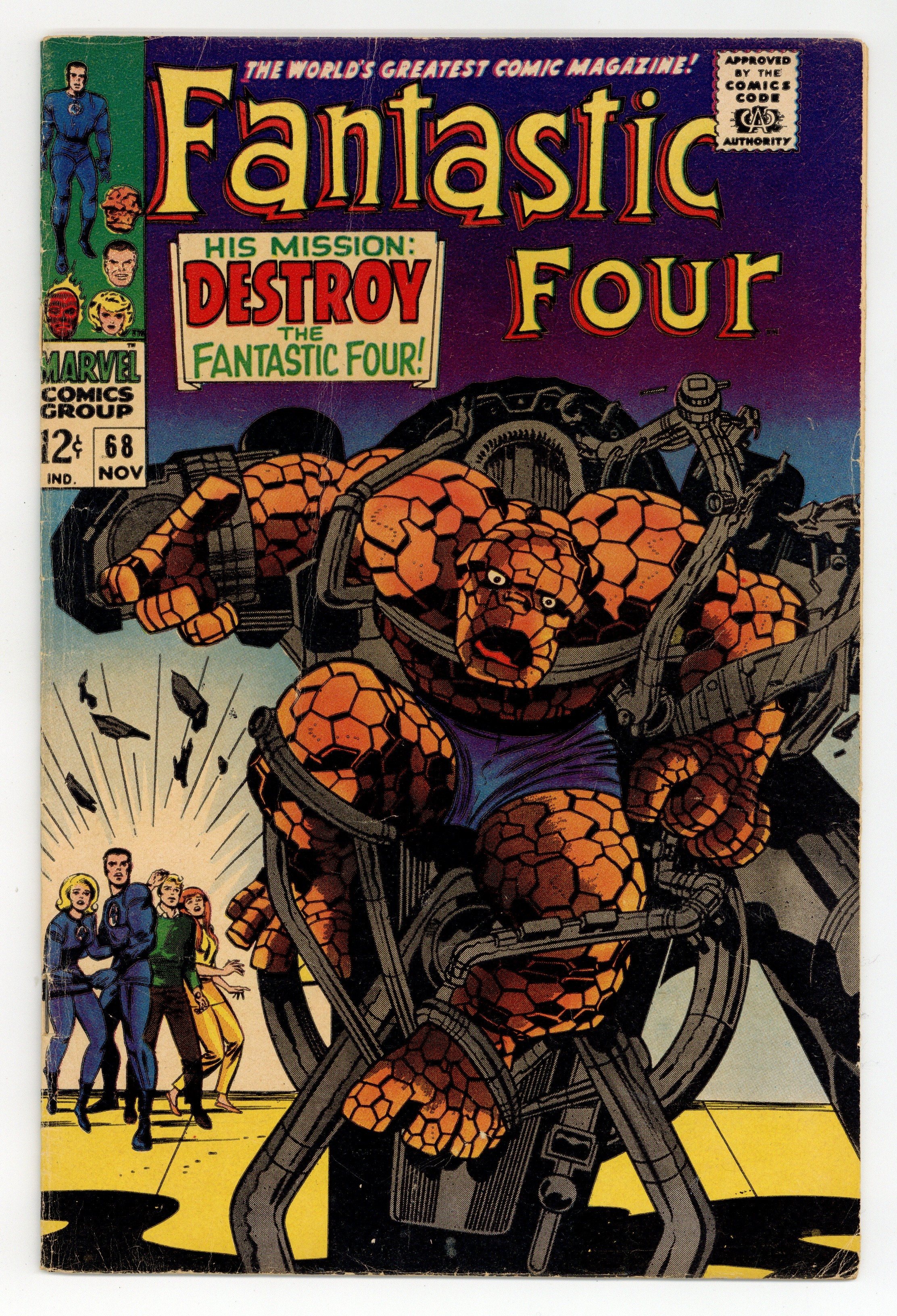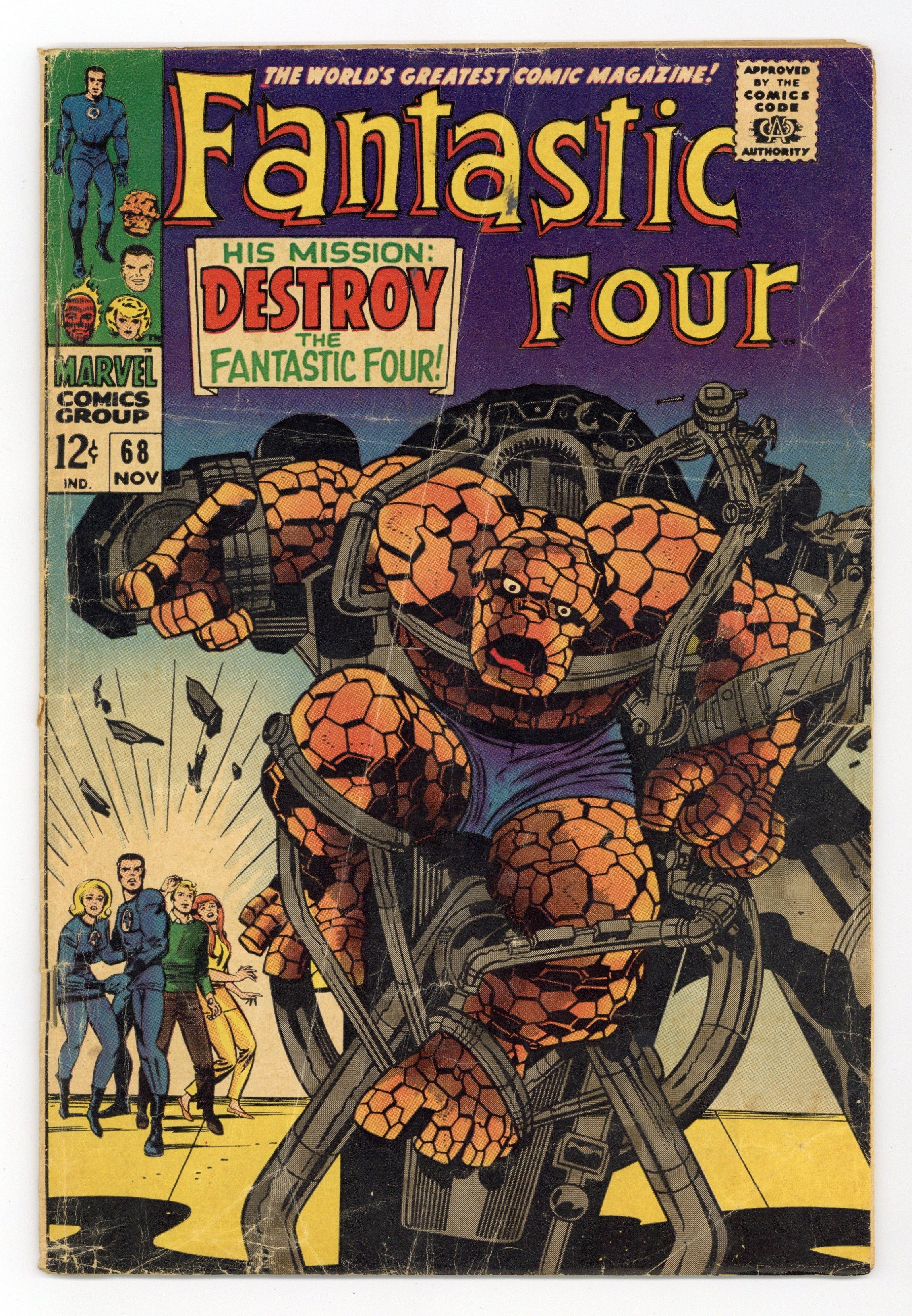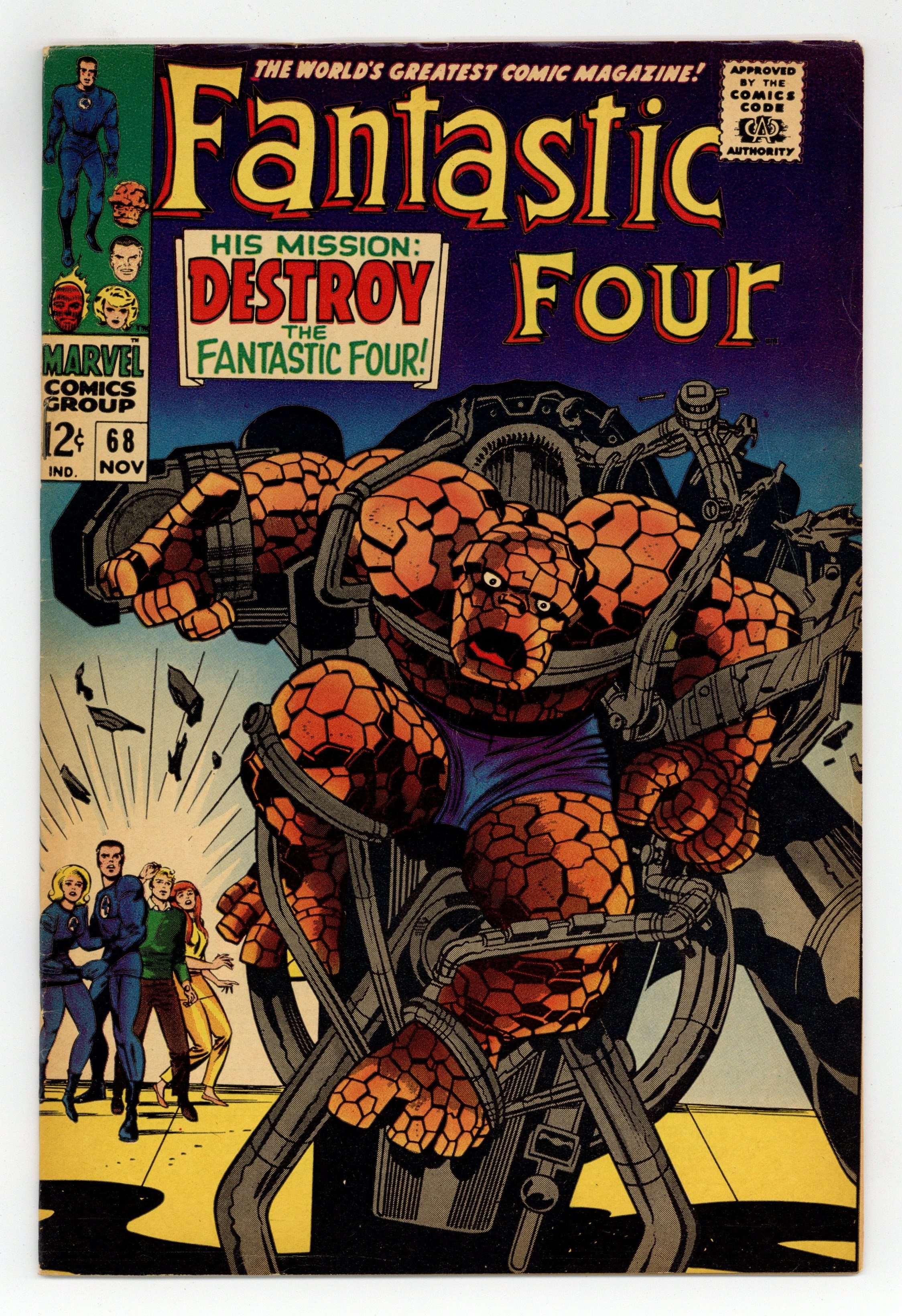 Cover pencils by Jack Kirby, inks by Joe Sinnott. His Mission: Destroy the Fantastic Four!, script by Stan Lee and Jack Kirby (co-plot), pencils by Jack Kirby, inks by Joe Sinnott; A mysterious villain, posing as the chemist Dr. Santini, aids Reed in attempting to find a cure for Ben. Crystal (of the Inhumans) appearance. 36 pgs. $0.12. Cover price $0.12.