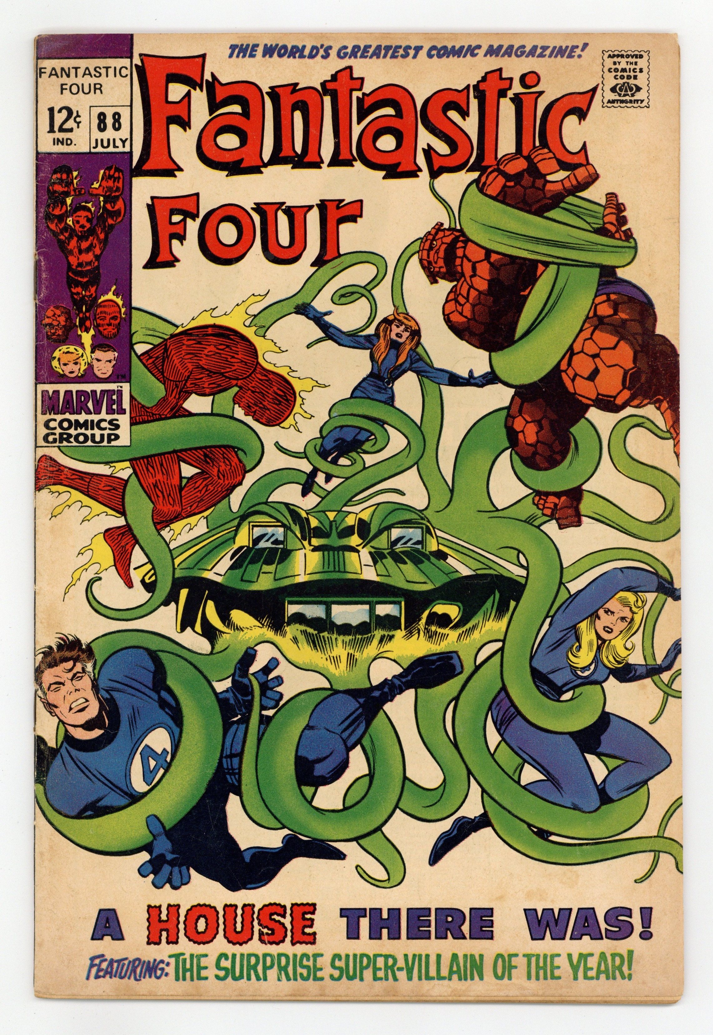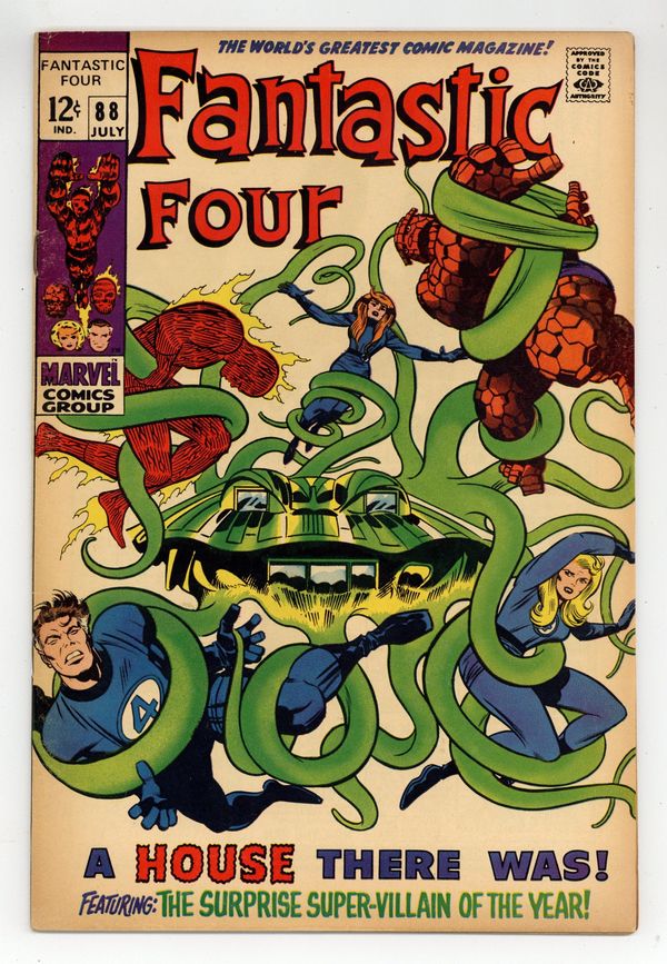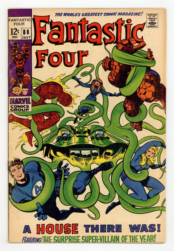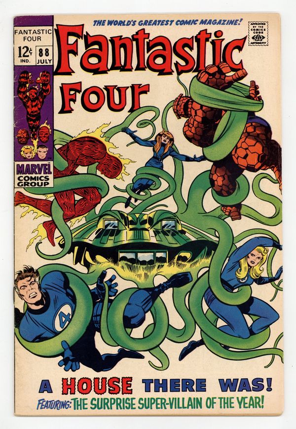 "A House There Was!" Script by Stan Lee. Pencils by Jack Kirby. Inks by Joe Sinnott. Cover by Jack Kirby and Joe Sinnott. A jubilant Fantastic Four reunite with baby Franklin and Alicia after their episode in Latveria ended last issue! Reed, Sue, Ben, Johnny, and Crystal are ready for some rest, relaxation, and house-hunting! Following a realtor's tip, the Invisible Girl leads the team to a contemporary house located in a secluded forest. Seems like a strange place for a modern house. But everything goes smooth as Reed and Sue move in and then sit down for their first meal with Johnny and Crystal. However, shortly thereafter everything goes dark! The foursome are suddenly blind! Who owns this house?! Could there be a mole inside? Or perhaps more specifically…a mole man? Last 12¢ issue. (Notes: This issue is the third appearance of (the still unnamed baby) Franklin Richards. The Mole Man previously appeared in Uncanny X-Men 34.) 36 pages Cover price $0.12.
