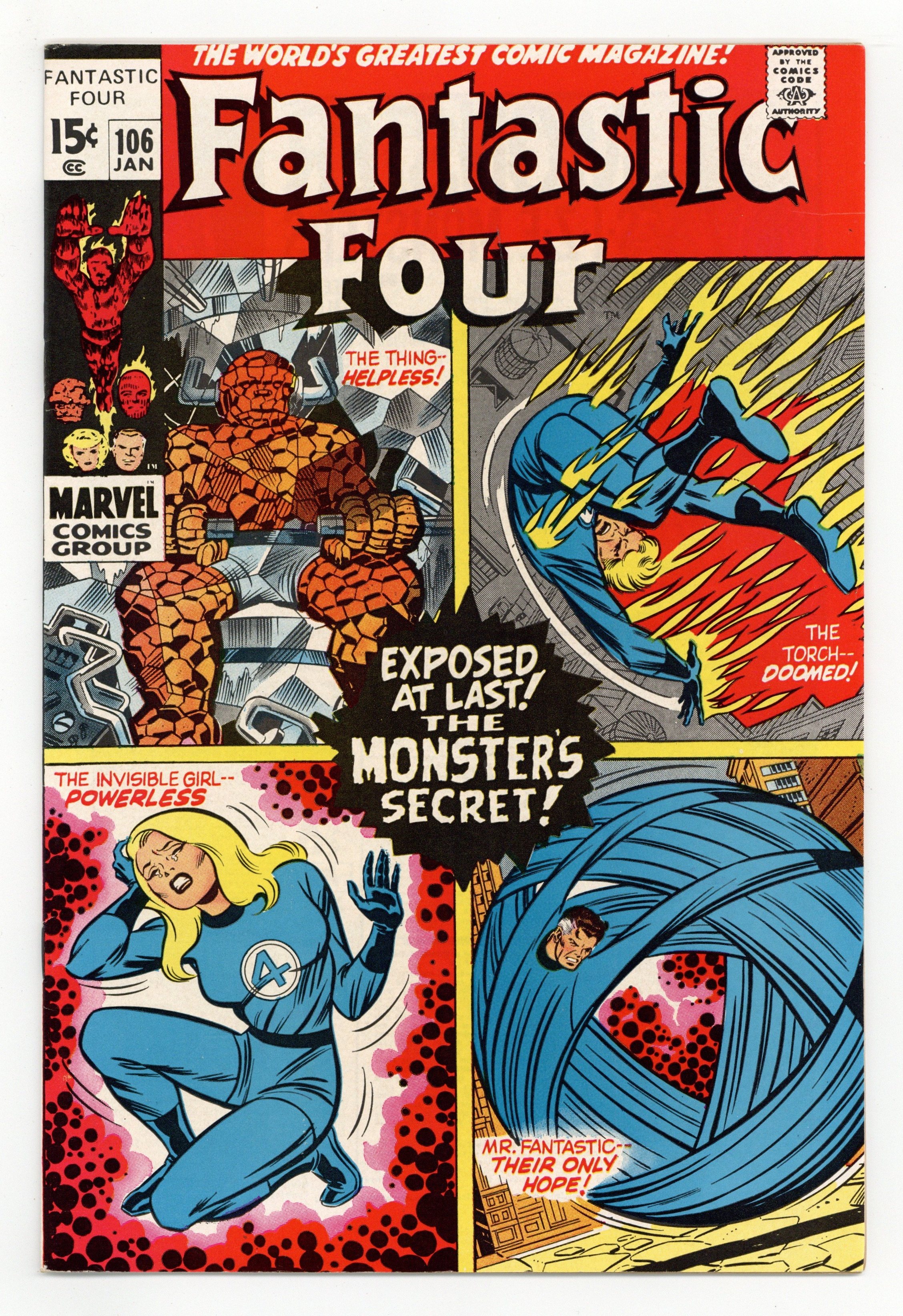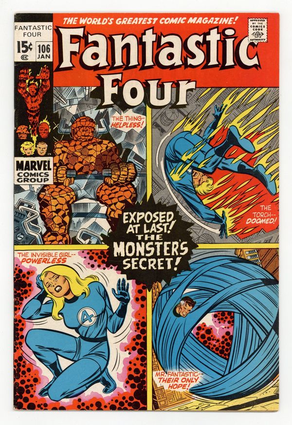 "The Monster's Secret!" Script by Stan Lee. Pencils by John Romita. Inks by Joe Sinnott. Cover by John Romita and Joe Sinnott. Mister Fantastic has a double crisis on his hands! The Invisible Girl needs help in her fight against the mysterious monster on the streets! While at the same time, Reed's experiment to change the Thing back to flesh-and-blood Ben Grimm reaches a critical stage! The leader of the FF decides to help his wife and leaves Johnny to supervise the experiment! After the Human Torch cools down the high-tech testing equipment, he joins Reed and Sue in the battle vs. the powerful energy creature (aka Larry Rambow)! But while three-fourths of the Fantastic Four are fighting in the city, what's going on back at the Baxter Building...with the unconscious Thing? 36 pages Cover price $0.15.