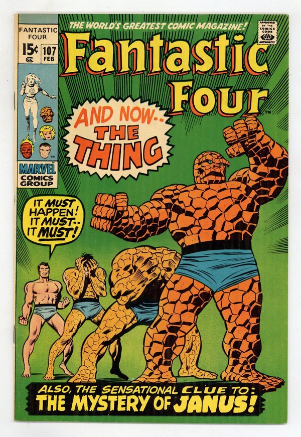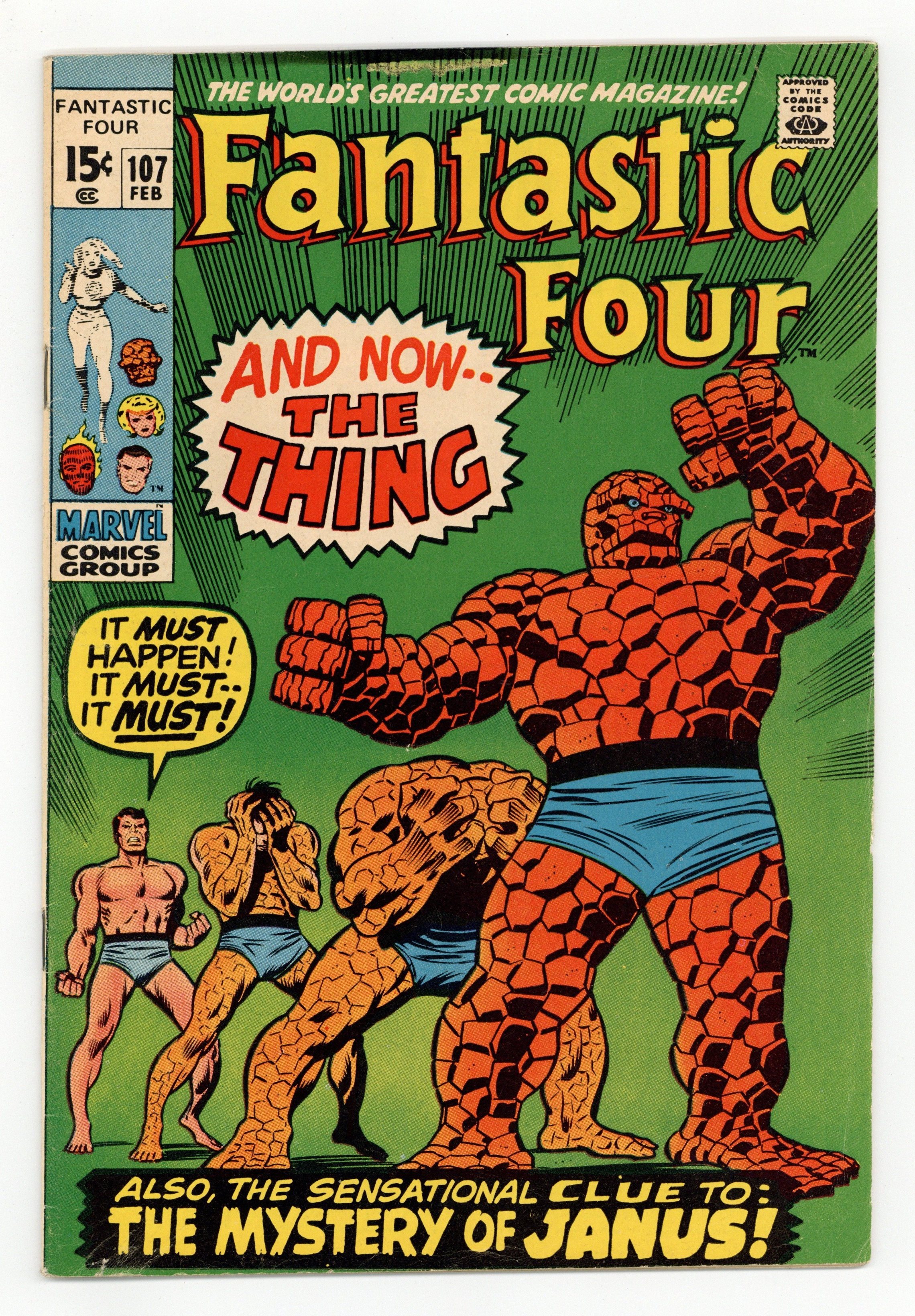 First appearance of Janus in "And Now, the Thing!" Script by Stan Lee. Pencils by John Buscema. Inks by Joe Sinnott. Cover by John Buscema and Joe Sinnott. Reed's experiment to transform the Thing back to Ben Grimm is a huge success! And now Ben can change back and forth from the Thing at anytime! What a happy day for Ben and Alicia! Meanwhile, a man called Janus visits the Baxter Building and asks his former colleague, Reed Richards, for a favor. He would like to journey into the Negative Zone. Is that really a good idea? Cameo appearances by Agatha Harkness and Franklin. Flashback cameo by Annihilus to recap the events of Fantastic Four Annual 6. 36 pages Cover price $0.15.