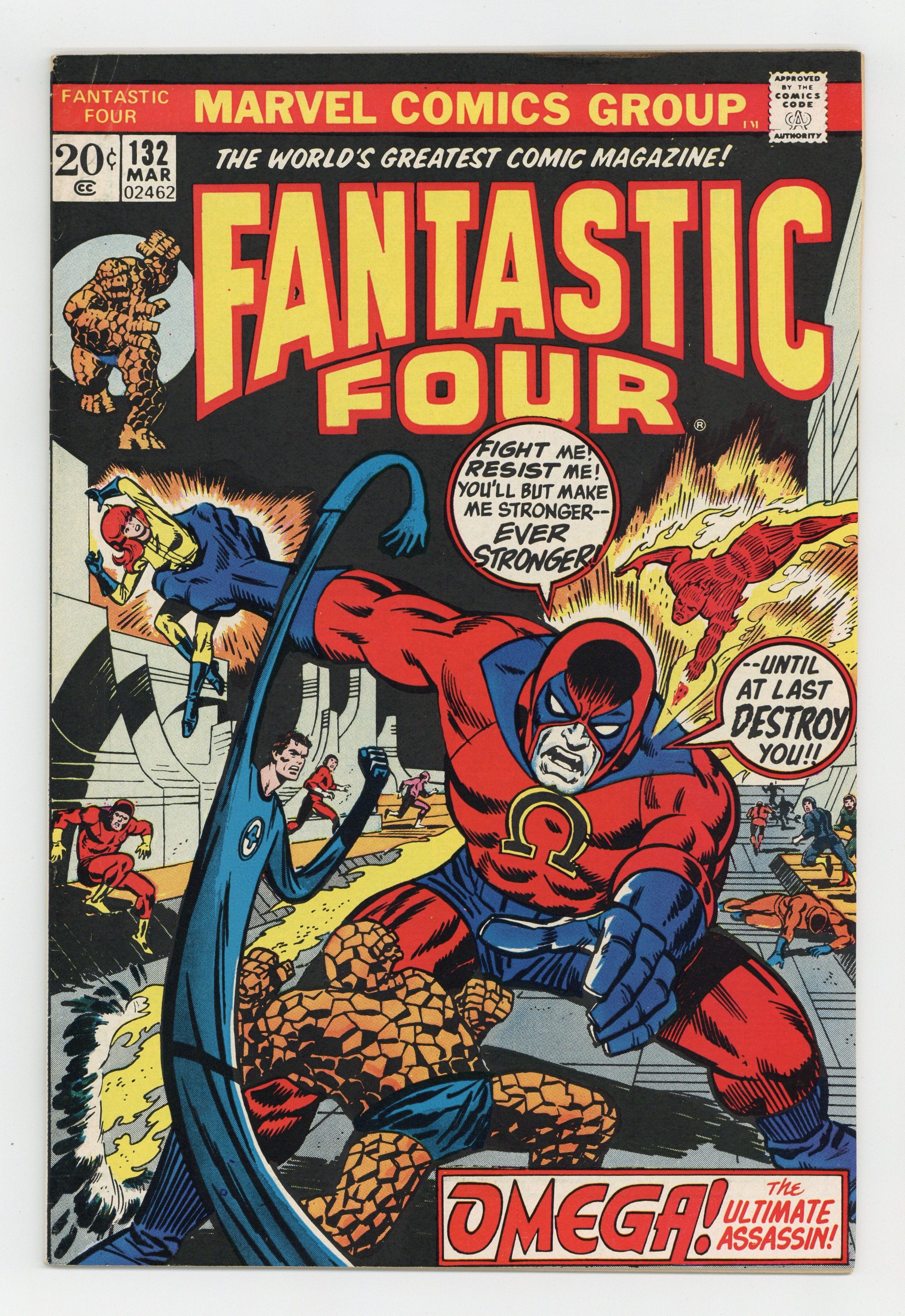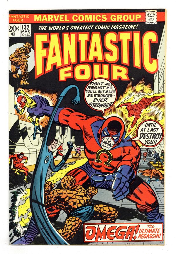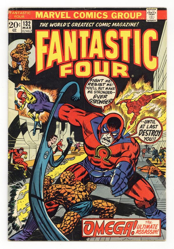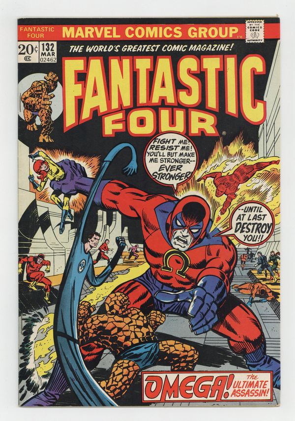$40.50"Omega! The Ultimate Enemy!" Part 2 of 2. Guest-starring Quicksilver and the Inhumans. Script by Roy Thomas. Art by John Buscema (breakdowns) and Joe Sinnott (finishes). Cover by Jim Steranko and Frank Giacoia. In the underground lair of the Alpha Primitives, the awesome Omega has seized Crystal! And now the Human Torch and Quicksilver must join forces to set her free! However, the massive android is powerful indeed! It's going to take all of the Inhumans plus Mr. Fantastic and the Thing to stop the invasion of the Alpha Primitives! Can the FF and the royal family defeat the Alphas and Omega? But even if the heroes win, Johnny Storm is still going to lose. (Notes: The Human Torch changes his costume from blue to red in this issue, and Medusa joins the Fantastic Four (through issue 159). The letters page contains a statement of ownership: average print run 457,990; average paid circulation 245,695.) 36 pages Cover price $0.20.