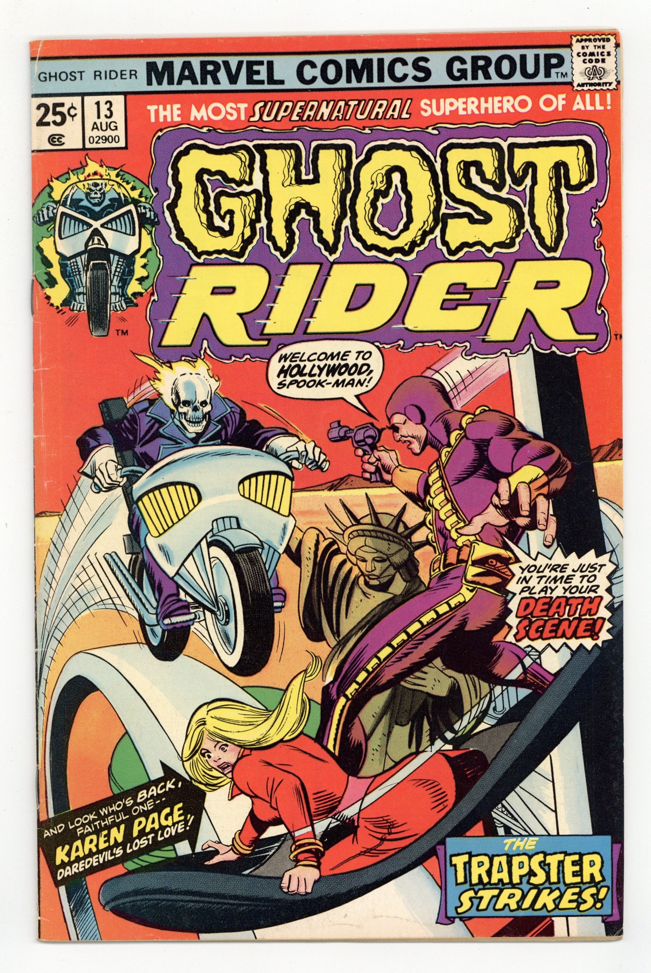 Tags: Ghost Rider$16.25"You've Got a Second Chance, Johnny Blaze!" Guest-starring Stunt Master and from the pages of Daredevil, Karen Page. Story by Tony Isabella. Art by George Tuska and Vince Colletta. Cover by Gil Kane and Joe Sinnot. Johnny Blaze accepts a job on a television show, but when the Trapster kidnaps Karen Page, Ghost Rider is needed once more. 32 pages, FC. NOTE: Captain Marvel stars in a one-page Hostess ad, "The Big Bang!" Plus, a letter to the editor from comics historian Peter Sanderson. Cover price $0.25.