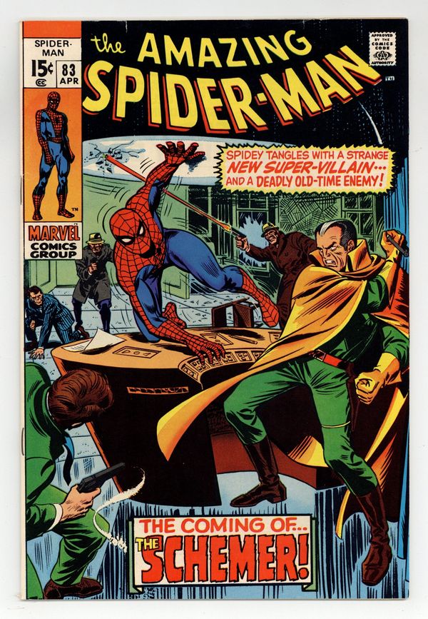 Tags: Marvel Legacy Numbering: Amazing Spider-Man (part 83), Spider-Man$46.00First appearances of Richard Fisk and Vanessa Fisk in "The Schemer!" Part 1 of 3. Script by Stan Lee. Pencils by John Romita. Inks by Mike Esposito (as Mickey Demeo). Cover by John Romita. A new crime boss bursts on the scene in New York City: The Schemer! And his one goal is to take over the Kingpin's criminal empire! Whoa, the Schemer is either very brave or very foolish to go head-to-head with the Kingpin of crime. Meanwhile, after giving Flash Thompson a send-off for his return trip to Vietnam; Peter and Gwen are almost hit by a truck -- while walking along the sidewalk! The web-slinger is enraged when he learns that the accident was caused by the Schemer's men. And he vows to make the novice villain pay! Cameo appearances by J. Jonah Jameson, Joe Robertson, Captain Stacy, Betty Brant,Harry Osborn, and Mary Jane Watson. (Notes: This story was reprinted in Marvel Tales #64. The letters page includes a statement of ownership: average print run 574,910; average paid circulation 372,352.) 36 pages. Cover price $0.15.