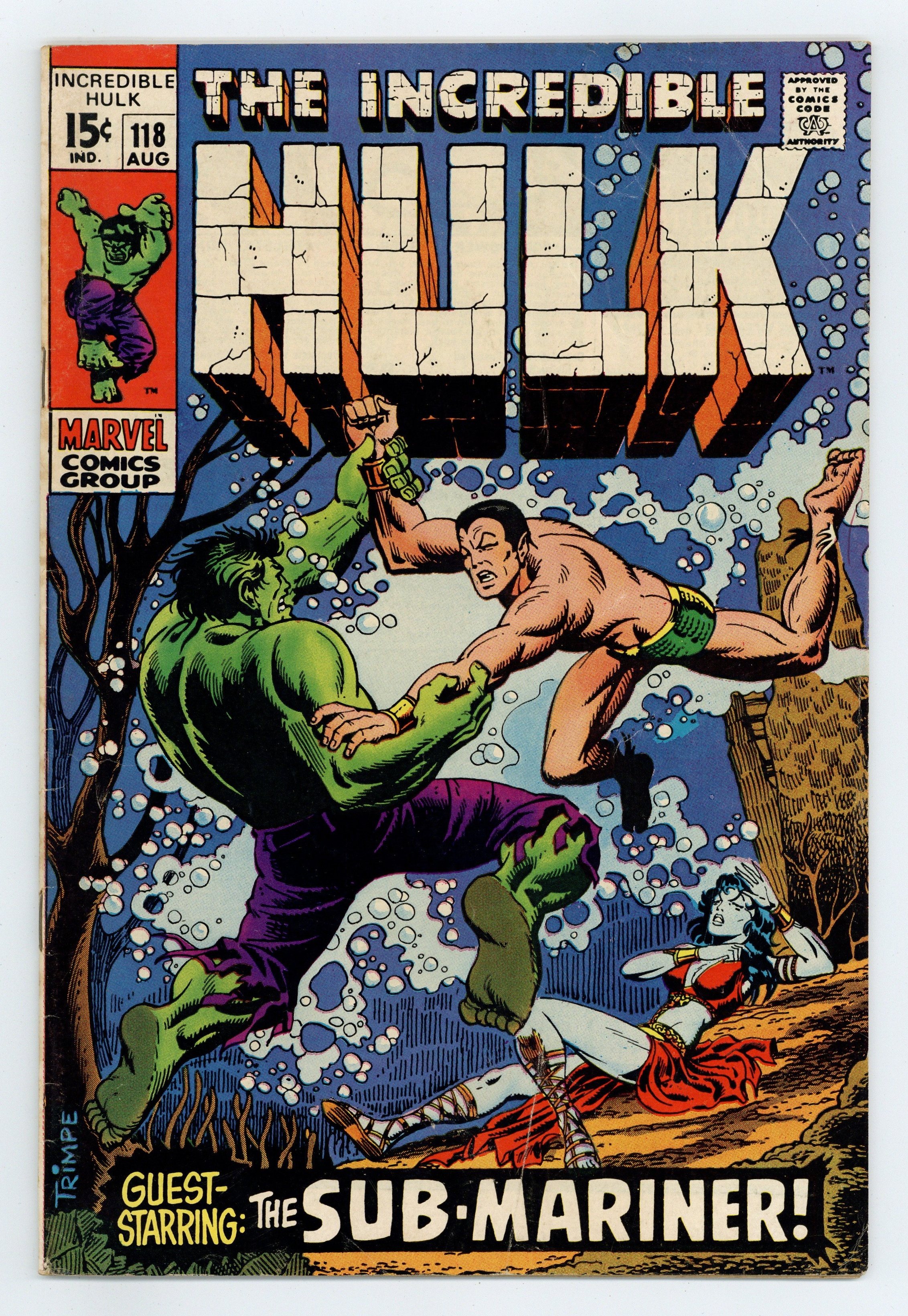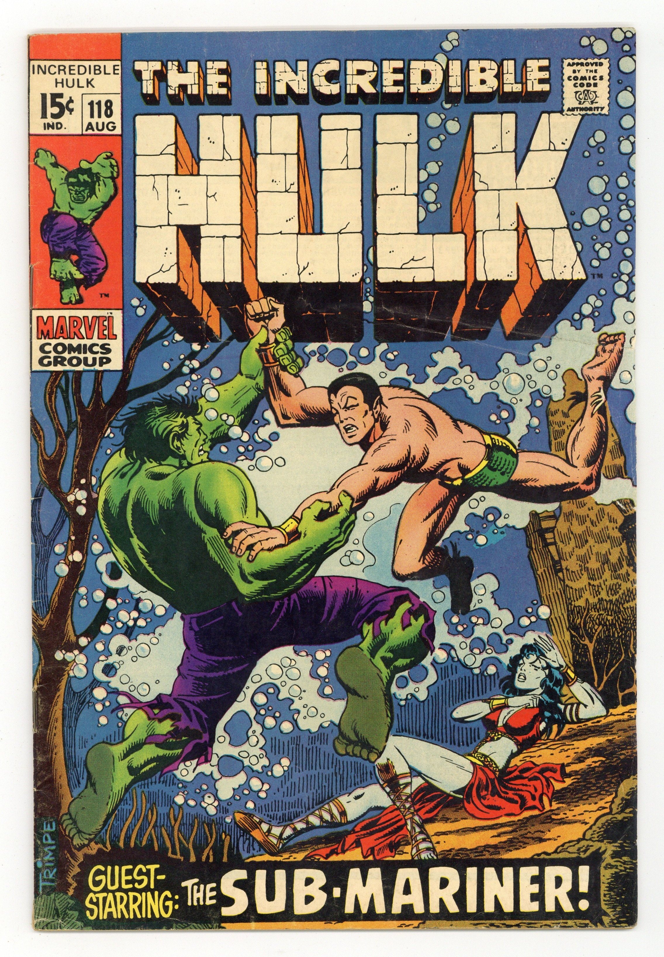 First 15-cent cover price issue. Cover art by Herb Trimpe. A Clash of Titans, script by Stan Lee, art by Herb Trimpe; Dorma finds Bruce Banner floating in the ocean and brings him down to Atlantis where, inevitably, the Hulk and the Sub-Mariner battle. 36 pgs. $0.15. Cover price $0.15.