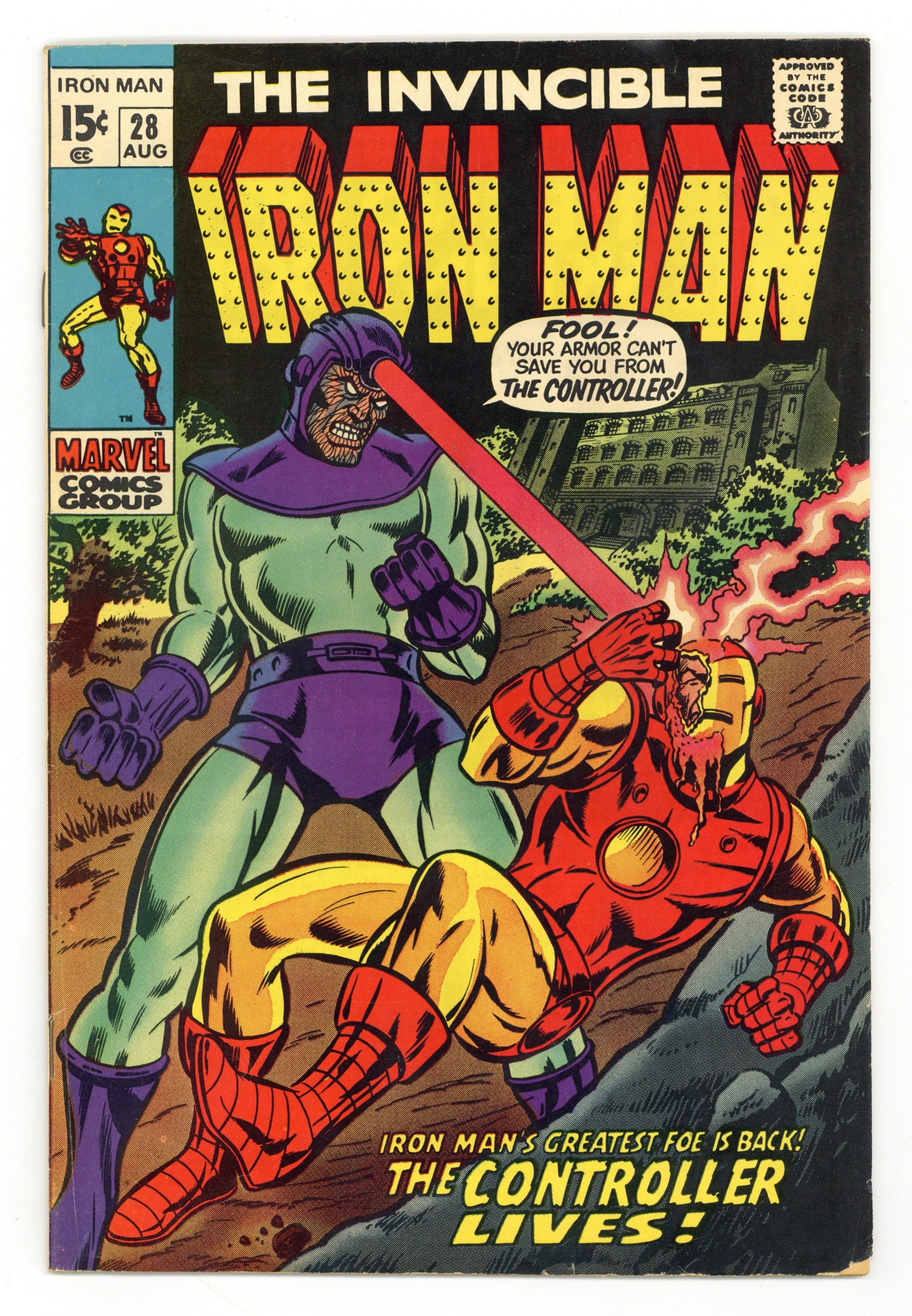 Tags: Marvel Legacy Numbering: Iron Man (part 28), Iron Man$16.75"The Controller Lives!" Story by Archie Goodwin. Art by Don Heck and Johnny Craig. Cover by Marie Severin and Mike Esposito. Tony Stark and Jasper Sitwell are on their way to the Pinewood Sanitarium in a response to a cry for help. A woman from Tony's past, Meredith McCall, is in danger. It so happens that there is another resident of the upstate New York sanitarium that Tony also knows...Basil Sandhurst, the Controller! Has Iron Man's old foe taken control of the sanitarium? Flashback appearance of Tony Stark's father, Howard Anthony Stark. (Note: This issue includes a half-page ad for Astonishing Tales 1 featuring Ka-zar and Doctor Doom.) 32 pages Cover price $0.15.
