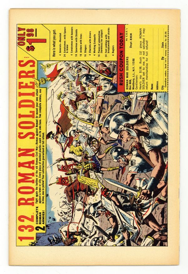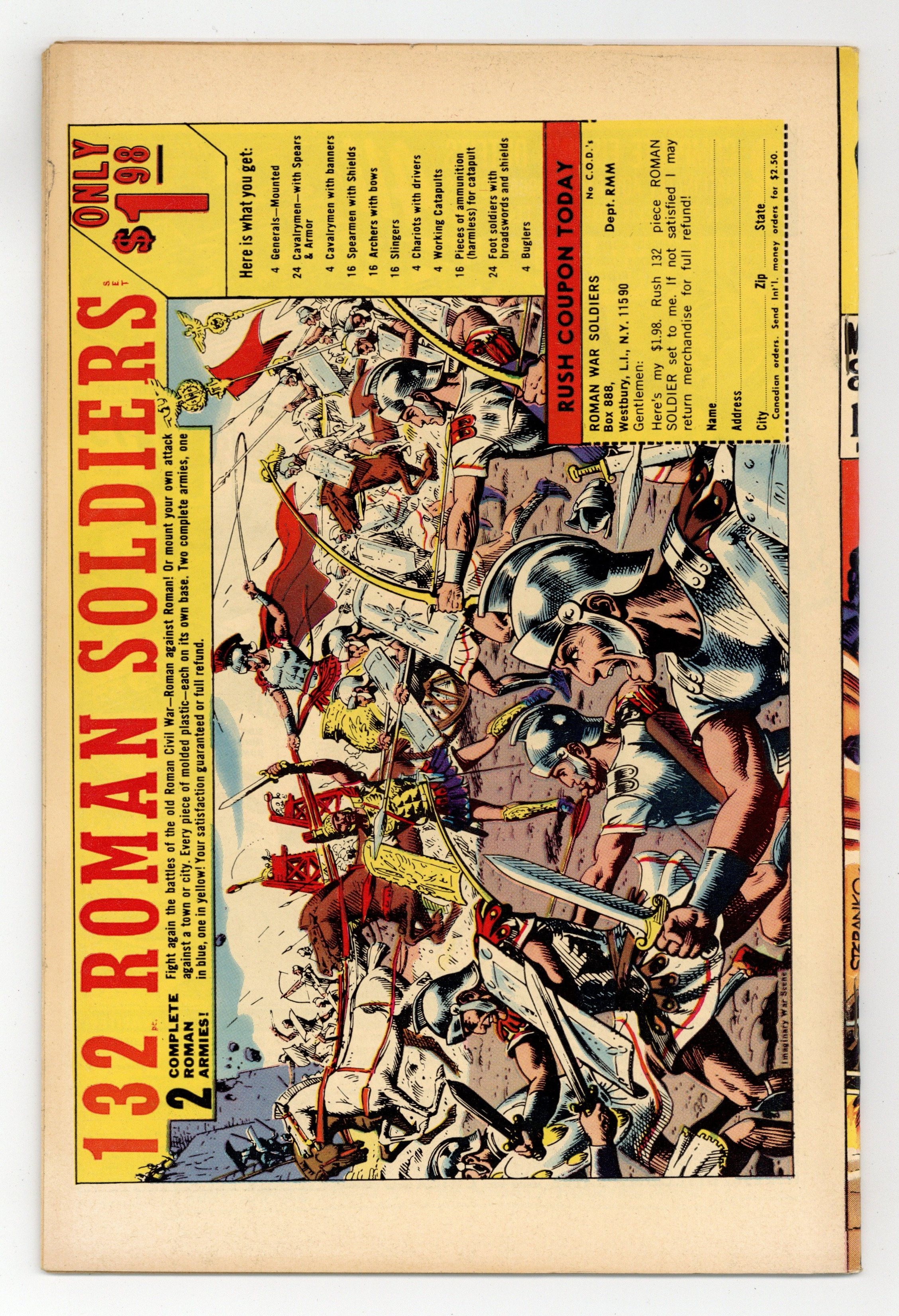 Cover by Jim Steranko. "So Shall Ye Reap... Death!", script and pencils by Jim Steranko, inks by Frank Giacoia and Joe Giella (assist); (Page 5, panels 9 and 11 redrawn by John Romita Sr. to allow the issue to pass the Comics Code Authority); Jimmy Woo goes through a death-trap laden "fun house" as his initiation as a SHIELD agent; Later, in his apartment, Fury & Val get romantic; The next day, off the Pacific Coast, en route to the Heli-Carrier in a bizarre twin-bodied jet, Fury & Jimmy are knocked out of the sky and wind up on a volcanic island transformed into a "Garden of Eden" and biological laboratory by "Centurius" - formerly Dr. Noah Black, a scientist who disappeared in the 1930s when his theories were scoffed at; After creating both new & extinct forms of life and sending them into space, he plans to rain down fire on the entire Earth, for forty days and forty nights, cleansing it so his creations can start anew on a world "without the threat of mass murder, intimidation, fear"; With the help of a visiting movie company and their robot gorilla prop, Fury & Woo put the kibosh on his plans. 36 pgs., full color. $0.12. Cover price $0.12.