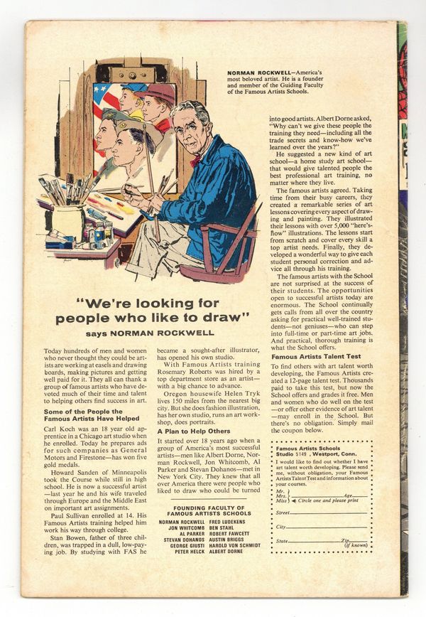 Third appearance of Mary Jane (cameo; first time face is shown). Cover by John Romita Sr. Rhino, Foggy Nelson (from Daredevil), and Dr. Curtis Connors cameos in The Birth of a Super-Hero!, script by Stan Lee, art by John Romita Sr.; John Jameson was exposed to some strange space spores on a space mission. He returns to Earth where he gains super strength; Spider-Man is mistakenly accused of robbing a bank so Jameson decides to try to capture him with his new super powers. Ad for the M.M.M.S. fan club. Reprinted in Marvel Tales # 31 and 182. 36 pgs., full color. $0.12. Cover price $0.12.