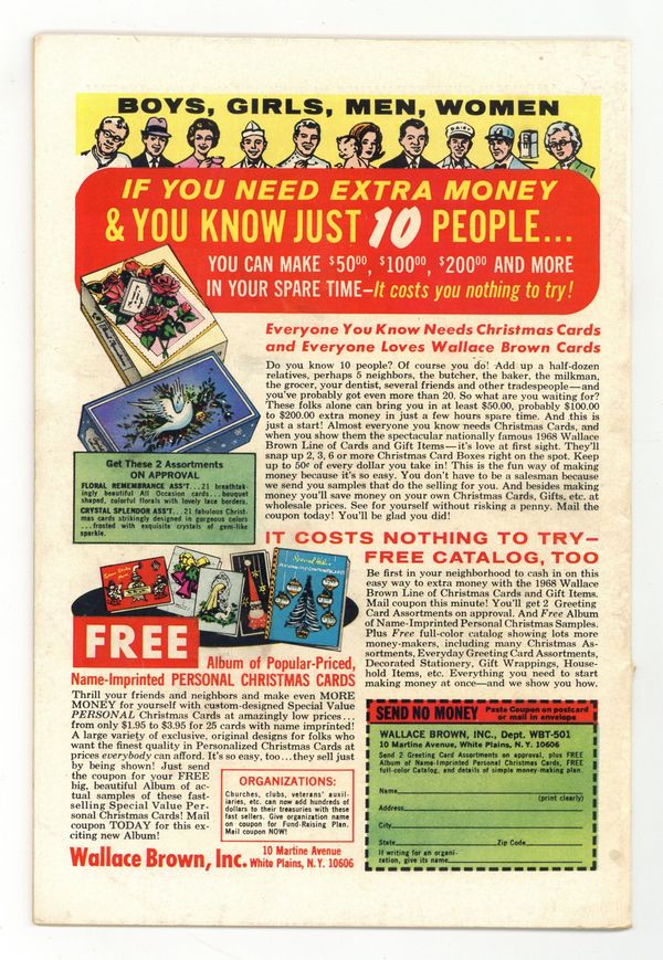 Starts May 11 "The Impossible Escape!" Script by Stan Lee. Art by John Romita (layouts) and Jim Mooney (finishes). Cover by John Romita. The wondrous wall-crawler lies unconscious in the street after defeating the Vulture. Thankfully, Captain George Stacy is at scene, and he prevents the crowd from unmasking the web-slinger! However Spider-Man is still taken to a nearby prison -- and placed in the infirmary to recover. In the meantime, six dangerous inmates are preparing to break out of prison. And their plan calls for escaping through the infirmary! Did the sextet pick the wrong day for a jailbreak? Spider-Man says yes! Cameo appearances by Foggy Nelson, Joe Robertson, J. Jonah Jameson, Aunt May, Gwen Stacy, Harry Osborn, and Mary Jane Watson. (Note: This story was reprinted in Marvel Tales #48.) 36 pages. Cover price $0.12.