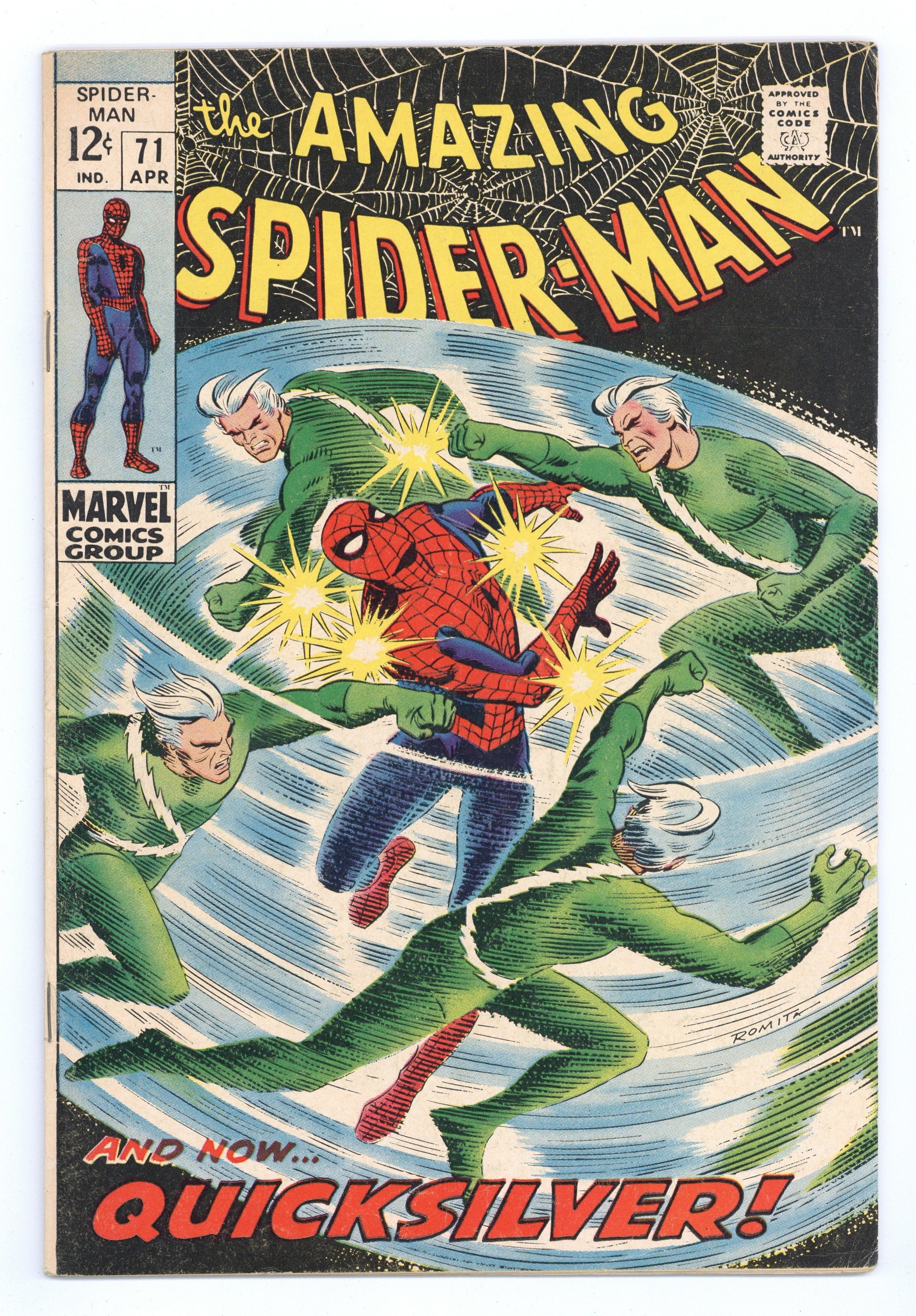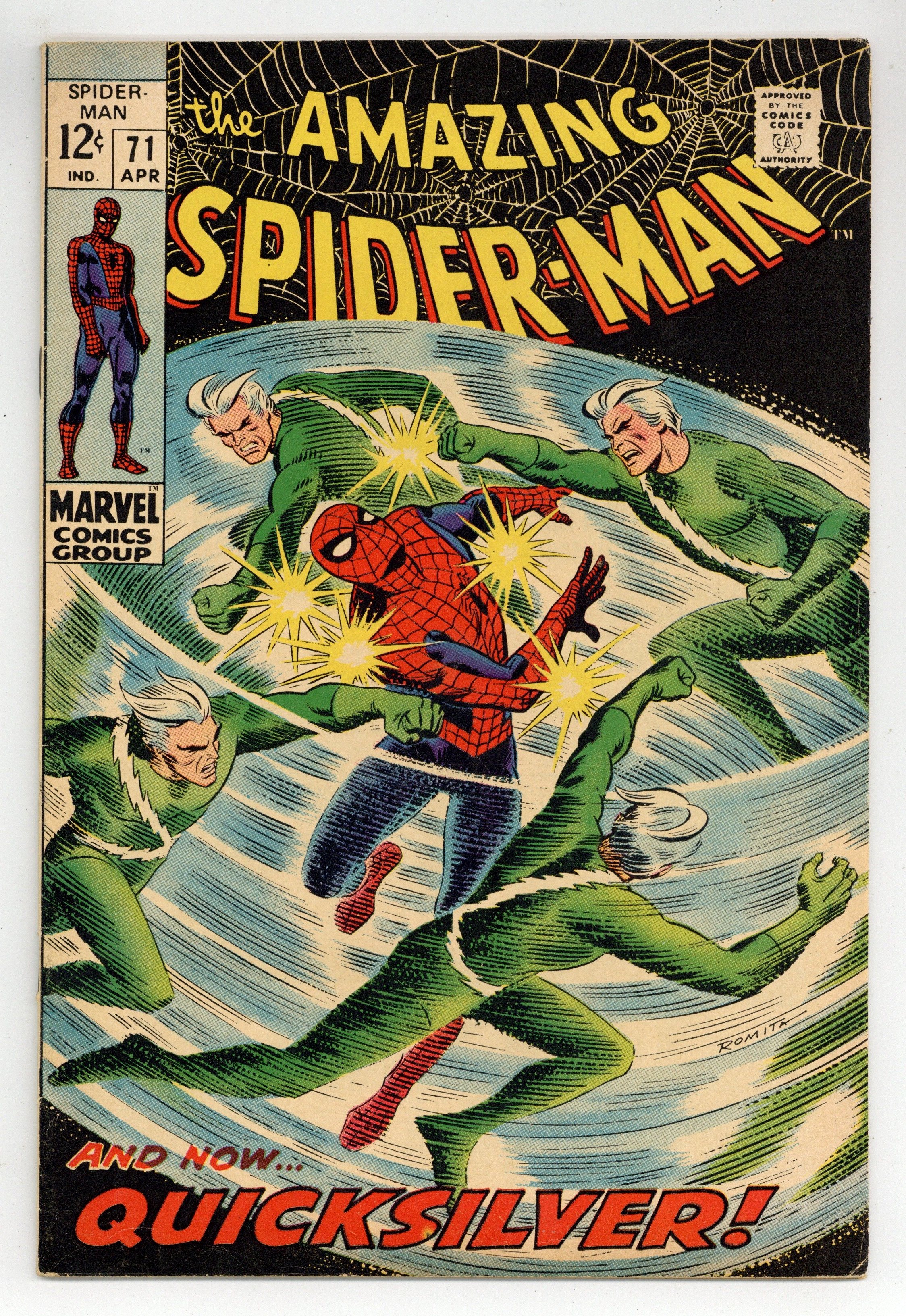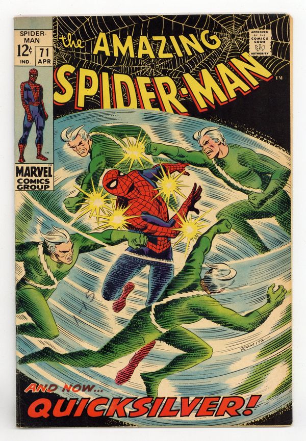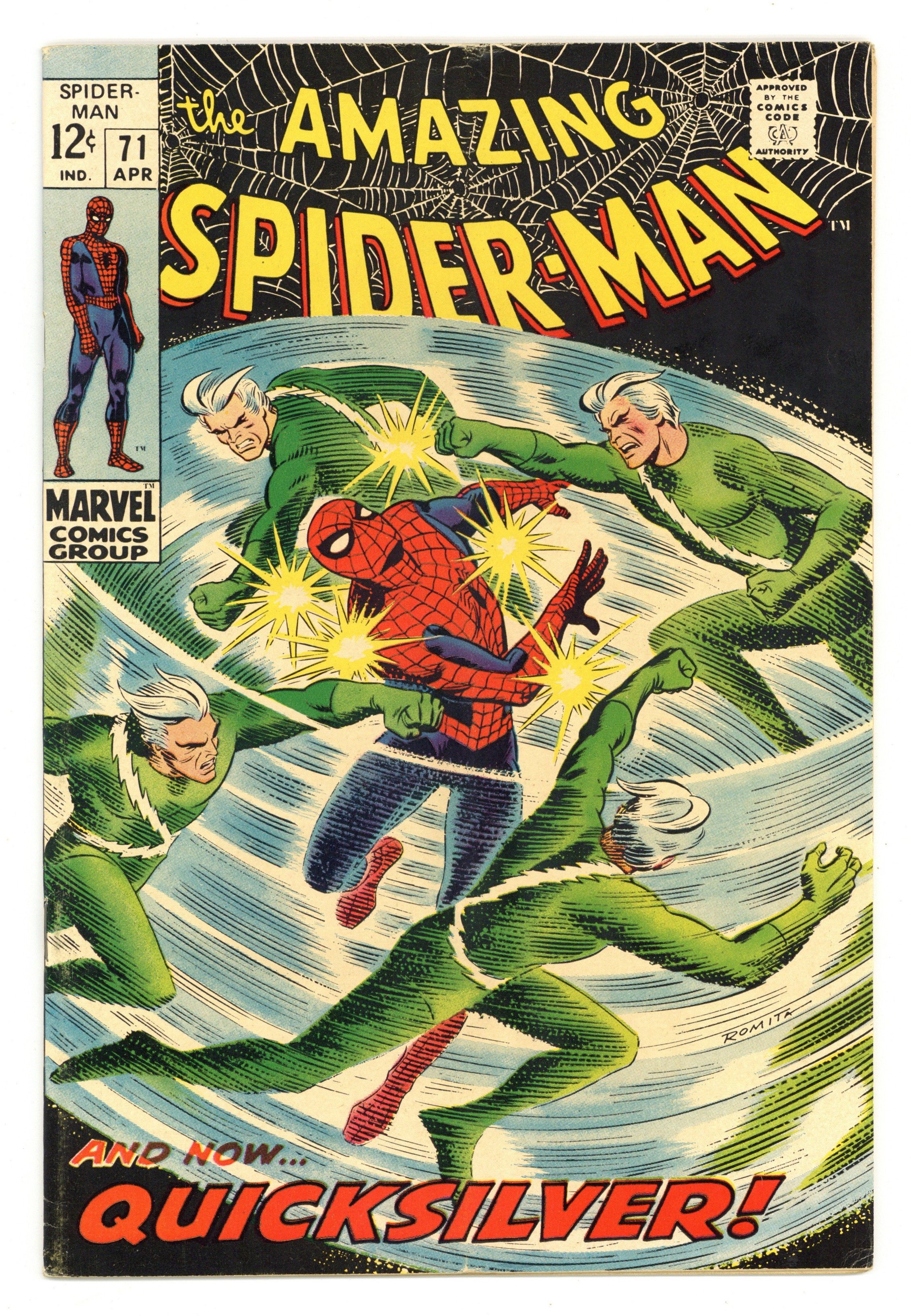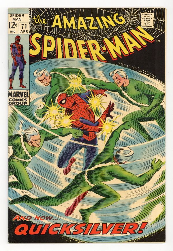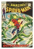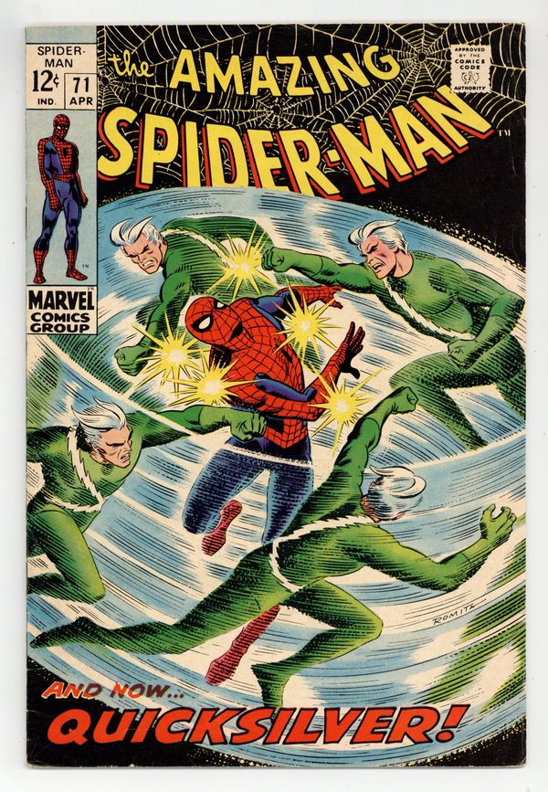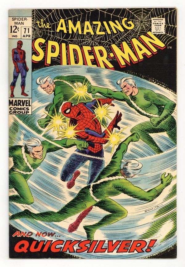 "The Speedster and the Spider!" Guest-starring Quicksilver. Plot by John Romita. Script by Stan Lee. Art by John Romita (layouts) and Jim Mooney (finishes). Cover by John Romita. A downtrodden web-slinger returns to his apartment after losing his temper with J. Jonah Jameson last issue. However Peter Parker's fortunes change the next day when he sells several photographs to the Daily Bugle's stand-in chief (Joe Robertson); and gives the troublesome clay tablet to Captain Stacy. Meanwhile, Quicksilver is back in New York and looking for a way to redeem himself. The mutantspeedster decides that bringing Spider-Man to justice would be the best way. So Pietro launches a surprise attack against the wall-crawler! Quicksilver vs. Spider-Man! May the fastest man win! First appearance of MarthaRobertson. Cameo appearances by Jarvis, Harry Osborn, John Jameson, Betty Brant, Ned Leeds, and Randy Robertson. Flashback cameos by the Scarlet Witch and the Toad. (Notes: Quicksilver and the Scarlet Witch previously appeared in Avengers (1st series) #53. This issue includes a statement of ownership: average print run 556,000; average paid circulation 373,303.) 36 pages. Cover price $0.12.
