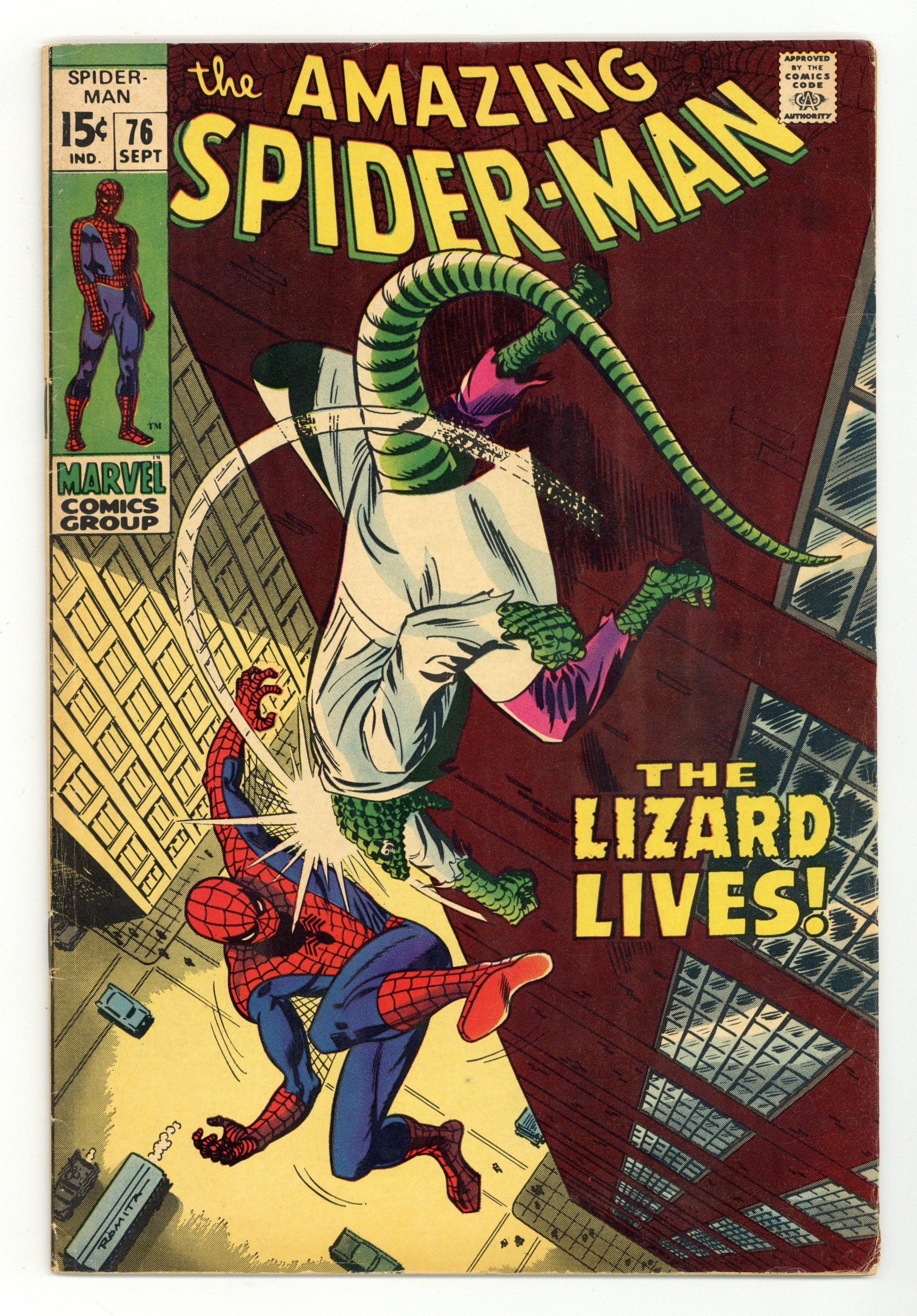 "The Lizard Lives!" Part 1 of 2. Plot by John Buscema. Script by Stan Lee. Art by John Buscema (layouts) and Jim Mooney (finishes). Cover by John Romita. The Lethal Lizard is on the loose in New York City! And Dr. Connors' alter-ego has only one thing on his reptilian mind: destroy Spider-Man! Peter Parker knows that a ferocious fight against the Lizard awaits him, so he takes a moment to visit Gwen Stacy before searching for his scaled adversary. A while later on the East Side, the Lizard ambushes the web-slinger! And their dazzling donnybrook begins! However when the Lizard wraps his tail around the wall-crawler's neck -- it looks like curtains for your friendly neighborhood Spider-Man! Cameo appearances by Aunt May, Harry Osborn, Joe Robertson, Captain Stacy, Martha Connors, Billy Connors, and the Human Torch. (Note: This issue was reprinted in Marvel Tales #57.) 36 pages. Cover price $0.15.