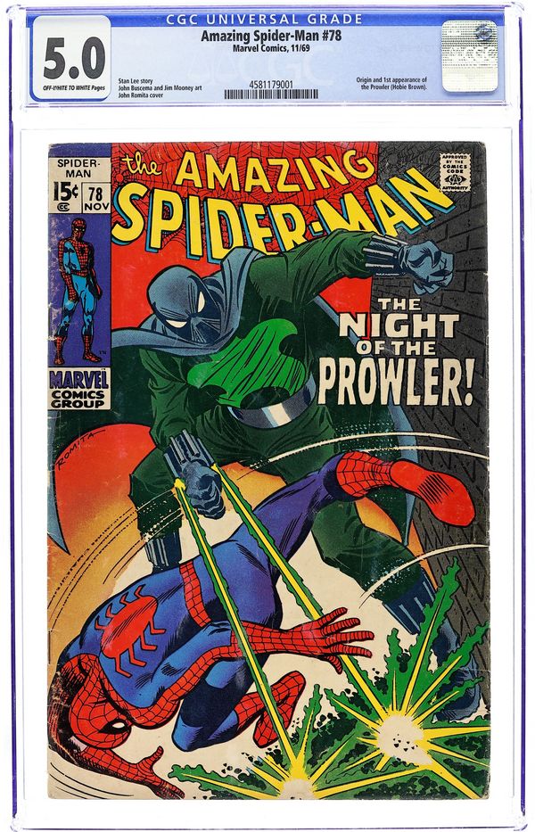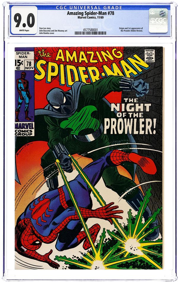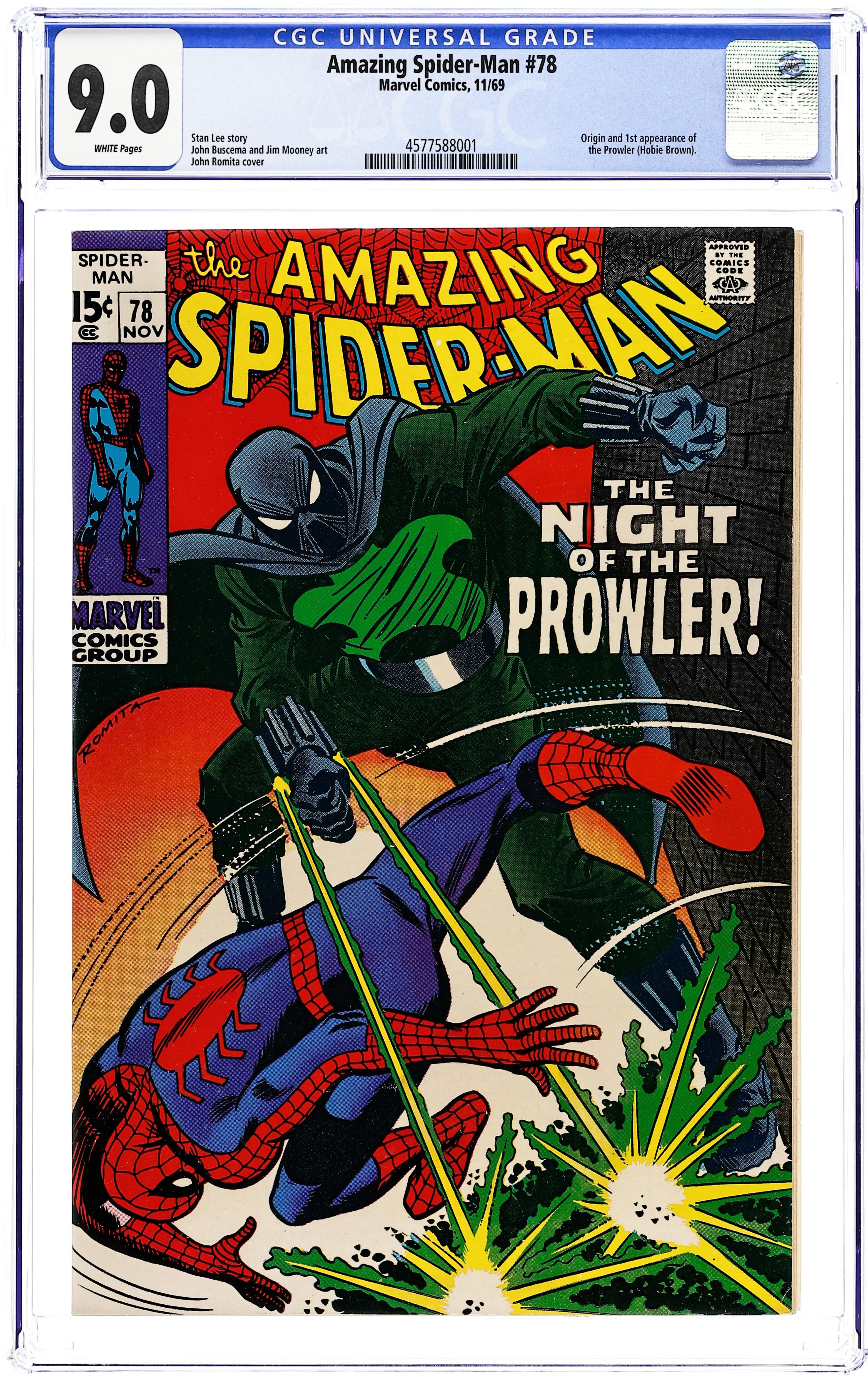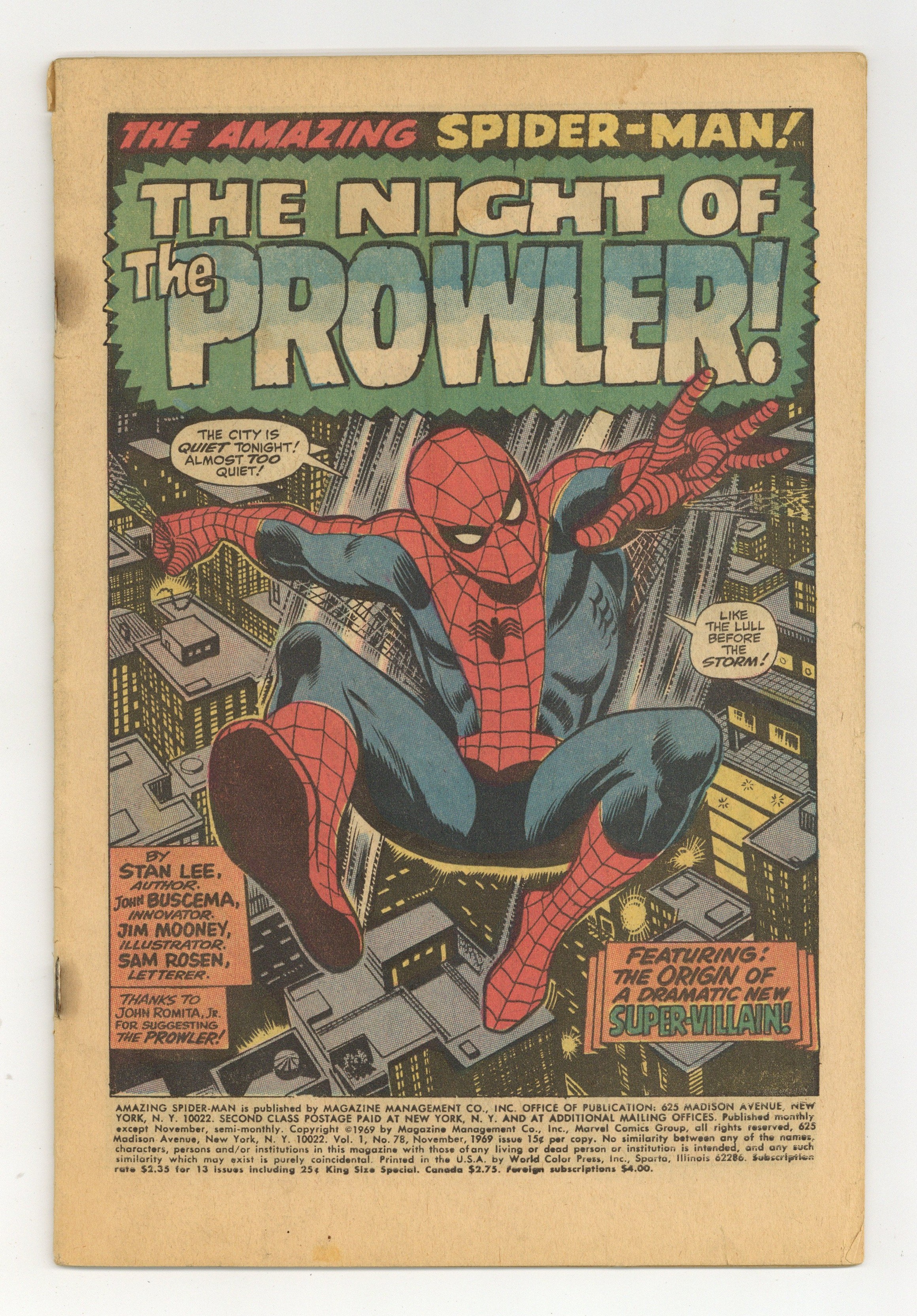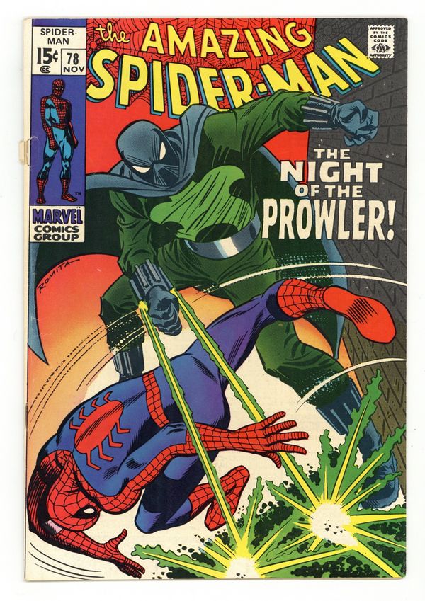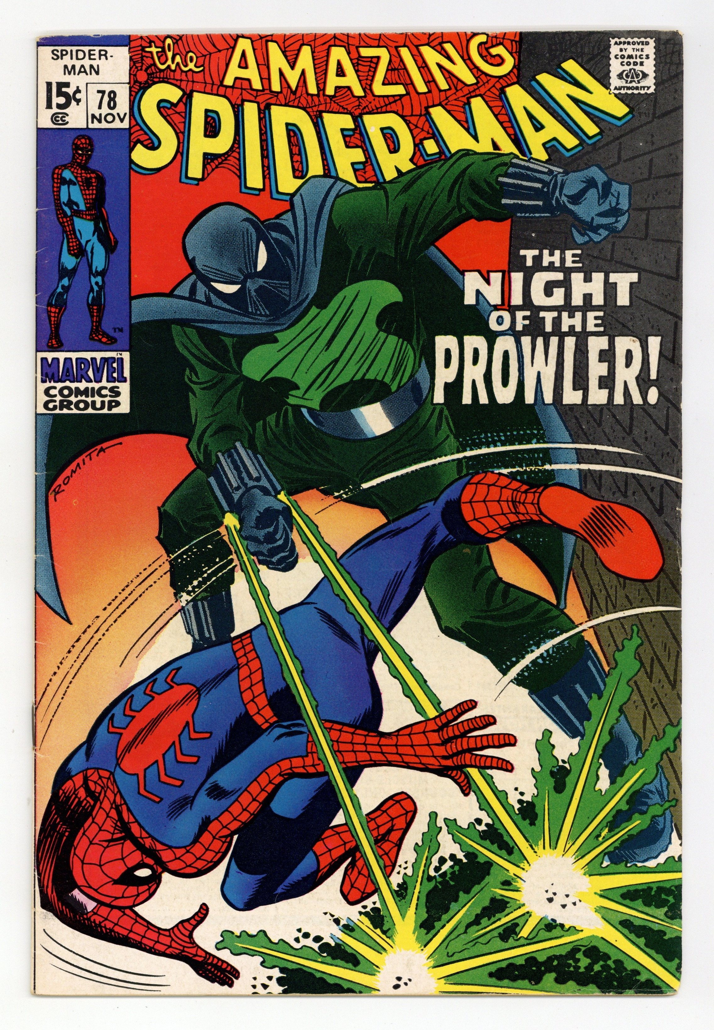 Ends Dec 8 7:16 PM CST Bid History 3 bids Current Bid $16 Your Secret Max Bid If you'd like to bid, please log in or register. First appearance of the Prowler in "The Night of the Prowler!" Part 1 of 2. Script by Stan Lee. Art by John Buscema (layouts) and Jim Mooney (finishes). Cover by John Romita. In order to make a name for himself, a down on his luck window washer named Hobie Brown becomes a super-villain. And using his own ideas and equipment, Hobie creates weapons and a costume -- and the Prowler is born! In the meantime, Peter Parker is also feeling downtrodden after seeing Gwen Stacy and Flash Thompson having coffee together. Later that evening, Peter stops by the Daily Bugle hoping for a payday advance. But instead he sees the Prowler stealing the Bugle's payroll bag! And suddenly it's the Prowler vs. Peter Parker...with J. Jonah Jameson standing by! Origin of the Prowler. Cameo appearances by Harry Osborn, Joe Robertson, and Mindy Brown. (Note: This story was reprinted in Marvel Tales #59.) 36 pages. Cover price $0.15.