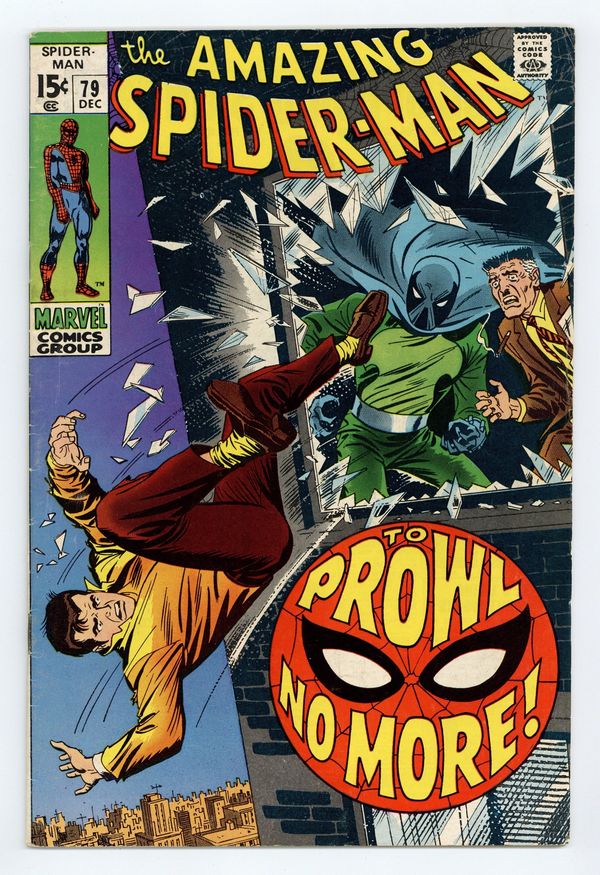 Tags: Marvel Legacy Numbering: Amazing Spider-Man (part 79), Spider-Man$65.00"To Prowl No More!" Part 2 of 2. Script by Stan Lee. Art by John Buscema (layouts) and Jim Mooney (finishes). Cover by John Romita. As shown on the frightening cover, Peter Parker falls out of J. Jonah Jameson's office window! But thanks to his ability to cling to surfaces...he survives! And after changing into his costume, Spider-Man welcomes the Prowler to the superhero vs. super-villain business! However during their fight, the web-slinger realizes that he and the Prowler have a lot in common. Perhaps there is a better way to resolve their conflict...and give Hobie Brown a fresh start. Cameo appearances by Gwen Stacy, J. Jonah Jameson, and Joe Robertson. (Notes: The Prowler returns in Amazing Spider-Man #87. This story was reprinted in Marvel Tales #60.) 36 pages. Cover price $0.15.