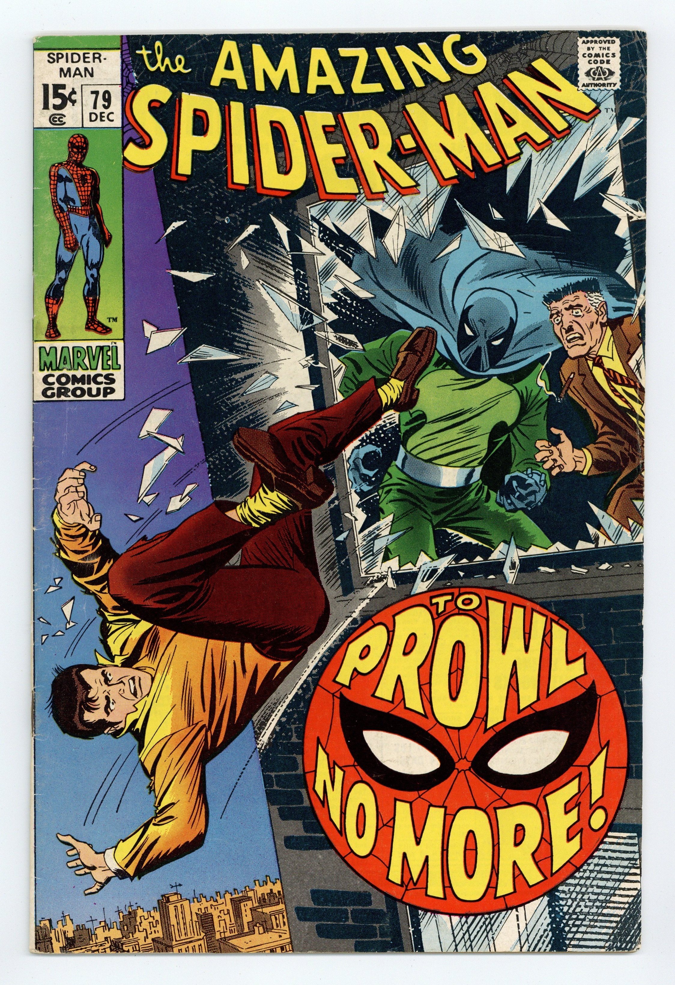 "To Prowl No More!" Part 2 of 2. Script by Stan Lee. Art by John Buscema (layouts) and Jim Mooney (finishes). Cover by John Romita. As shown on the frightening cover, Peter Parker falls out of J. Jonah Jameson's office window! But thanks to his ability to cling to surfaces...he survives! And after changing into his costume, Spider-Man welcomes the Prowler to the superhero vs. super-villain business! However during their fight, the web-slinger realizes that he and the Prowler have a lot in common. Perhaps there is a better way to resolve their conflict...and give Hobie Brown a fresh start. Cameo appearances by Gwen Stacy, J. Jonah Jameson, and Joe Robertson. (Notes: The Prowler returns in Amazing Spider-Man #87. This story was reprinted in Marvel Tales #60.) 36 pages. Cover price $0.15.