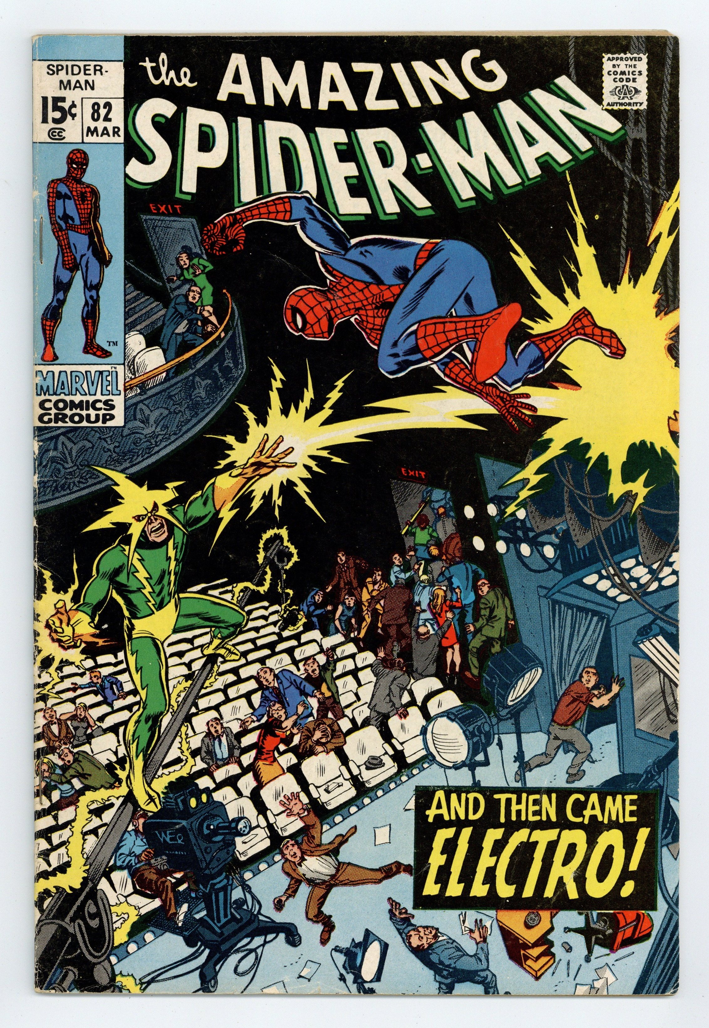 Tags: Marvel Legacy Numbering: Amazing Spider-Man (part 82), Spider-Man$53.00"And Then Came Electro!" Plot by John Romita. Script by Stan Lee. Art by John Romita (layouts) and Jim Mooney (finishes). Cover by Marie Severin. Aunt May's nephew is running low on funds to attend Flash Thompson's farewell dinner. So the wall-crawler stops by the office of a major television network -- and offers to appear on the network's late night talk show! The TV executives eagerly accept the web-slinger's offer, and the news rapidly spreads across town. Later that night a large audience attends the show including: J. Jonah Jameson, Joe Robertson, Captain Stacy, and Max Dillon. Uh-oh, that last name could be trouble! When the curtain rises, the show begins...in more ways than one! The Amazing Spider-Man vs. Electro! What a treat! Cameo appearances by Gwen Stacy, Mary Jane Watson, Harry Osborn, Aunt May, and Anna Watson. (Notes: This issue features a classic Marie Severin cover. John Romita added inks to the cover. Marie Severin contributed pencils & inks to interior pages 14 & 15. The letters page includes a letter from comics writer J.M. DeMatteis. This story was reprinted in Marvel Tales #63.) 36 pages. Cover price $0.15.