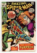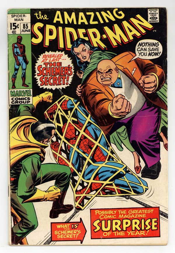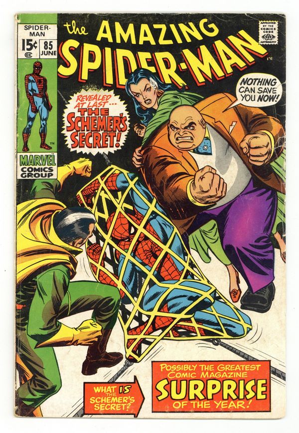 Tags: Marvel Legacy Numbering: Amazing Spider-Man (part 85), Spider-Man$37.50"The Secret of the Schemer!" Part 3 of 3. Script by Stan Lee. Art by John Romita (layouts), John Buscema (pencils), and Jim Mooney (inks). Cover by John Romita. The final showdown between the Kingpin and the Schemer is here! The Schemer is shaken after escaping from the Kingpin's mansion last issue. So the wall-crawler is able to follow him easily and capture him! And then in order to collect the reward money, Spider-Man takes the Schemer to the designated high-rise apartment. But it's all a trick by the topcrime boss in New York City! The Schemer's days appear to be numbered...until he removes his mask. The Kingpin is shocked. Vanessa Fisk is overjoyed. And the web-slinger quietly exits stage left. What just happened? Origin of the Schemer. Cameo appearances by Captain Stacy andGwen Stacy. (Notes: The Kingpin, Vanessa Fisk, and Richard Fisk appear next in Captain America (1st series) 145-148. They cross paths with the web-slinger again in Amazing Spider-Man 163. This story was reprinted in Marvel Tales #66.) 36 pages. Cover price $0.15.