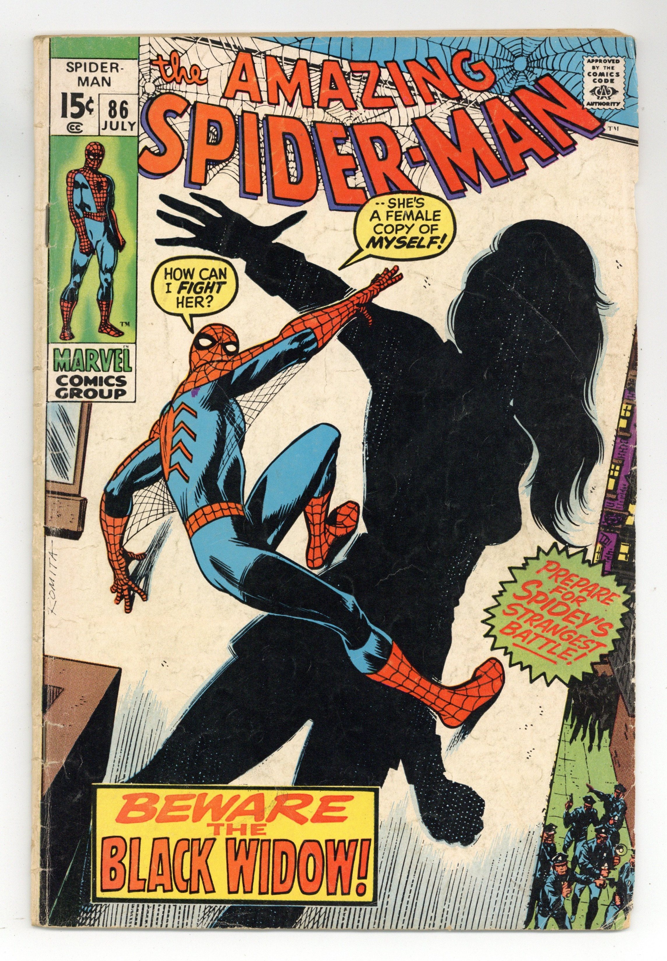 First appearance of the Black Widow's classic black costume in "Beware the Black Widow!" Guest-starring the Black Widow. Script by Stan Lee. Art by John Romita (layouts) and Jim Mooney (finishes). Cover by John Romita. Natasha Romanoff is ready to get back in the superhero game! But there are two things she must do first. One...design a new costume; and two...learn the secrets of the wondrous wall-crawler! So to that end the widow lays a trap for the web-slinger! Will the Amazing Spider-Man get caught in the web of the beautiful Black Widow? Retelling of the Black Widow's origin. Cameo appearances by Captain Stacy, Gwen Stacy, Harry Osborn, Aunt May, Anna Watson, and J. Jonah Jameson. Flashback cameos by Iron Man, Hawkeye, and the Red Guardian. (Notes: The Black Widow appears next in Amazing Adventures (1970 2nd series) #1. Spider-Man and the Black Widow meet again in Daredevil (1st series) 103. This issue was reprinted in Marvel Tales #67.) 36 pages. Cover price $0.15.