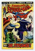 $33.50"Enter: Dr. Strange!" Part 2 of 2. Guest-starring Doctor Strange. Script by Stan Lee. Pencils by John Romita. Inks by John Romita and Tony Mortellaro (backgrounds). Cover by John Romita. The web-slinger frantically swings through the city trying to pick up a signal from his spider tracer! The amazing one tossed the tracer on the tall man who abducted Flash last issue. So, find the tracer...find Flash! But instead, Spider-Man picks up a message from the Master of the Mystic Arts! Somehow Dr. Strange knows were Flash has been taken. The duo rushes to the location, and the battle to rescue Flash begins! Cameo appearances by Gwen Stacy, Harry Osborn, Aunt May, and Sha Shan. (Notes: Spider-Man and Dr. Strange meet again in Marvel Team-Up #21. This story was reprinted in Marvel Tales #88.) 36 pages. Cover price $0.20.