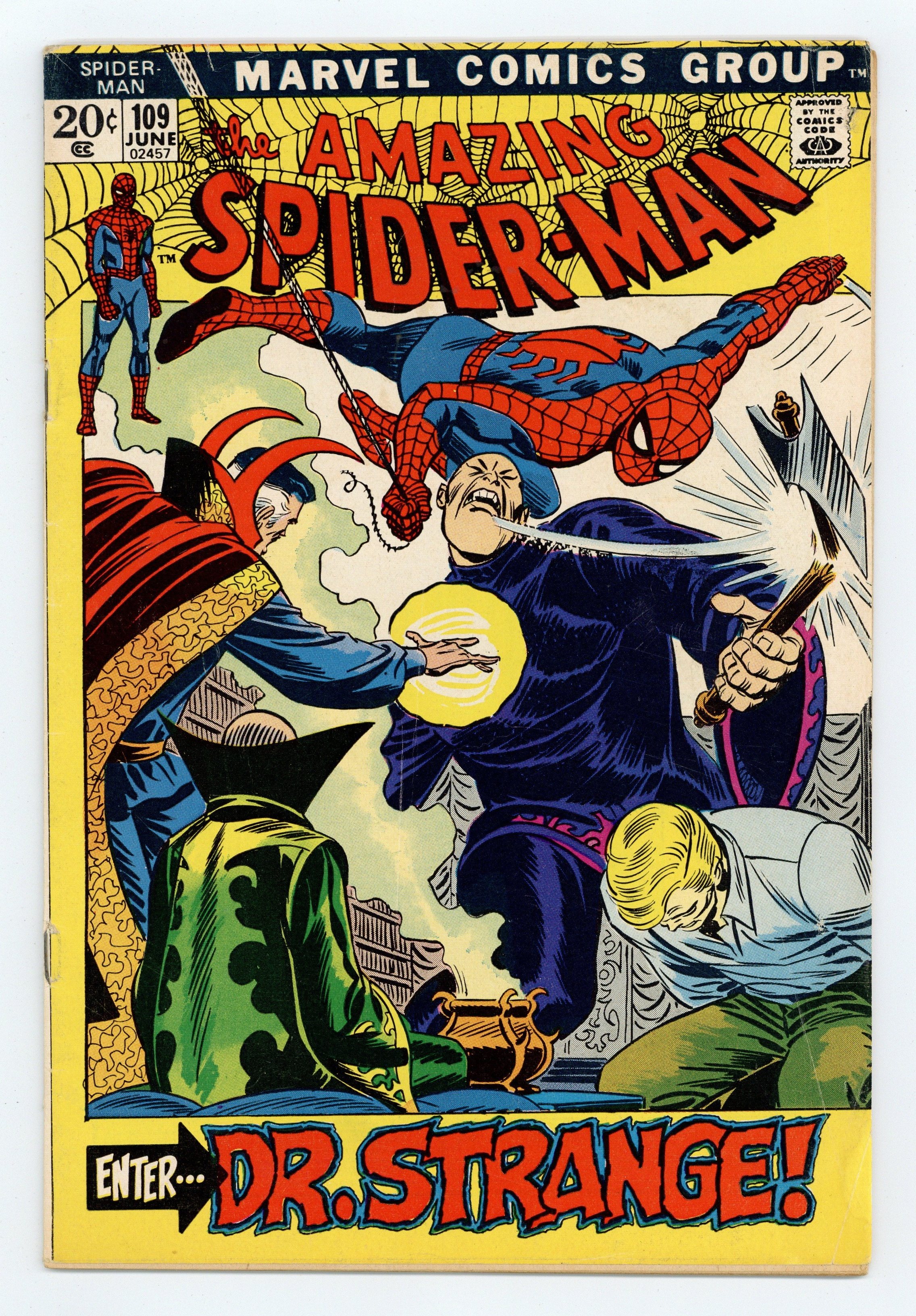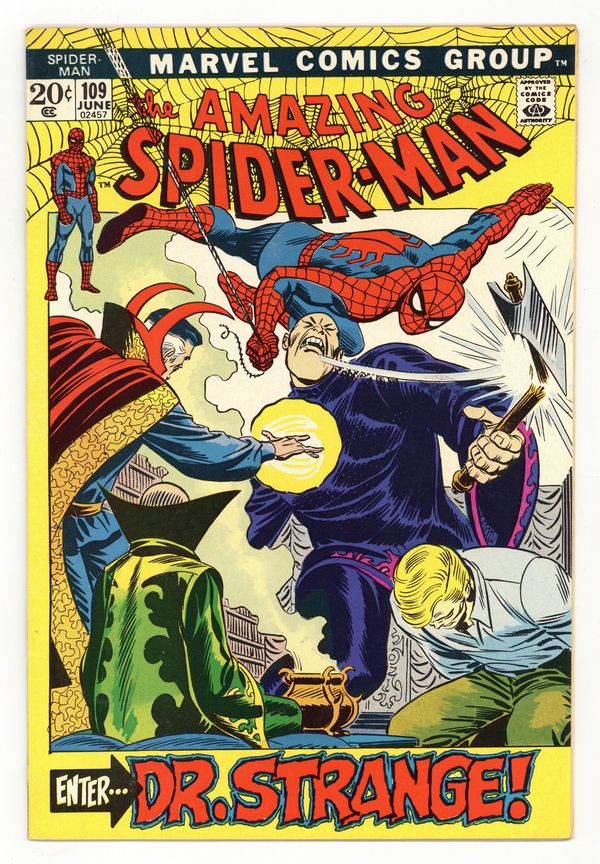 "Enter: Dr. Strange!" Part 2 of 2. Guest-starring Doctor Strange. Script by Stan Lee. Pencils by John Romita. Inks by John Romita and Tony Mortellaro (backgrounds). Cover by John Romita. The web-slinger frantically swings through the city trying to pick up a signal from his spider tracer! The amazing one tossed the tracer on the tall man who abducted Flash last issue. So, find the tracer...find Flash! But instead, Spider-Man picks up a message from the Master of the Mystic Arts! Somehow Dr. Strange knows were Flash has been taken. The duo rushes to the location, and the battle to rescue Flash begins! Cameo appearances by Gwen Stacy, Harry Osborn, Aunt May, and Sha Shan. (Notes: Spider-Man and Dr. Strange meet again in Marvel Team-Up #21. This story was reprinted in Marvel Tales #88.) 36 pages. Cover price $0.20.