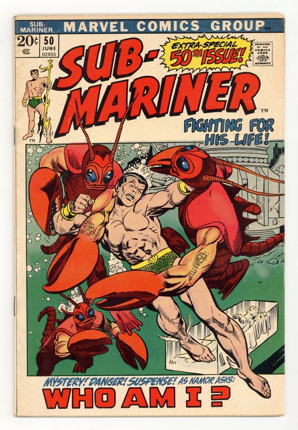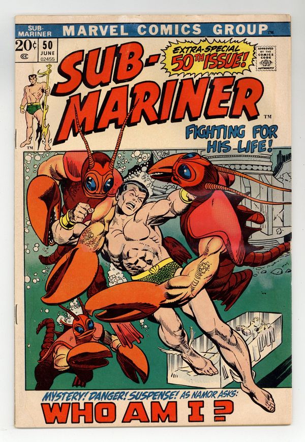 Cover pencils by Gil Kane, inks by Vince Colletta. "Who Am I?", script and art by Bill Everett; Namor rescues a young woman he perceives to have drowned, but she surprises him and flees; He follows her and ends up in the Antarctic where he's attacked by giant crustaceans; He meets Salamar the Sustainer who shows him Namora's corpse and tells him of her daughter Namorita; Namor battles through the crustaceans and meets Prince Byyrah who has captured Namorita; Llyra joins the fun, but Namor manages to escape with Namorita. 36 pgs., full color. $0.20. Cover price $0.20.
