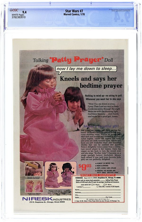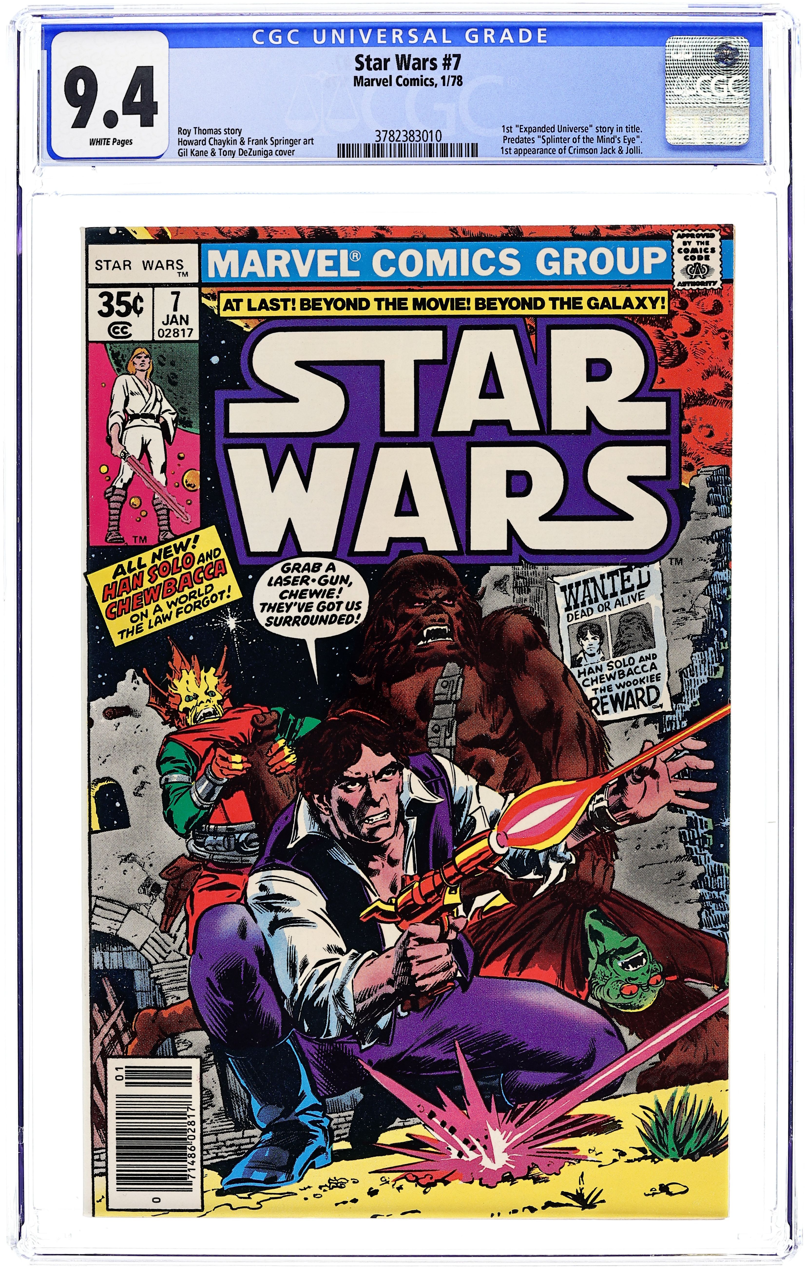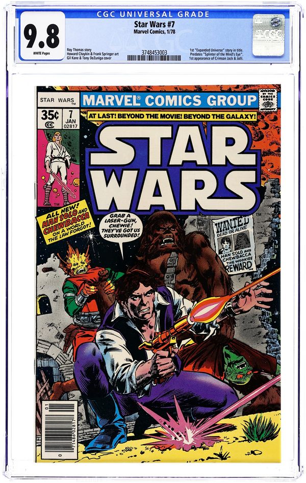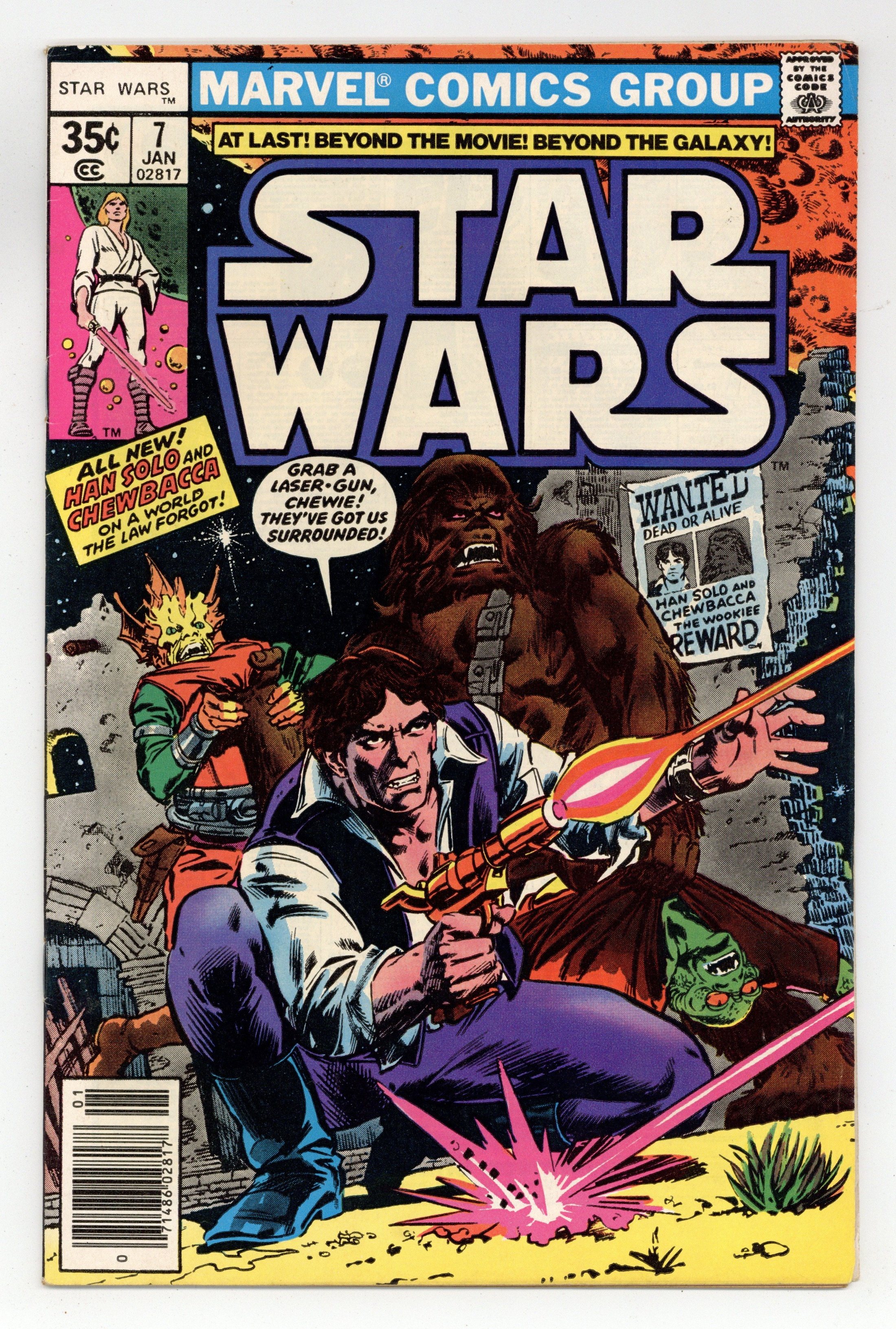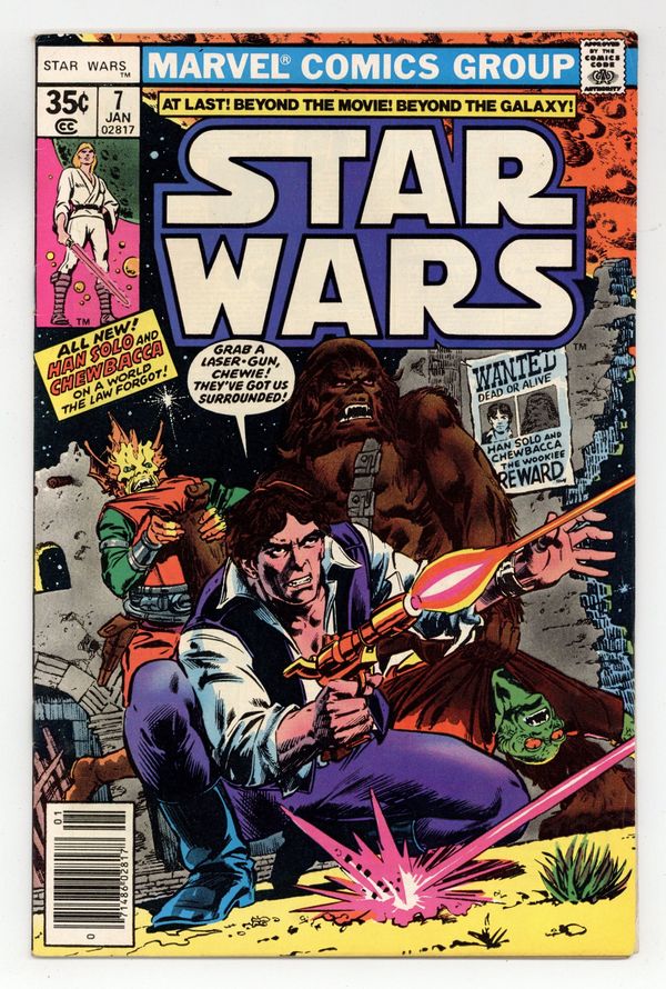 Tags: Star Wars$13.751st printing Newsstand Edition."New Planets, New Perils!" Written by Roy Thomas. Art by Howard Chaykin and Frank Springer. Following the destruction of the Death Star, Han Solo and Chewbacca embark on a deadly solo mission on a strange and dangerous world. Cover price $0.35.