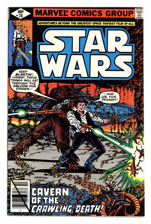 Tags: Star Wars$17.25Direct Edition. "Whatever Happened to Jabba the Hut?!" Written by Archie Goodwin. Art by Carmine Infantino and Gene Day. After the notorious gangster, Jabba the Hut, refuses Han's latest offering to make good on a debt, Solo and his co-pilot, the wookie Chewbacca, desperately try get the Millennium Falcon up and running before a swarm of flesh-eating insects eat through the hull of their ship. And proceed to devour them for dessert! Cover price $0.40.