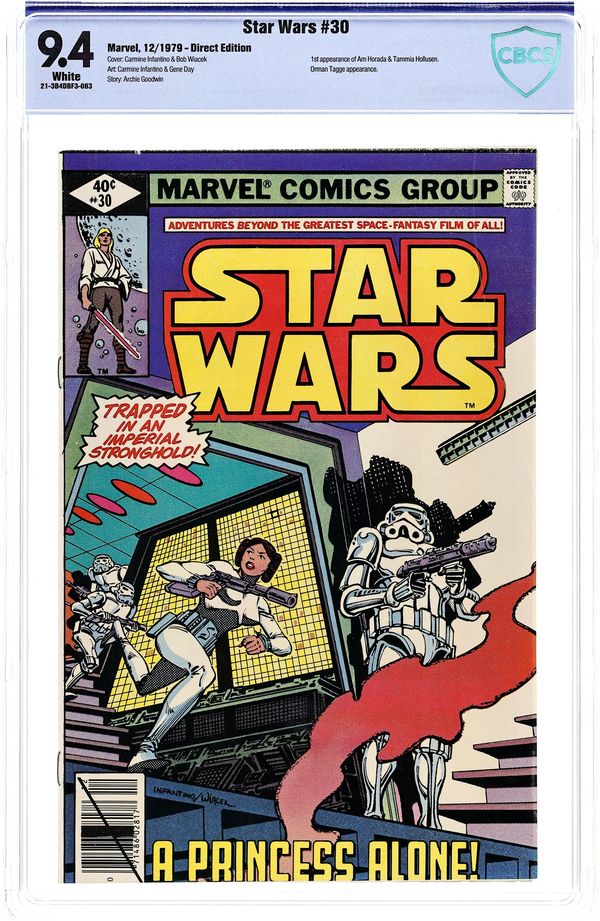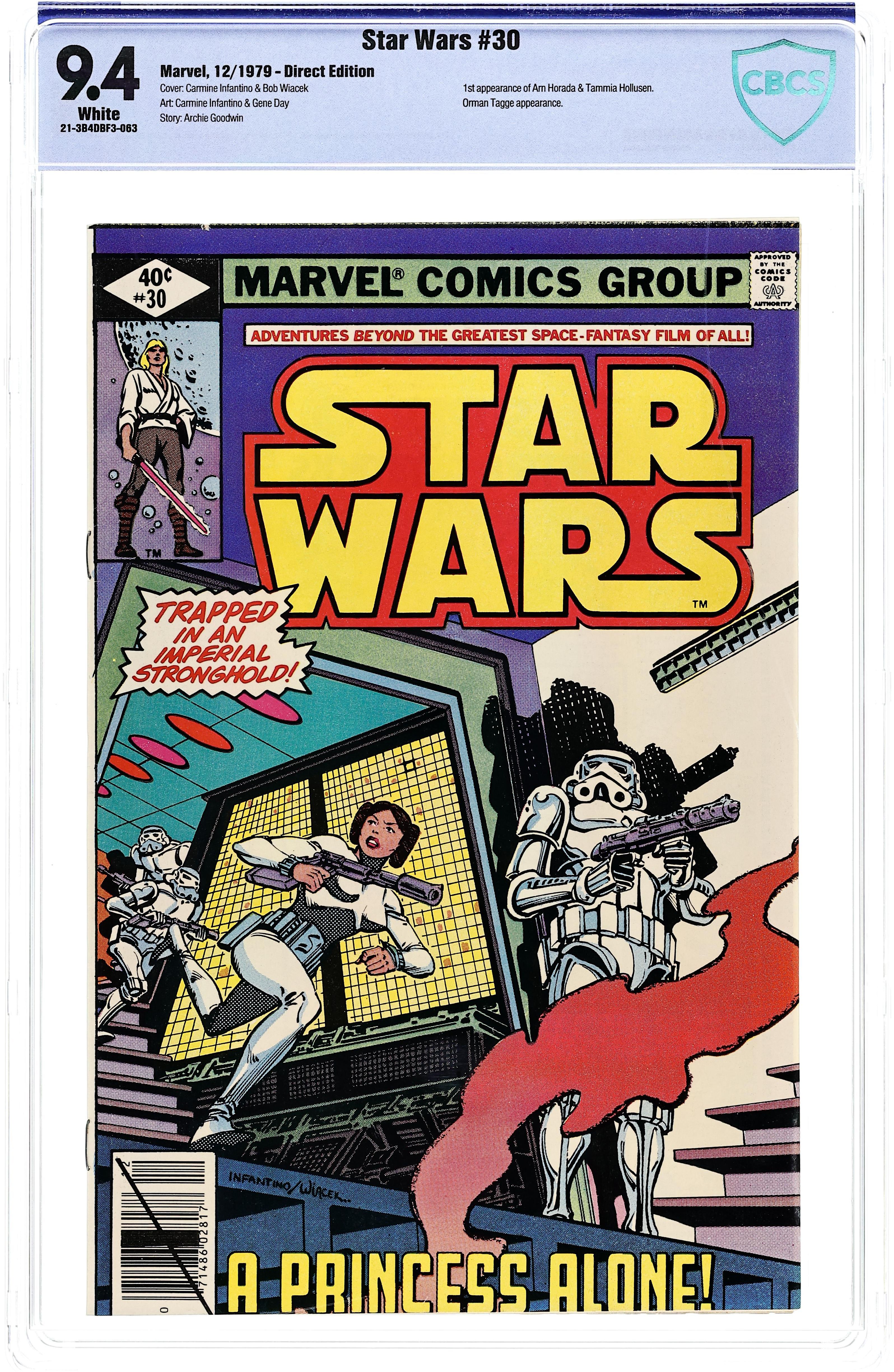 Direct Edition. "A Princess Alone!" Written by Archie Goodwin. Art by Carmine Infantino and Gene Day. Trapped within an Imperial stronghold, the beautiful and brave Princess Leia must use her wits to escape certain death. Includes a 1-page ad for the Rom the Spaceknight action figure, the toy that inspired the comic series by the same name. Cover price $0.40.