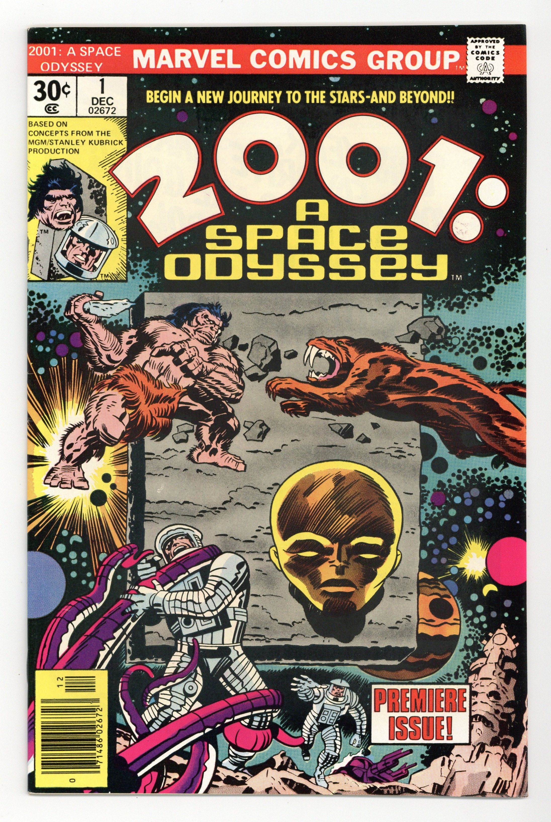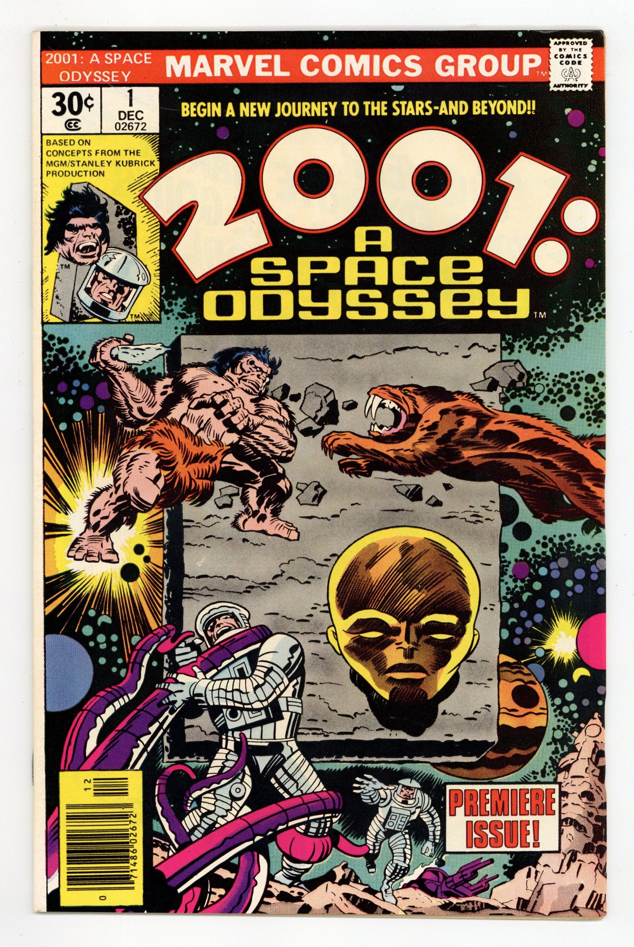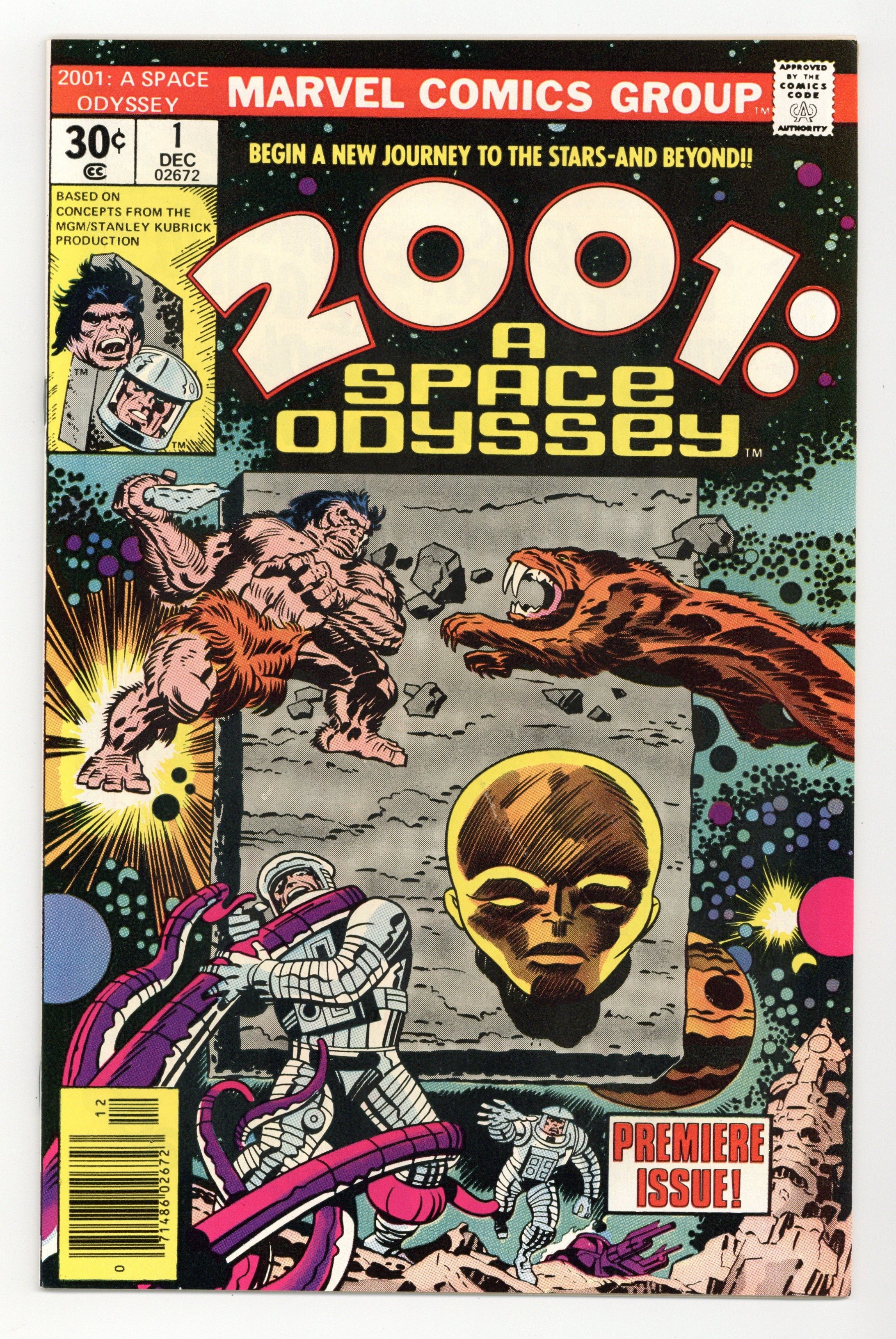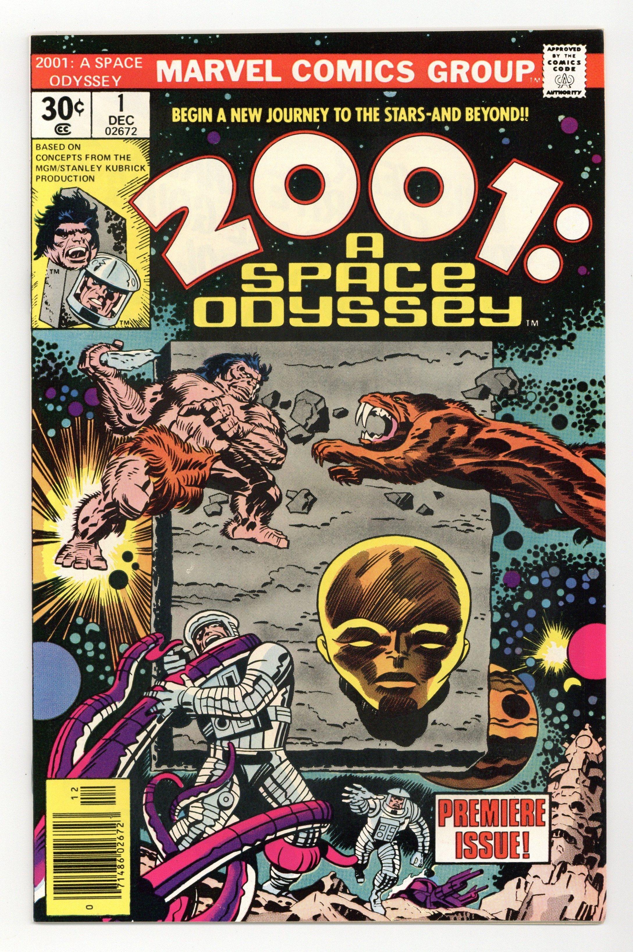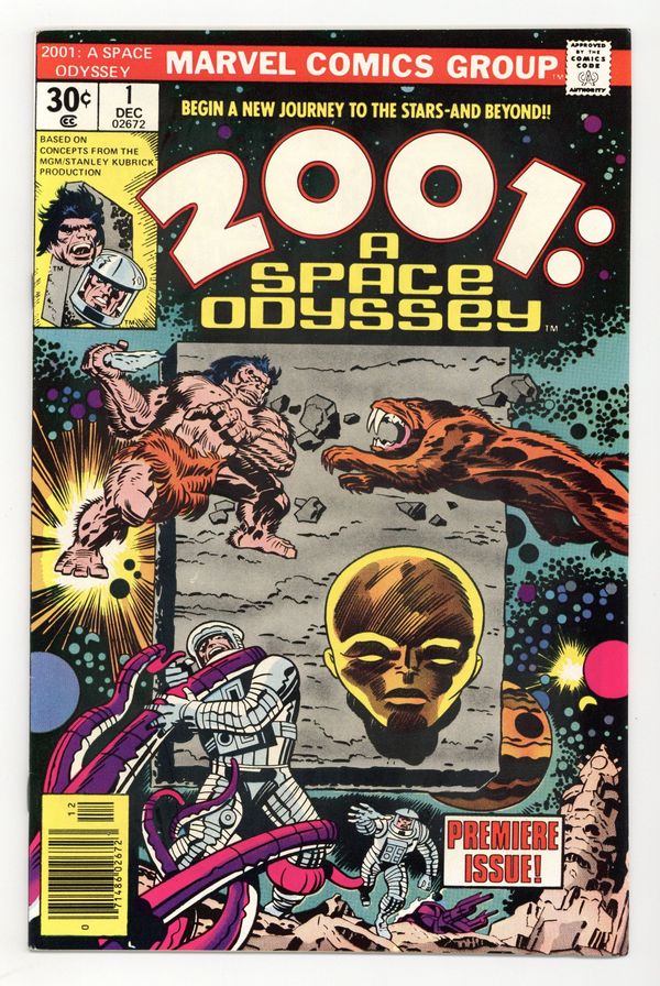 Written by Jack Kirby. Art by Jack Kirby and Mike Royer. Cover by Jack Kirby and John Verpoorten. The issue starts in the distant past where the monolith instructs a hunter on how to craft a spear and then shifts to the future where two astronauts discover an alien ruin. One of the astronauts is killed by a creature, but the other, Woodrow Decker, is transported into a pastoral countryside by the monolith. Here he rapidly ages until he dies and is converted by the monolith into an embryo-type creature referred to as a 'new seed' to explore the galaxy. Based on concepts from the film by Stanley Kubrick & Arthur C. Clarke. Comics ad for the Juicemobiles shoes from Spot-bilt, featuring O.J. Simpson, art by John Romita. Hostess Twinkies ad with Spider-Man, art by Ross Andru and Mike Esposito. Cover price $0.30.