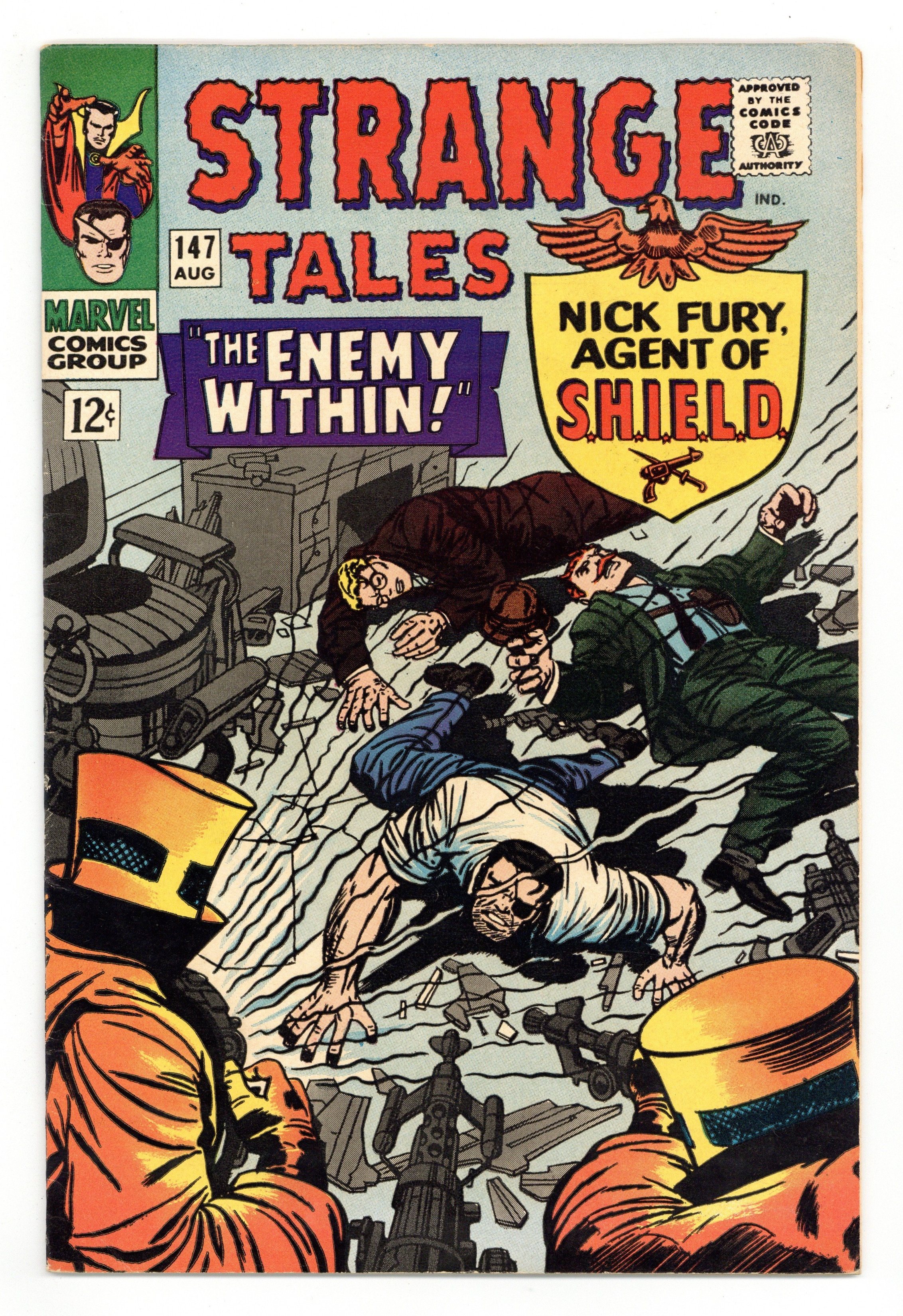 Tags: Marvel Legacy Numbering: Doctor Strange (part 147)$18.00Cover pencils by Jack Kirby, inks by Dick Ayers. Nick Fury stars in "The Enemy Within!", script by Stan Lee and Jack Kirby (co-plot), pencils by Jack Kirby (layouts) and Don Heck, inks by Dick Ayers; Returning from their latest mission, Fury catches hell from the military brass; Count Royale continues bad-mouthing Fury to SHIELD's board of directors; A general explains to Fury how A.I.M. has technology they desperately need, but refuse to do business as long as Fury's in charge. "From the Nameless Nowhere Comes... Kaluu!", script by Stan Lee (pp. 1-5), Denny O'Neil (pp. 6-10), and Bill Everett (co-plot), art by Bill Everett (some panels reprinted from Steve Ditko stories); Doctor Strange walks the streets of Greenwich Village and after stopping a robbery returns home to find his bills unpaid, his bank account empty, and a city building inspector informing him he has six months to bring his house up to code; He instructs Wong to sell some jewels to pay the bills, checks up on Baron Mordo, thinks back on recent events, and then contacts a theatrical agent, Hiram Barney, about a possible nightclub gig. 36 pgs., full color. Cover price $0.12.