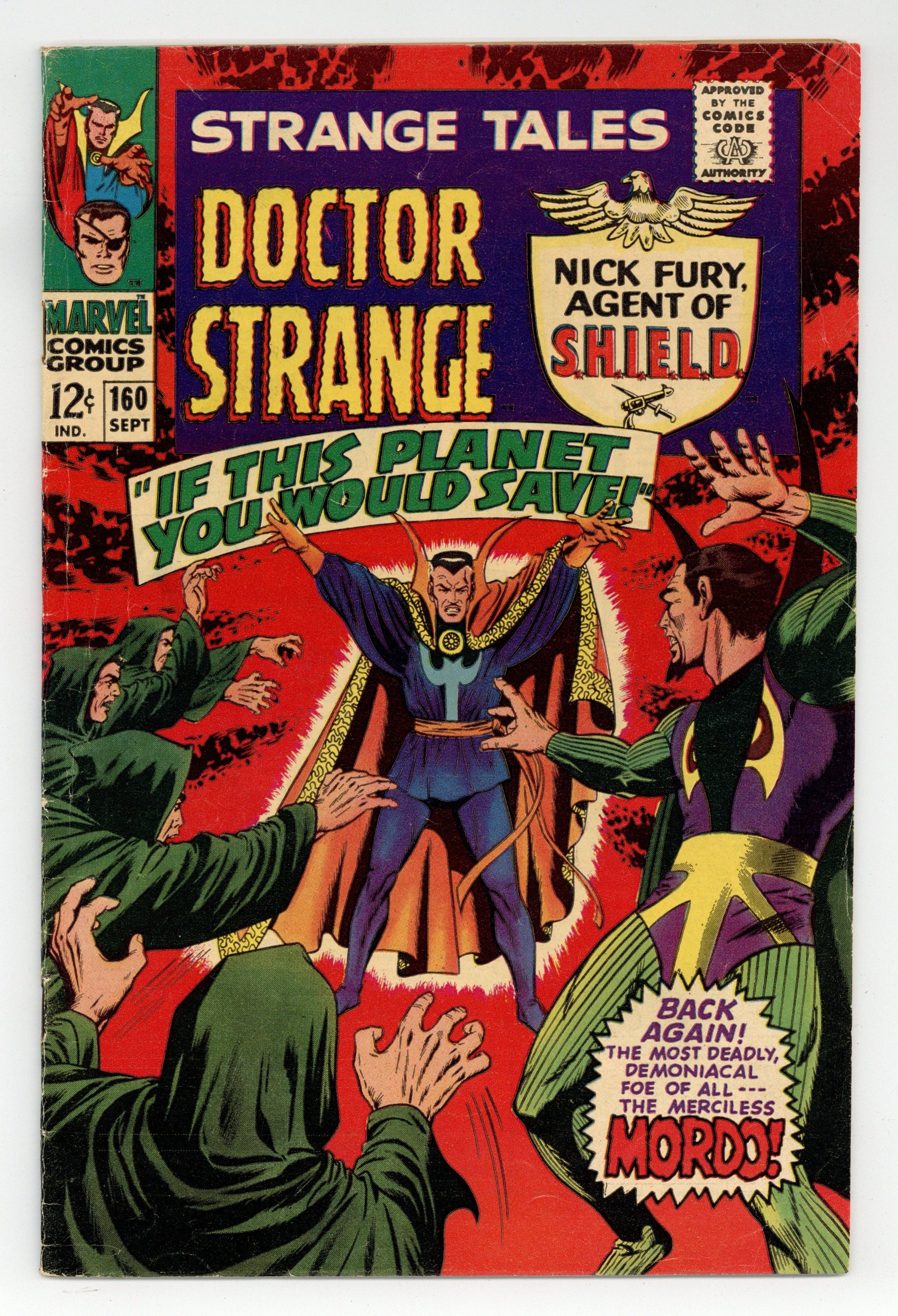 Cover art by Dan Adkins. Captain America guest stars in the Nick Fury story "Project: Blackout," script and art by Jim Steranko; Cap introduces Fury to an old friend, FBI man Jimmy Woo as Fury relates the events of November 10, 1965; The ESP Division became aware of a threat on Bedloe Island before they were killed by an explosion; Fury asked Cap for aid and the two met under the Statue of Liberty, where they found an army of invaders planning to use an "Id-Paralyzer" to turn everyone on the East Coast into mindless slaves; Cap races toward the Baxter Building for help. "If This Planet You Would Save!", script by Raymond Marais and Marie Severin (co-plot), pencils by Marie Severin, inks by Herb Trimpe; Strange is surrounded by a horde of evil mystics under the command of Baron Mordo!; Mordo refuses to listen to reason and orders his minions to kill Strange, who grabs the ring-leader and drives out the evil magic from him; He forces Mordo to see a vision of the danger menacing Earth but Mordo's first instinct is to flee for his life!; Living Tribunal cameo. Merry Marvel Marching Society info and coupon. 36 pgs., full color. Cover price $0.12.