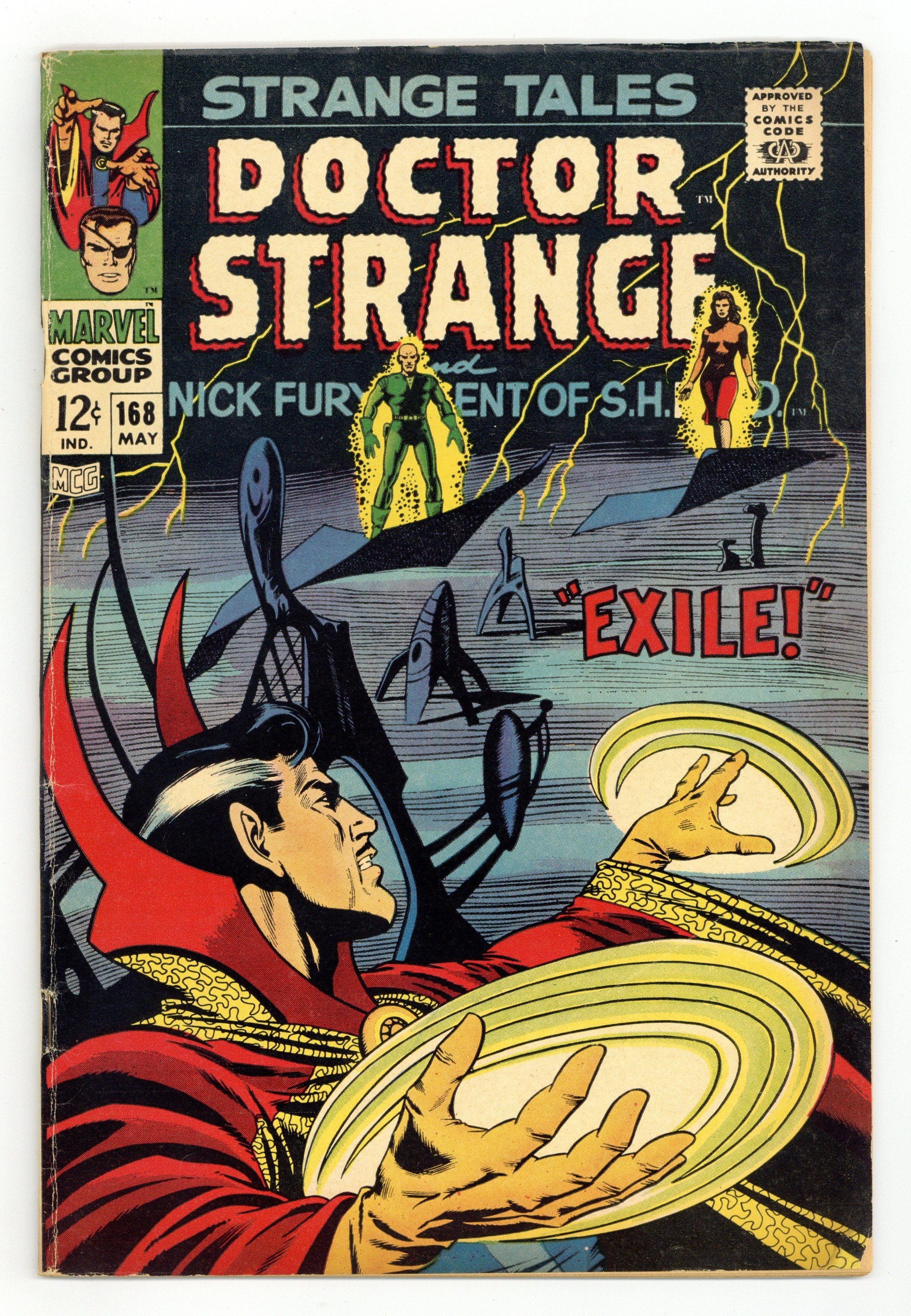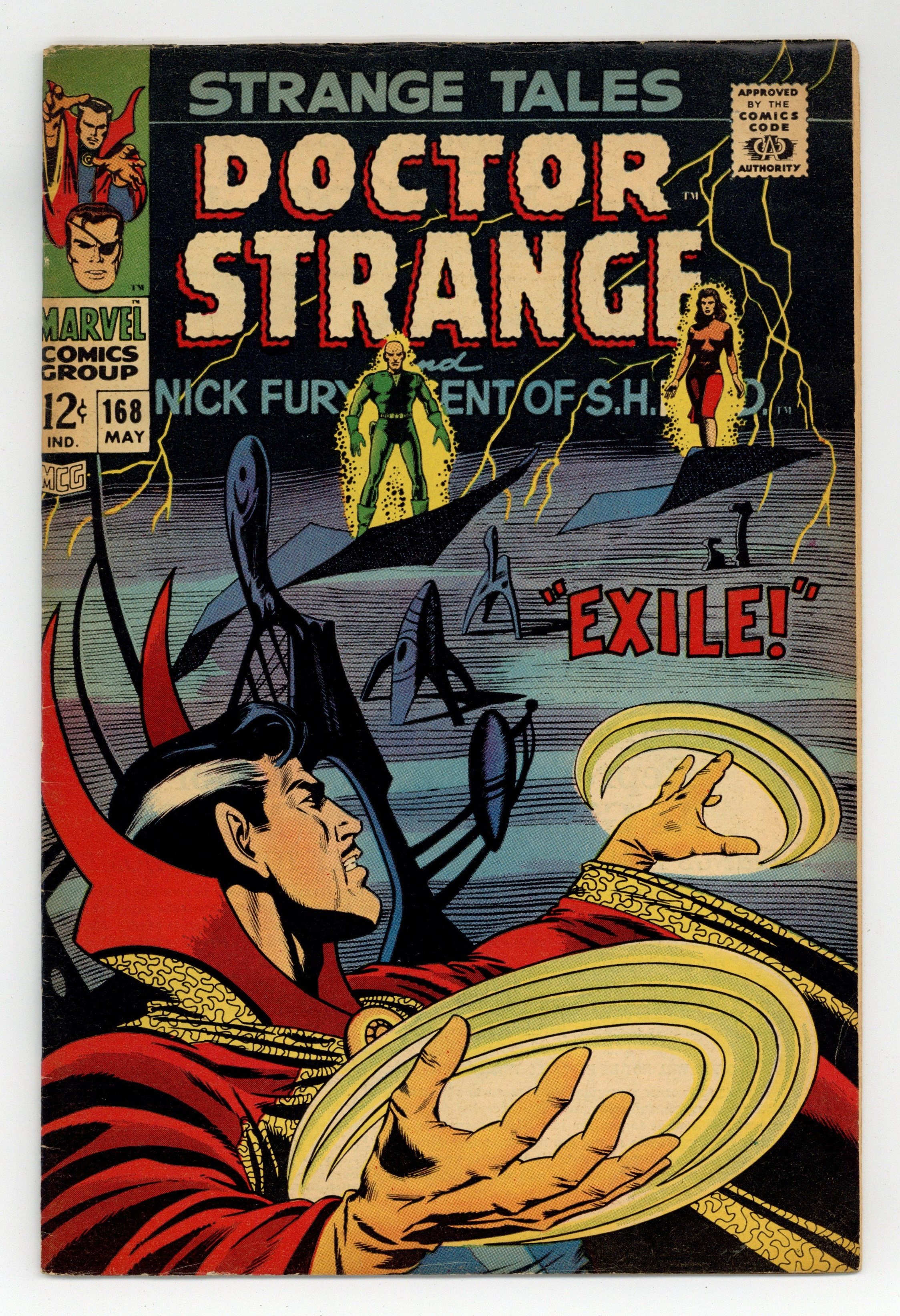 Cover art by Dan Adkins. "Exile!", script by Dennis O'Neil and Dan Adkins (co-plot), art by Dan Adkins; Yandroth's shot sends Strange plunging into the abyss, but the Ancient One uses the Trans-Hypnotic Jewel to stop his fall; Strange uses his Cloak of Levitation to grab Yandroth, but sees the Viking women about to kill Victoria; To save her, he releases his grip on Yandroth, sending him plummeting through the Dimension of Dreams, where he will eventually become nothing more than a dream himself. The series continues in Nick Fury, Agent of SHIELD 1 (1968). Nick Fury stars in "Today Earth Died!", script and pencils by Jim Steranko, inks by Joe Sinnott; As Fury begins to doze off in his office he gets a call from Val about a UFO. Landing in mid-town Manhattan a news crew and crowds gather to observe the emergence of an alien named Vaengr; He offers them The Prism Of Miracles which will banish hatred, crime, war and violence; Fury, Val & Dugan search the spaceship and discover Vaengr is not what he seems. The series continues with Doctor Strange 169. 36 pgs., full color. Cover price $0.12.