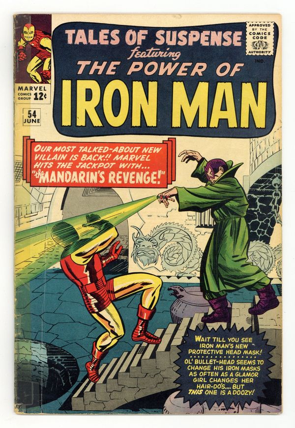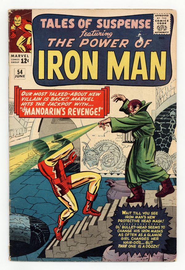 Starts Feb 2 Cover pencils by Jack Kirby, inks by Chic Stone. Iron Man's costume gets a slight re-design in "The Mandarin's Revenge!", script by Stan Lee, art by Don Heck; Tony's observer missiles have failed in Vietnam; So, he goes to investigate, which leads him to the Mandarin; He attacks the Mandarin's castle, but he is captured. "Secret Mission" text story. "Skrang Strikes Tonight!", script by Stan Lee (plot) and Larry Lieber (script), pencils by Larry Lieber, inks by Dick Ayers; An invincible alien invader has weapons that can disable all Earth's armed forces, but he is frightened off when he sees an old lady's fox-fur collar. "Hands Off!", script by Stan Lee (plot) and Larry Lieber (script), pencils by Larry Lieber, inks by Chic Stone; The Watcher is tempted to break his vow of non-interference, but sees that it is for the best to obey. 36 pages, full color. Cover price $0.12.