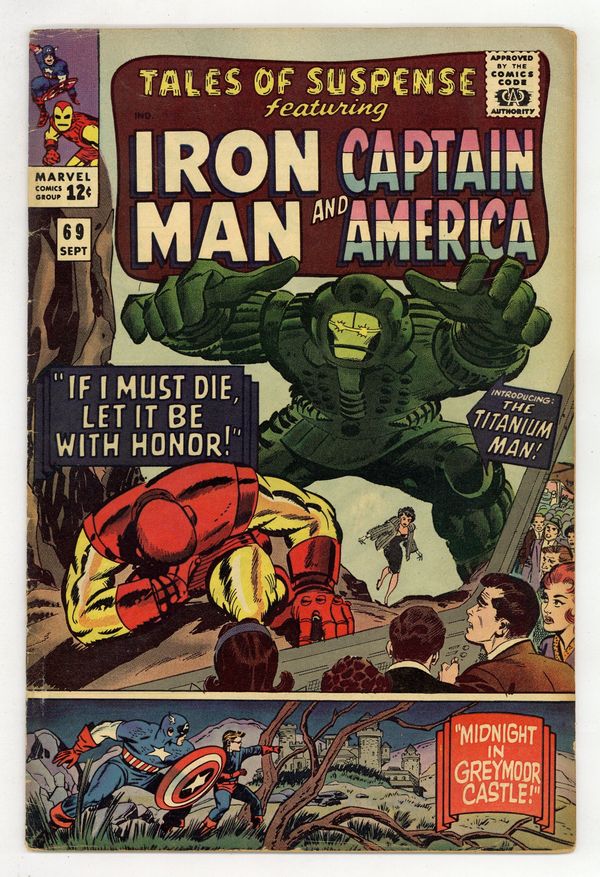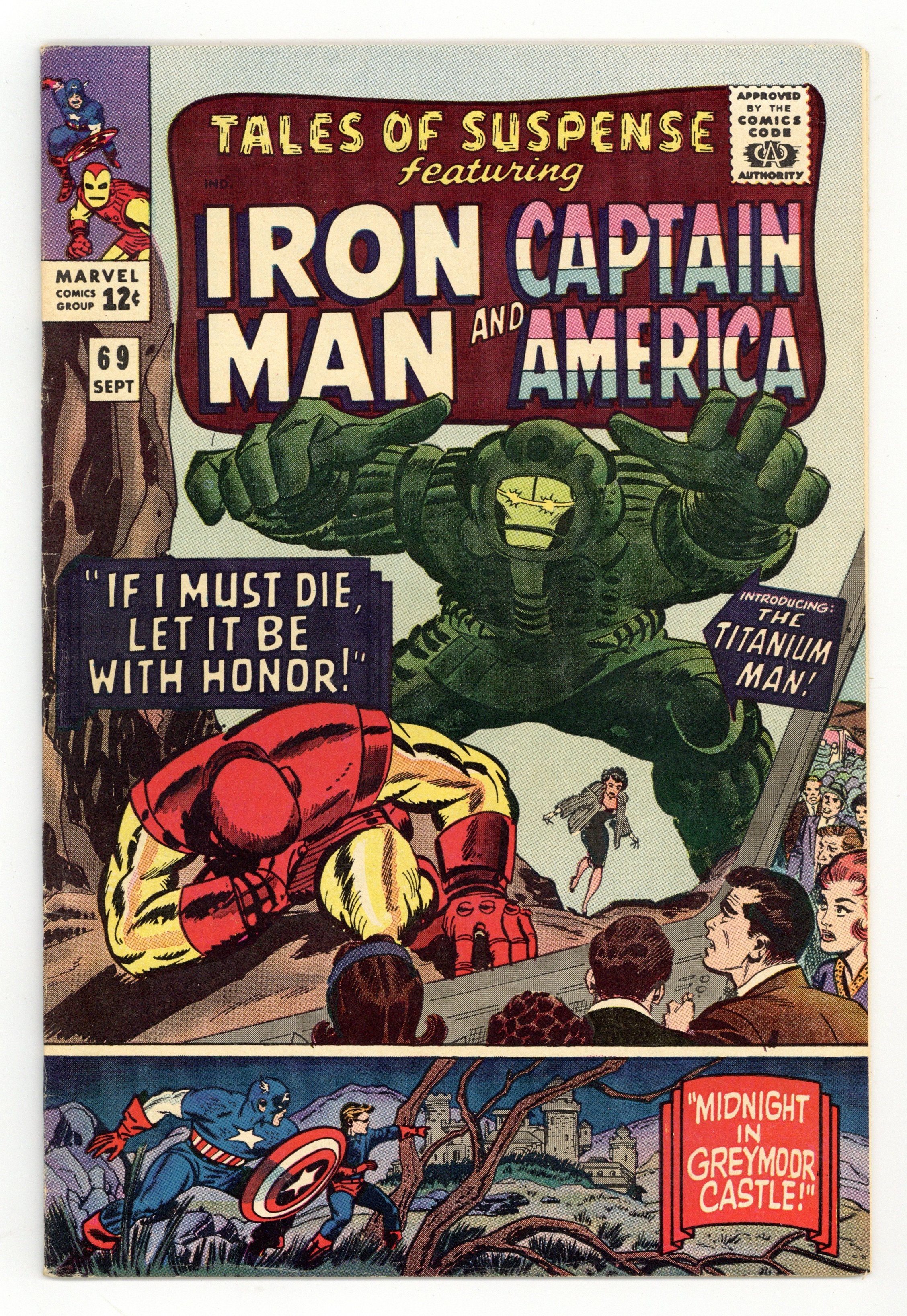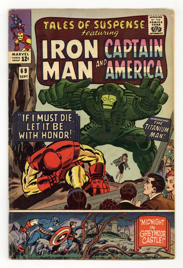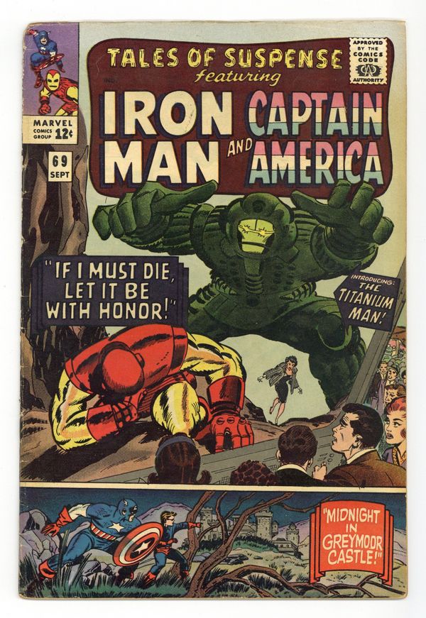 Tags: Marvel Legacy Numbering: Captain America (part 69), Marvel Legacy Numbering: Tales of Suspense (part 69), Captain America, Iron Man$19.00Cover pencils by Jack Kirby, inks by Don Heck and Mike Esposito (bottom tier only). "If I Must Die, Let It Be With Honor!", script by Stan Lee, pencils by Don Heck, inks by Vince Colletta; Communist camp commander Boris Bullski wants to take on Iron Man and releases one of his prisoners to construct an armor, making him Titanium Man. "Midnight In Greymoor Castle!", script by Stan Lee, pencils by Jack Kirby (layouts) and Dick Ayers, inks by Dick Ayers; Nazi scientist Dr. Rawlings plots against Cap and Bucky, despite his sister Celia's entreaties. 36 pages, full color. Cover price $0.12.