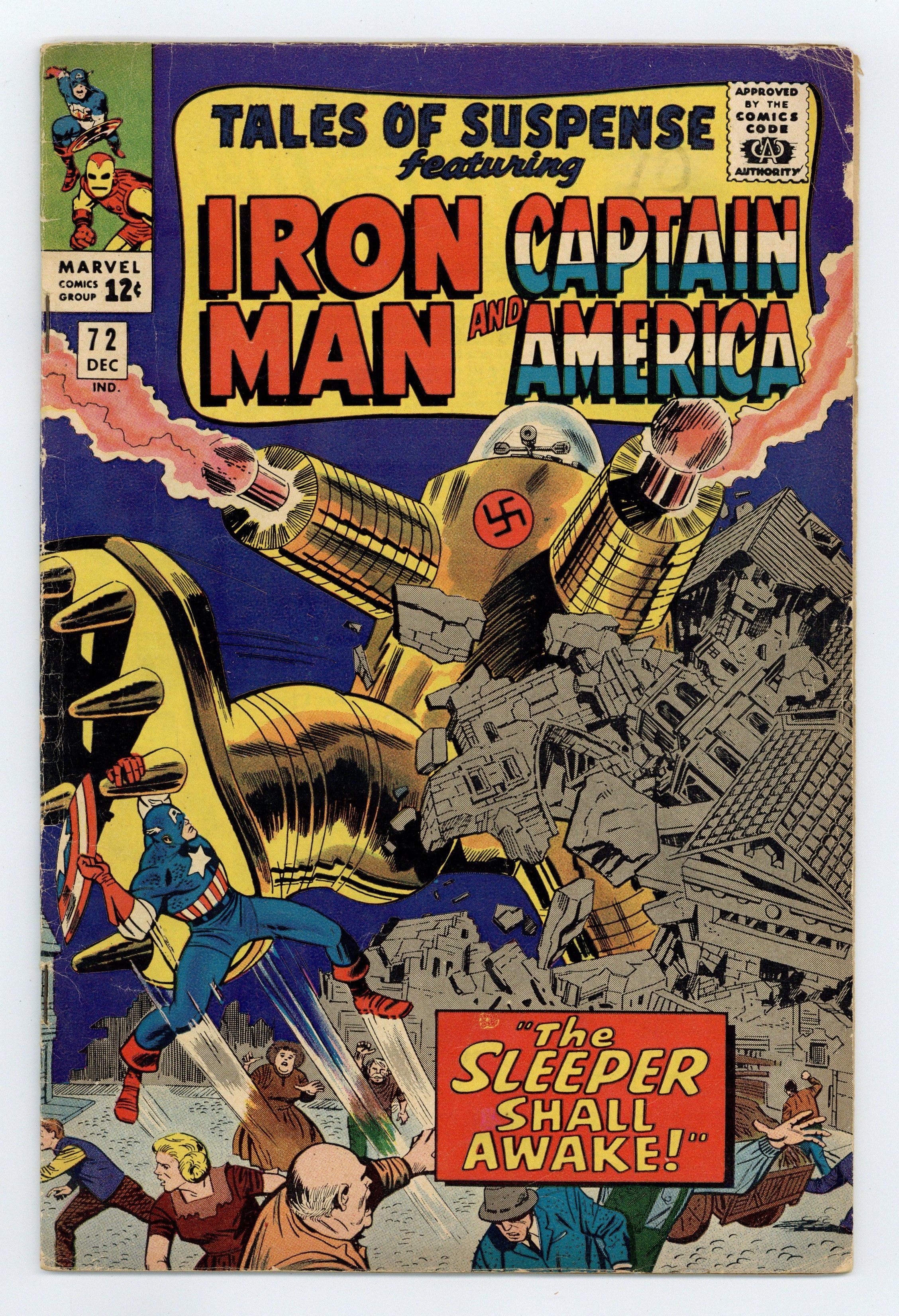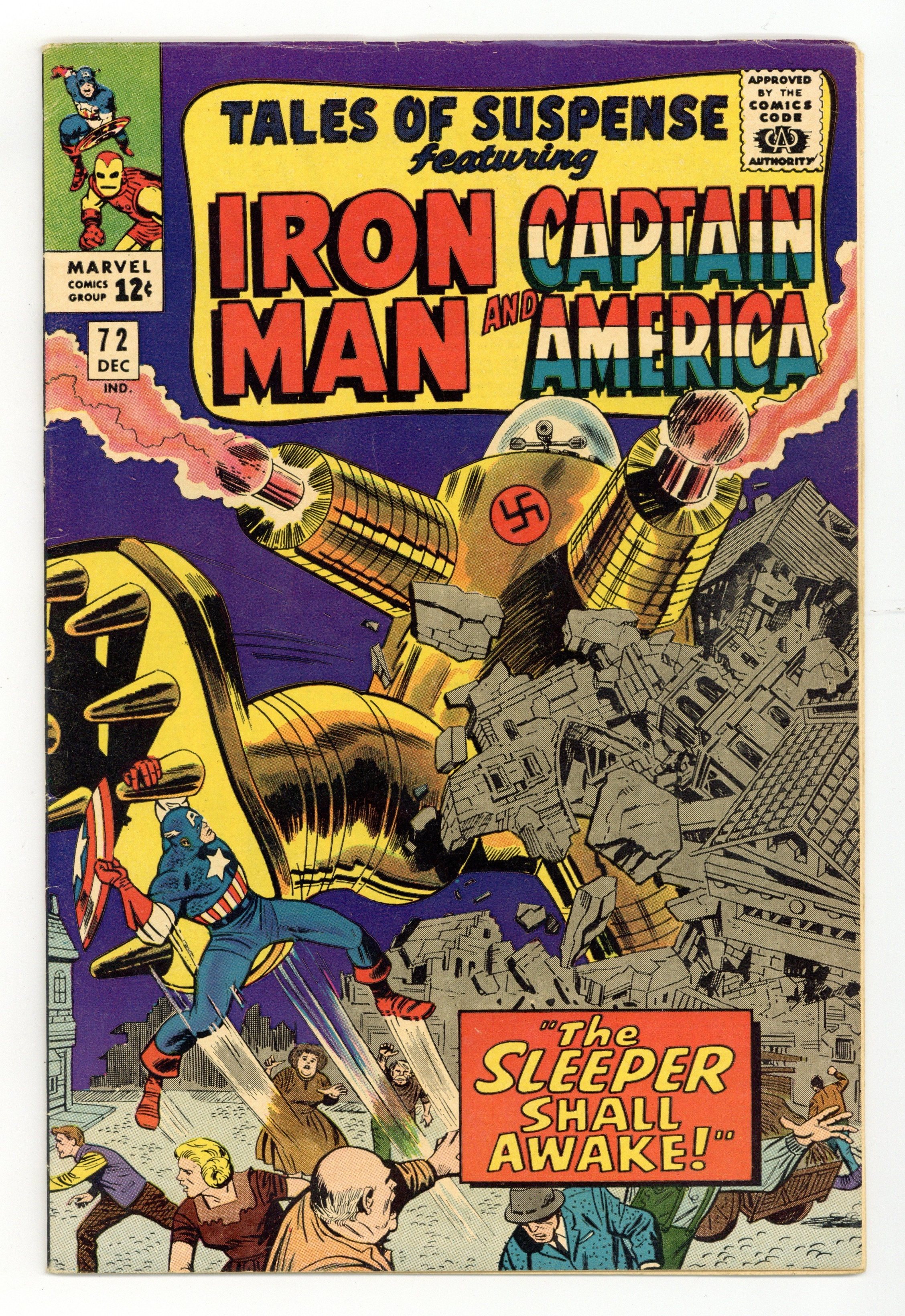 Cover pencils by Jack Kirby, inks by Mike Esposito. "Hoorah for the Conquering Hero!", script by Stan Lee, pencils by Don Heck, inks by Mike Esposito (as Mickey Demeo); Returning to America following his battle against the Titanium Man, Iron Man begins to worry over the fate of his bodyguard Happy Hogan, who was critically injured in that battle. "The Sleeper Shall Awake!", script by Stan Lee, pencils by Jack Kirby (layouts) and George Tuska (pencils), inks by Wally Wood (pages 1-4 uncredited) and George Tuska (pages 5-7) (pages 8-10 uncredited); Captain America goes after the Sleepers, sleeper agents planted by the Red Skull who were to activate the Sleeper robots 20 years after the War; Guest appearances by the Red Skull, the Scarlet Witch, Hawkeye, and Quicksilver. 36 pages, full color. Cover price $0.12.