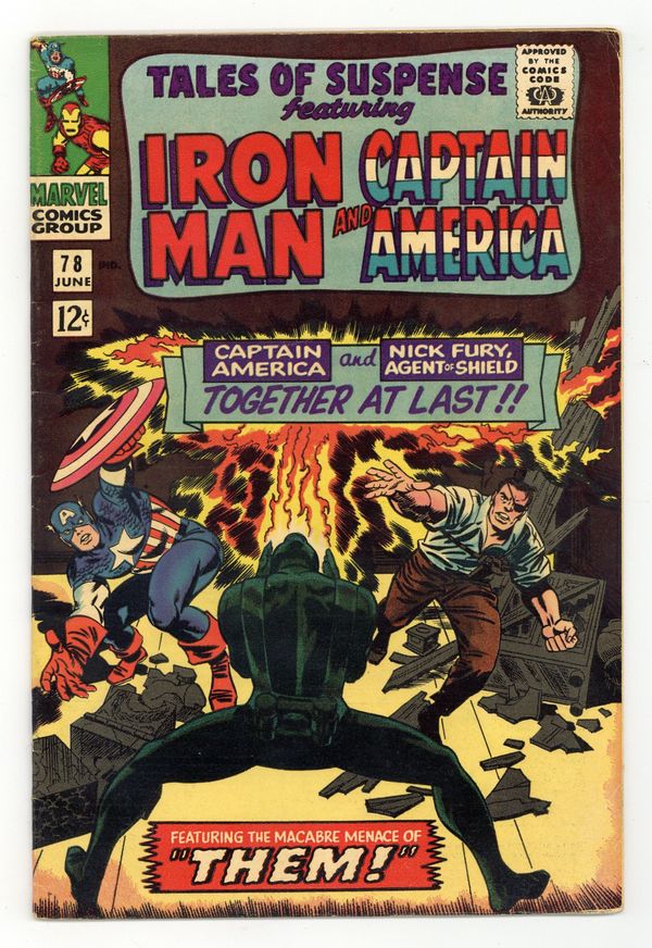 Tags: Marvel Legacy Numbering: Captain America (part 78), Marvel Legacy Numbering: Tales of Suspense (part 78), Captain America, Iron Man$16.75Cover pencils by Jack Kirby, inks by Frank Giacoia. "Crescendo!", script by Gene Colan (co-plot) and Stan Lee (co-plot, dialogue), pencils by Gene Colan, inks by Jack Abel (as Gary Michaels); Iron Man defeats Ultimo by tricking the monstrous android into setting off a long-dormant volcano; The Mandarin believes Tony Stark is dead, and vows Ultimo will live again; Shellhead steals a Commie jet and narrowly avoids getting shot down by US fighters. "Them!", script by Jack Kirby (plot) and Stan Lee (co-plot, dialogue), pencils by Jack Kirby, inks by Frank Giacoia; While Cap is in the middle of a training exercise involving flying "shock rollers," he's surprised to see Nick Fury turn up looking for info on a secret organization known only as "THEM"; As they talk, a strange flying craft lands outside Avengers Mansion, and a large, deadly "chemical android" attacks. 36 pages, full color. Cover price $0.12.
