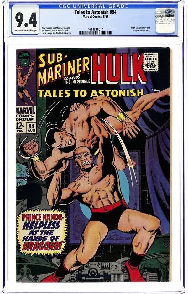 $15.00Cover by Dan Adkins. Helpless, at the Hands of Dragorr!, script by Roy Thomas, art by Bill Everett; As Namor plans his assault against the surface world, he is contacted by Dragorr, ruler of a small island, and invited to join him in conquering the world; Namor feels insulted by the surface man's affronity and decides to visit his island to teach him a lesson; Instead, he ends up being captured and forced to do Dragorr's bidding; It is only the timely intervention of the Lady Dorma that frees him and reveals the fact that Dragorr is a robot being run by the diminutive Gnome. To the Beckoning Stars!, script by Stan Lee, art by Marie Severin and Herb Trimpe; The High Evolutionary finds himself beseiged on the planet of Wundagore II as his New Men revert to their bestial natures and attack; Thinking the Hulk may be just the help he needs to face his out of control creations, the Evolutionary has him captured and transported to his world. 36 pgs., full color. $0.12. Cover price $0.12.
