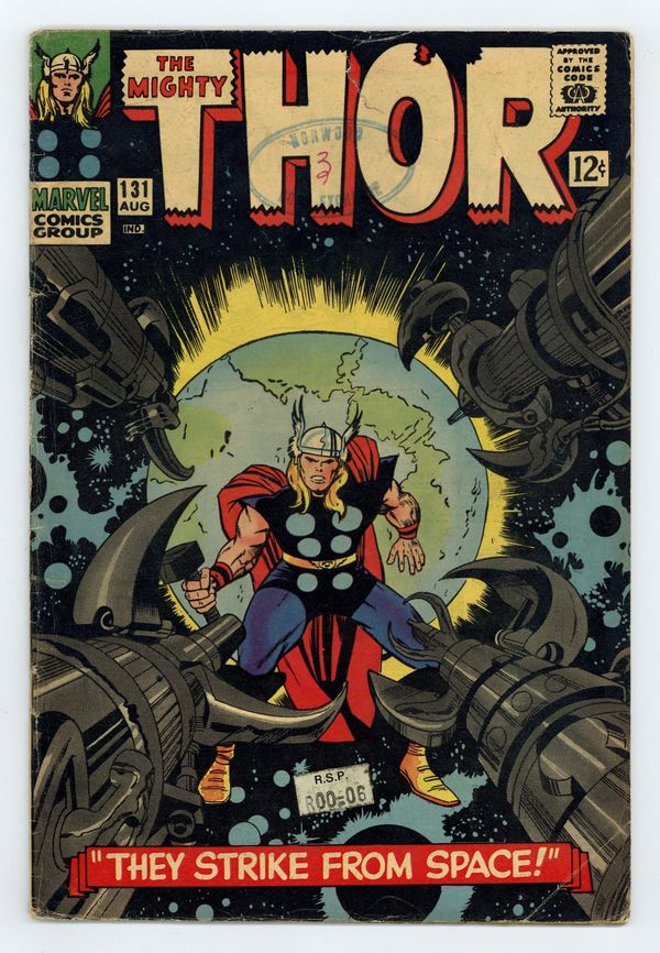 Tags: Marvel Legacy Numbering: Thor (part 131), Thor$15.50Cover pencils by Jack Kirby, inks by Vince Colletta. "They Strike From Space!", script by Stan Lee, pencils by Jack Kirby, inks by Vince Colletta; Tana Nile stakes a claim on Earth; Thor starts to fight towards Rigel to rescue Earth. Appearances by Jane Foster and Odin. The M.M.M.S. Still Wants You! ad. Marvel Bullpen Bulletins. Tale of Asgard: "The Warlock's Eye!", script by Stan Lee, pencils by Jack Kirby, inks by Vince Colletta; Thor impersonates Harokin in order to get the Warlock's Eye. Ad for Thing Sweat Shirt and Hulk Sweat Shirt. Ad for Marvel Comics Group Official Swingin' Stationery, Thor T-Shirt, and Spider-Man Poster. Letter to the editor from comics artist Peter Von Sholly. 36 pgs., full color. $0.12. Cover price $0.12.