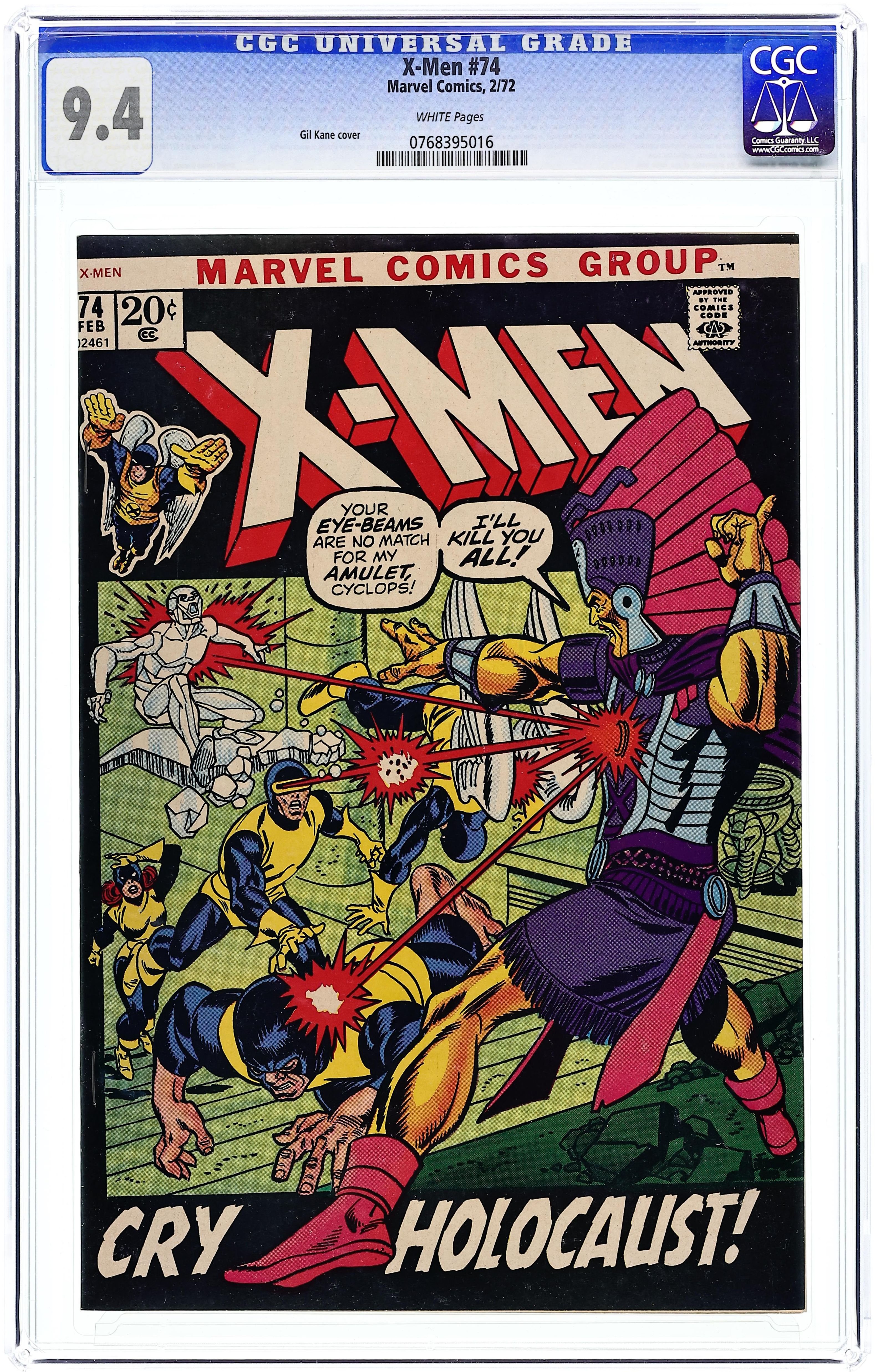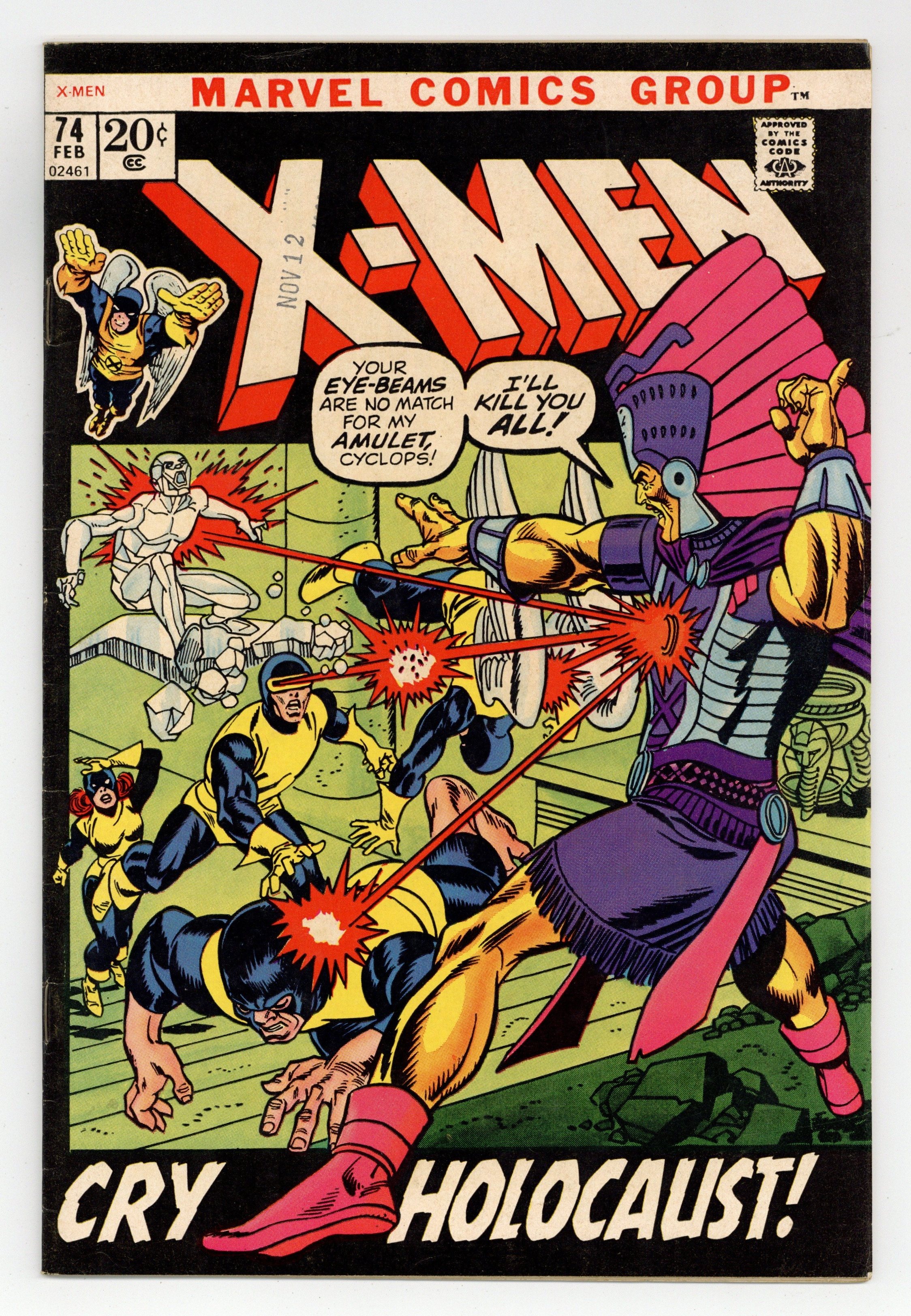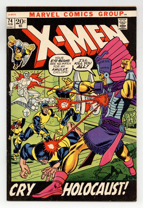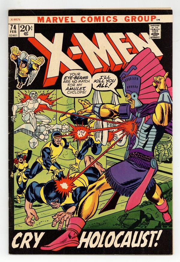 Cover pencils by Gil Kane, inks by Frank Giacoia. Holocaust, script by Roy Thomas, pencils by Werner Roth, inks by Dick Ayers; the X-Men (sans Marvel Girl) battle Kukulcan; Cyclops accidentally hits Angel with an optic blast. A Marvel Masterwork Pin-Up of Professor X, Cyclops, Jean Grey, Iceman, Angel, and Beast, pencils by Jack Kirby; ; reprinted from issue 26.. 36 pgs. $0.20. Cover price $0.20.