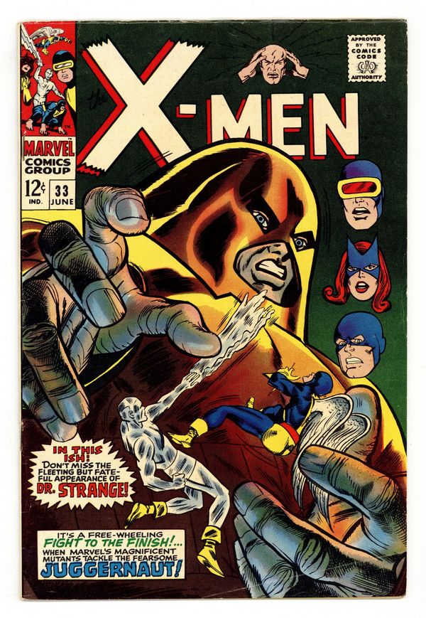 Cover pencils by Gil Kane, John Romita, and Werner Roth, inks by Gil Kane and John Romita; Juggernaut rampages to Factor Three headquarters; Professor X shows Jean a story about the ruby of Crimson Bands; Cameos by Doctor Strange and the Ancient One. Ad for the Merry Marvel Marching Society. 36 pgs. $0.12. Cover price $0.12.